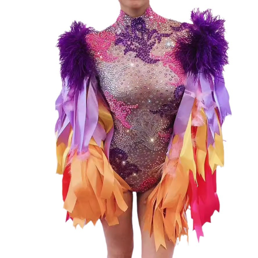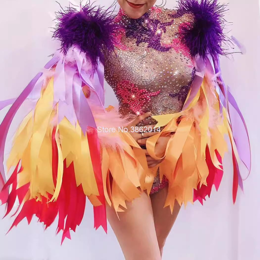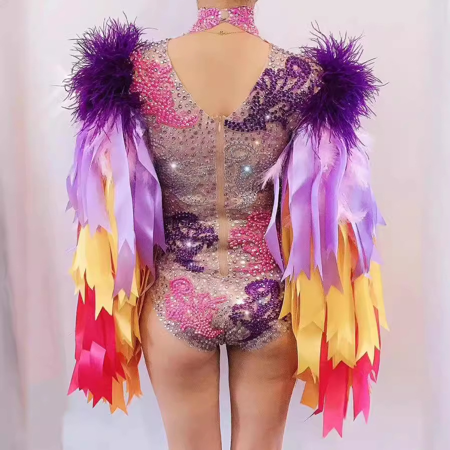 Amazon горячая Распродажа певица танец сексуальный блестящий Бриллиантовая лента перо стрейч комбинезон костюм для выступлений для женщин