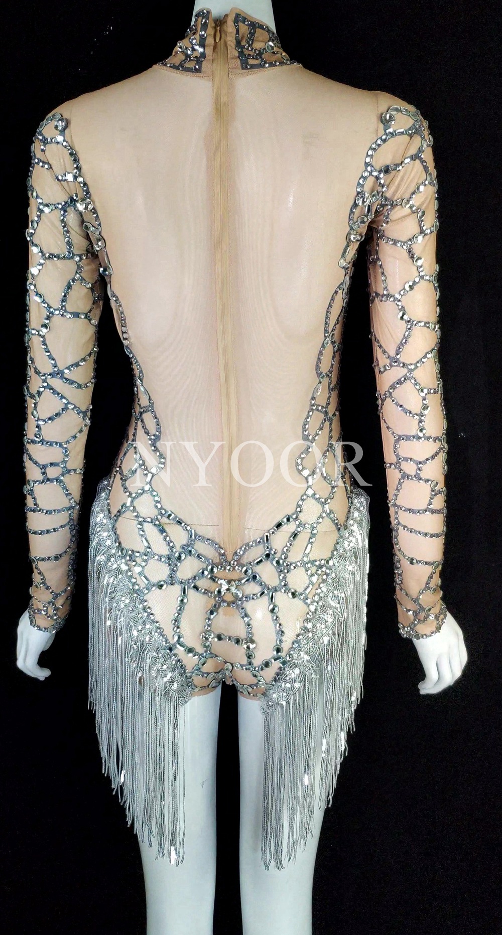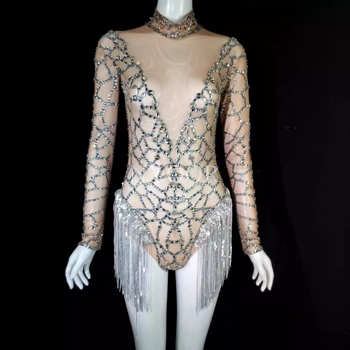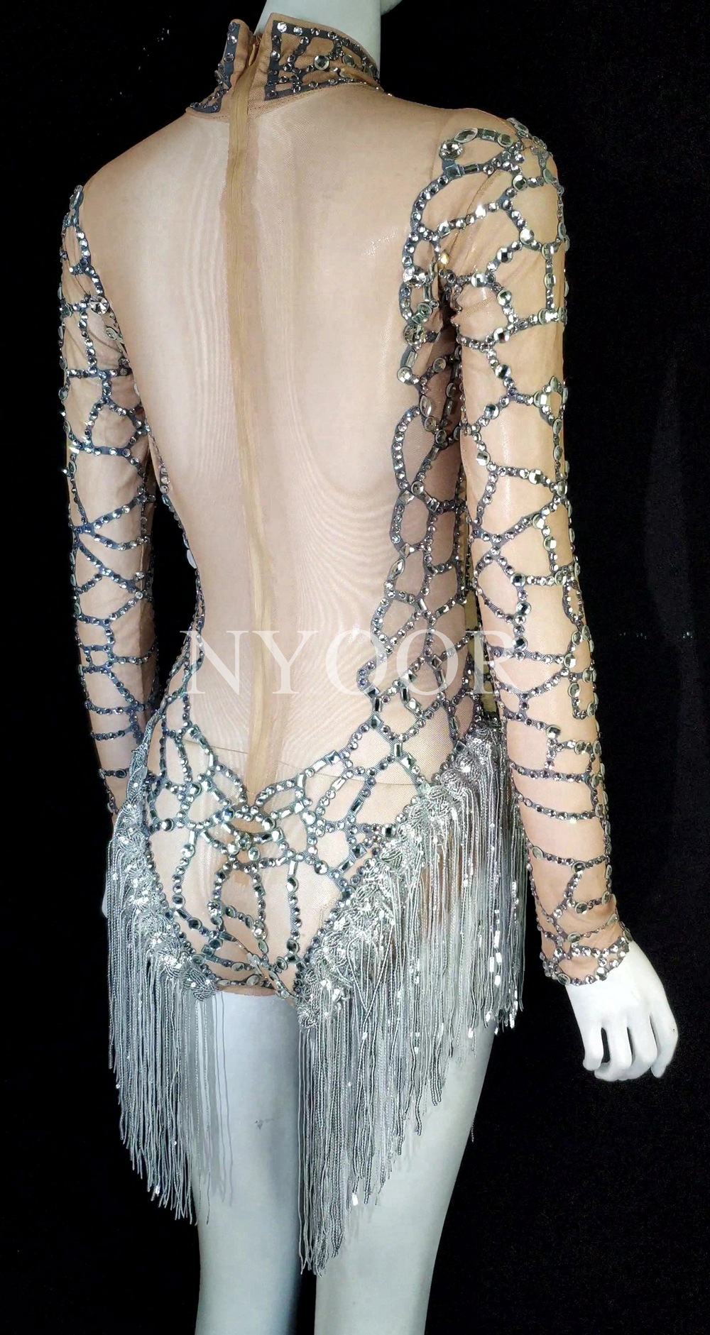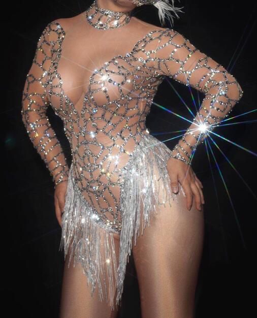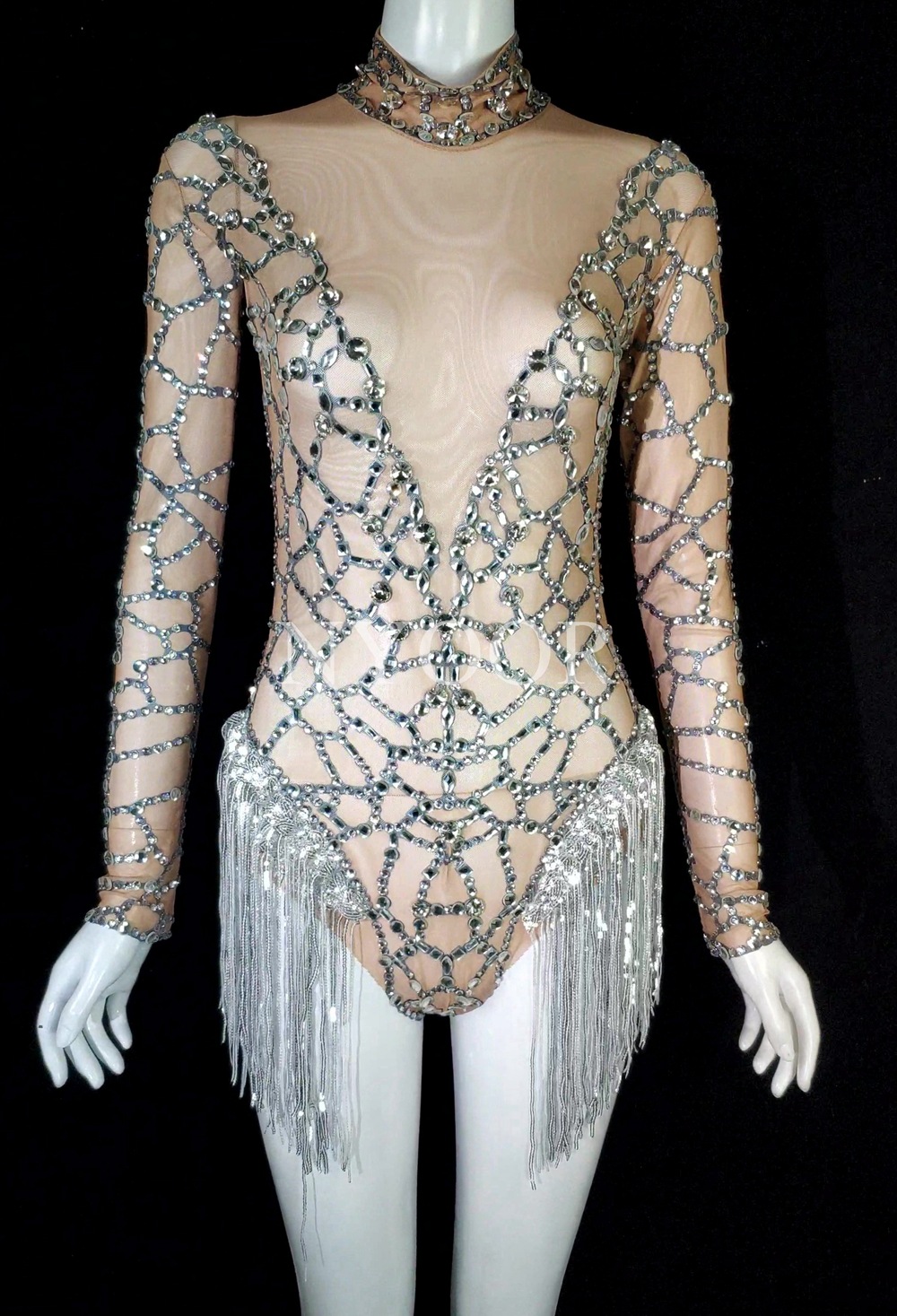 Сценический костюм для выступлений: сексуальный прозрачный комбинезон с пайетками, стразами и бахромой, вышитый стразами, для женщин