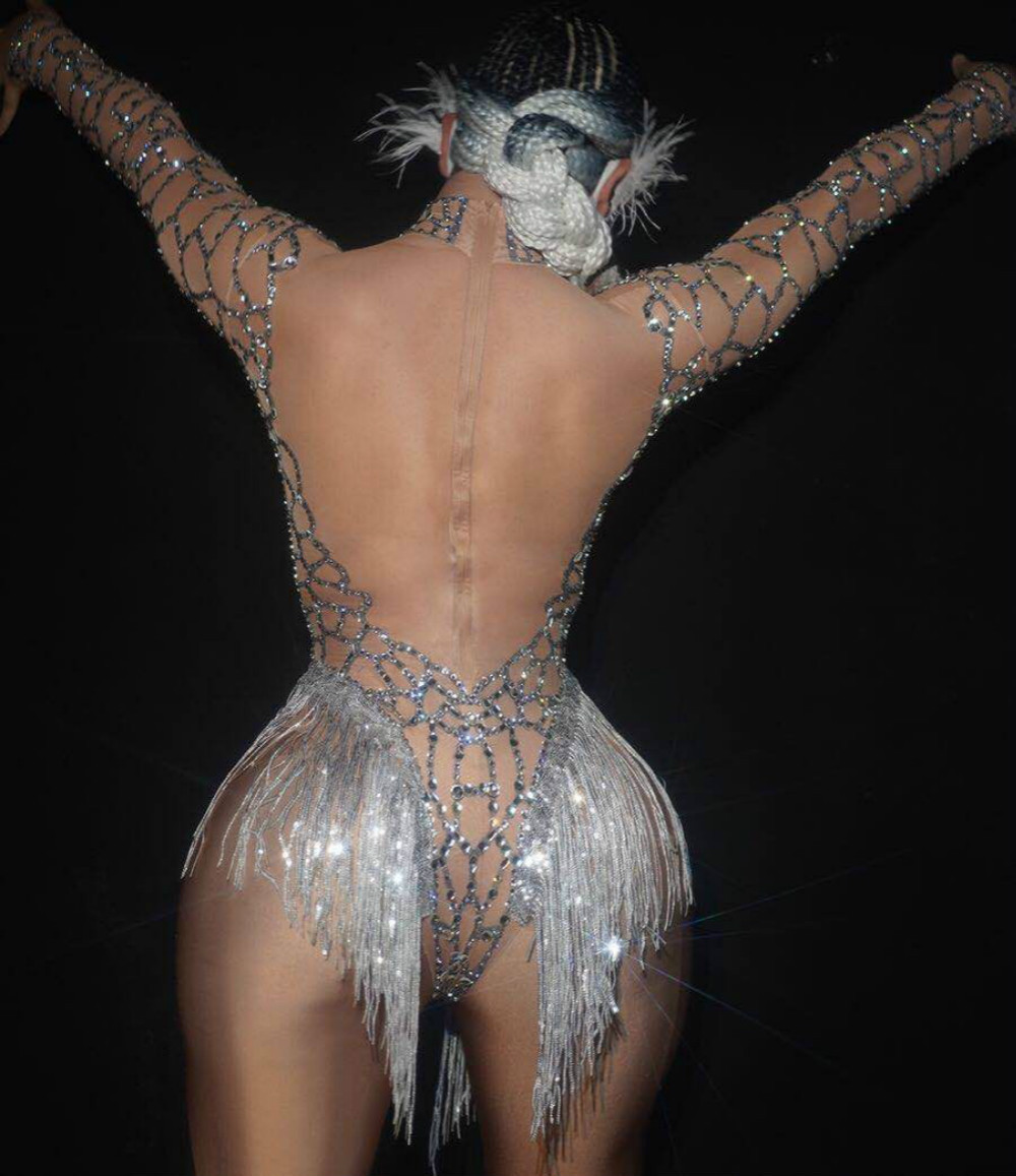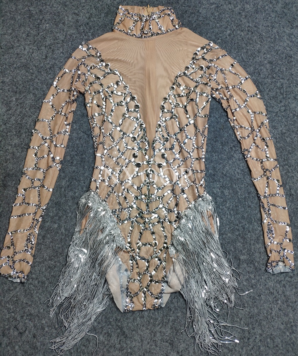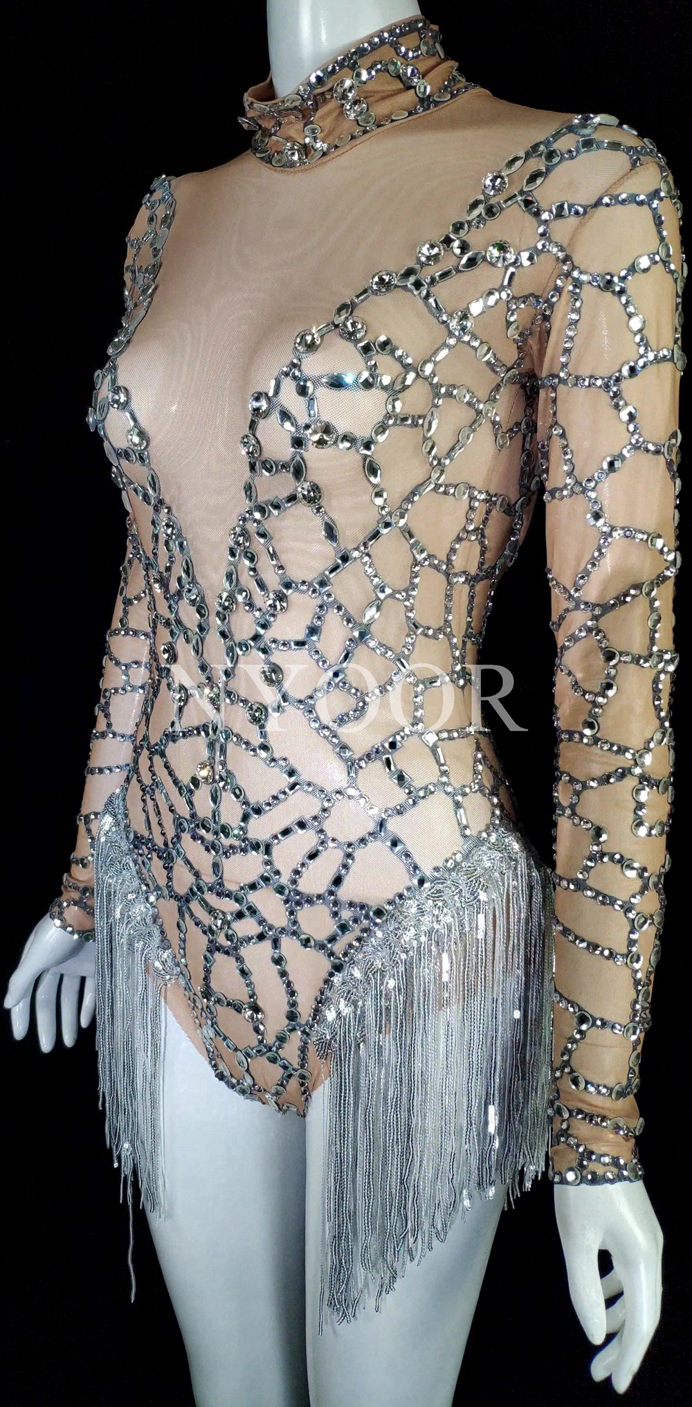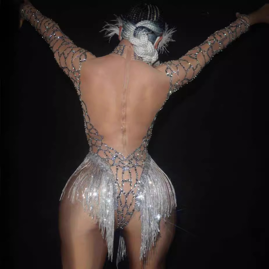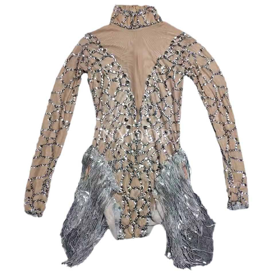 Сценический костюм для выступлений: сексуальный прозрачный комбинезон с пайетками, стразами и бахромой, вышитый стразами, для женщин