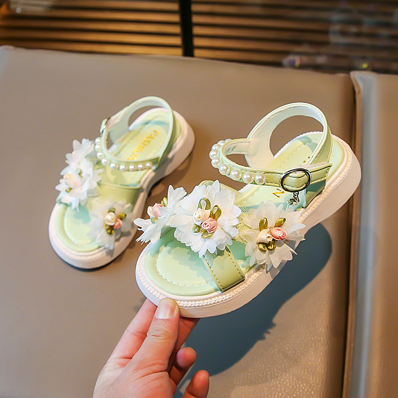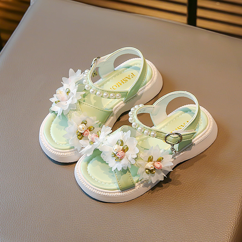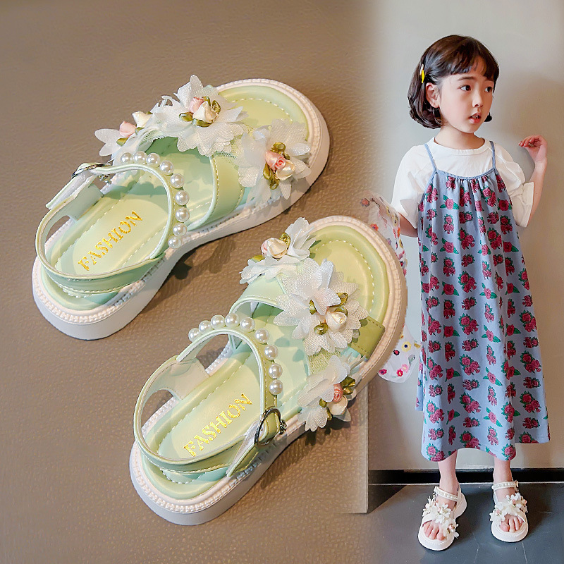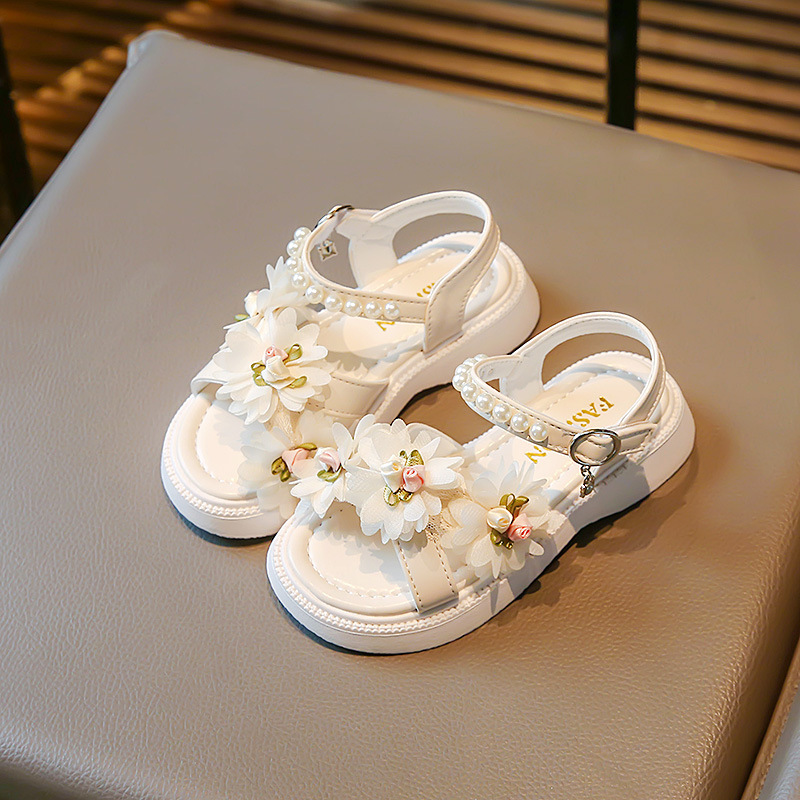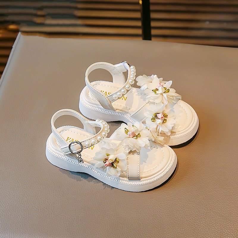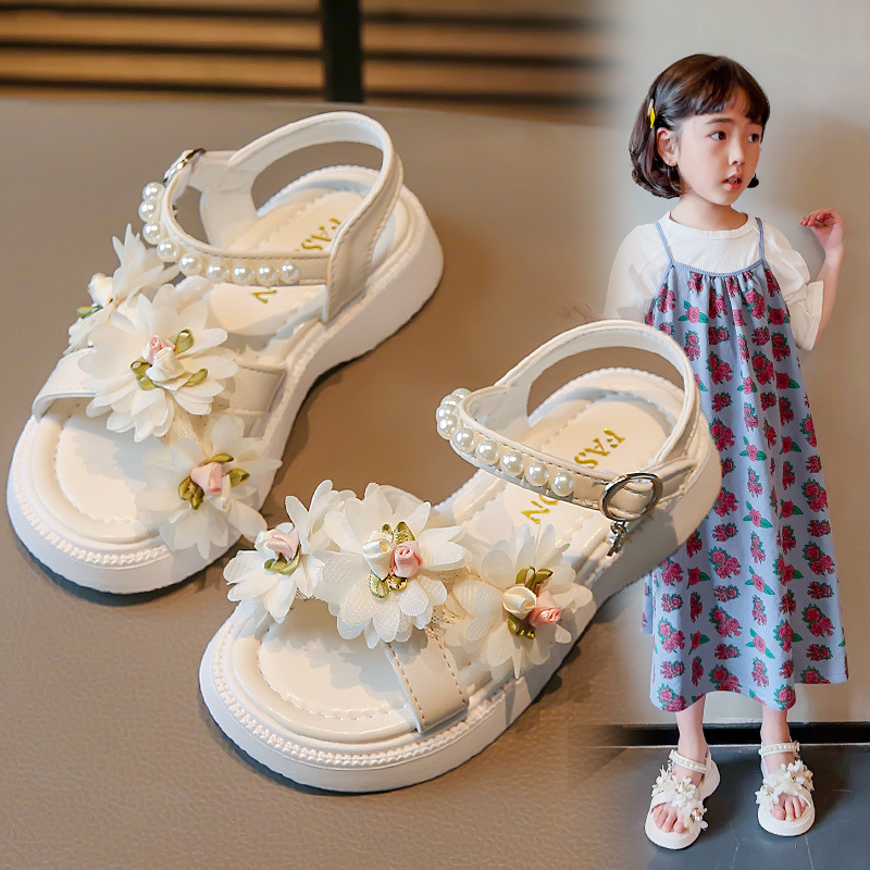 Сандалии для девочек 2023, летняя новая детская обувь принцессы с жемчужным цветком, нескользящая обувь для маленьких девочек, среднего и большого возраста