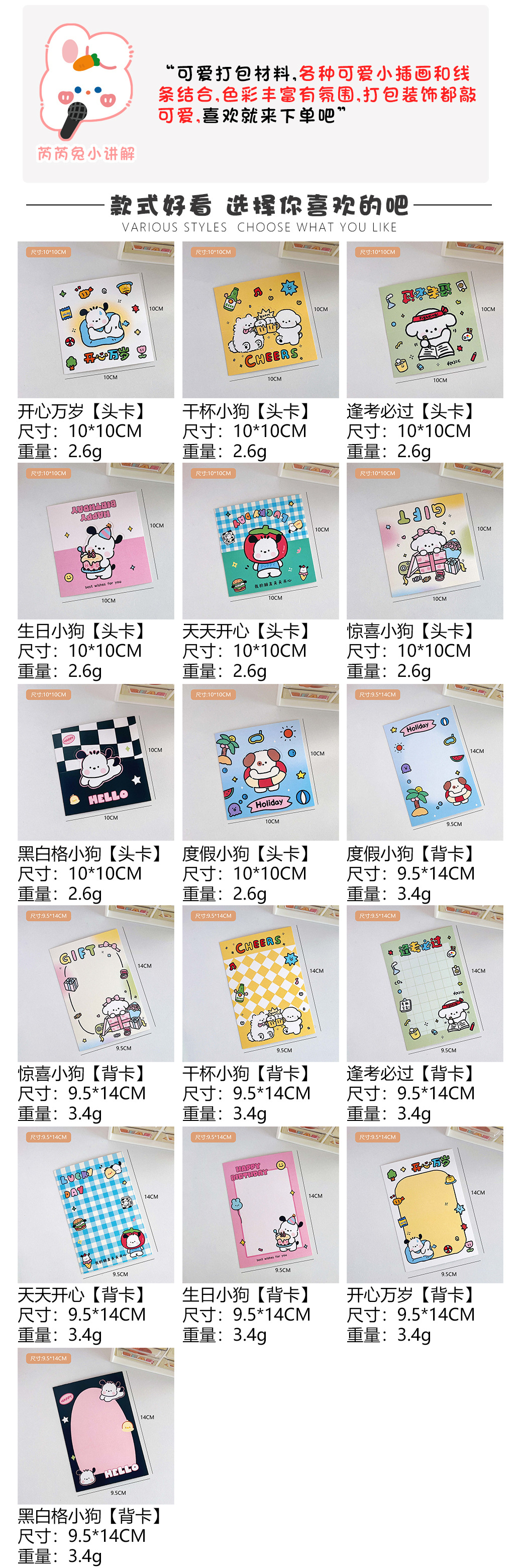 1#Да здравствует счастье [главная карта]; 3#Привет, щенок [карта головы]; 4#Должен сдать каждый экзамен [карточка руководителя]; 5#Песенка на день рождения [карточка с головой]; 6#Сюрпризный щенок [Карточка с головой]; 9#Да здравствует счастье [обратная сторона карты]; 11#Привет, щенок [обратная сторона карты]; 14#Сюрпризный щенок [обратная сторона карты]; 17#мешок опп х2; 5#Вечеринка по случаю дня рождения - Чужой [Голова карты]; 7#Гамбургер-щенок-чужой [Карточная голова]; 8#Торт-щенок - инопланетянин [Карточная голова]; 14#Гамбургер-щенок [обратная сторона карты]; Белая сумка в горошек (10 штук в упаковке); Сумка «Белая звезда» (10 шт.); Сумка «Розовая звезда» (10 шт.); Сумка «Синяя звезда» (10 шт.); Белая сумка в горошек (50 шт.); Сумки «Белая звезда» (50 шт.); Сумка «Синяя звезда» (50 шт.); Сумка «Розовая звезда» (50 штук в упаковке); 17#Прозрачный карман для карт 9,9*15см.