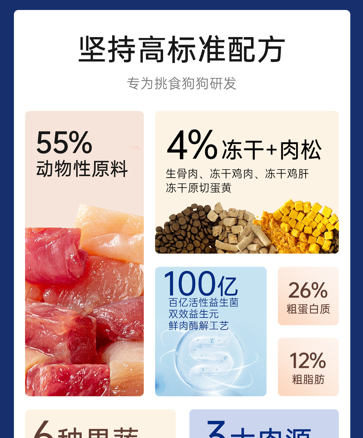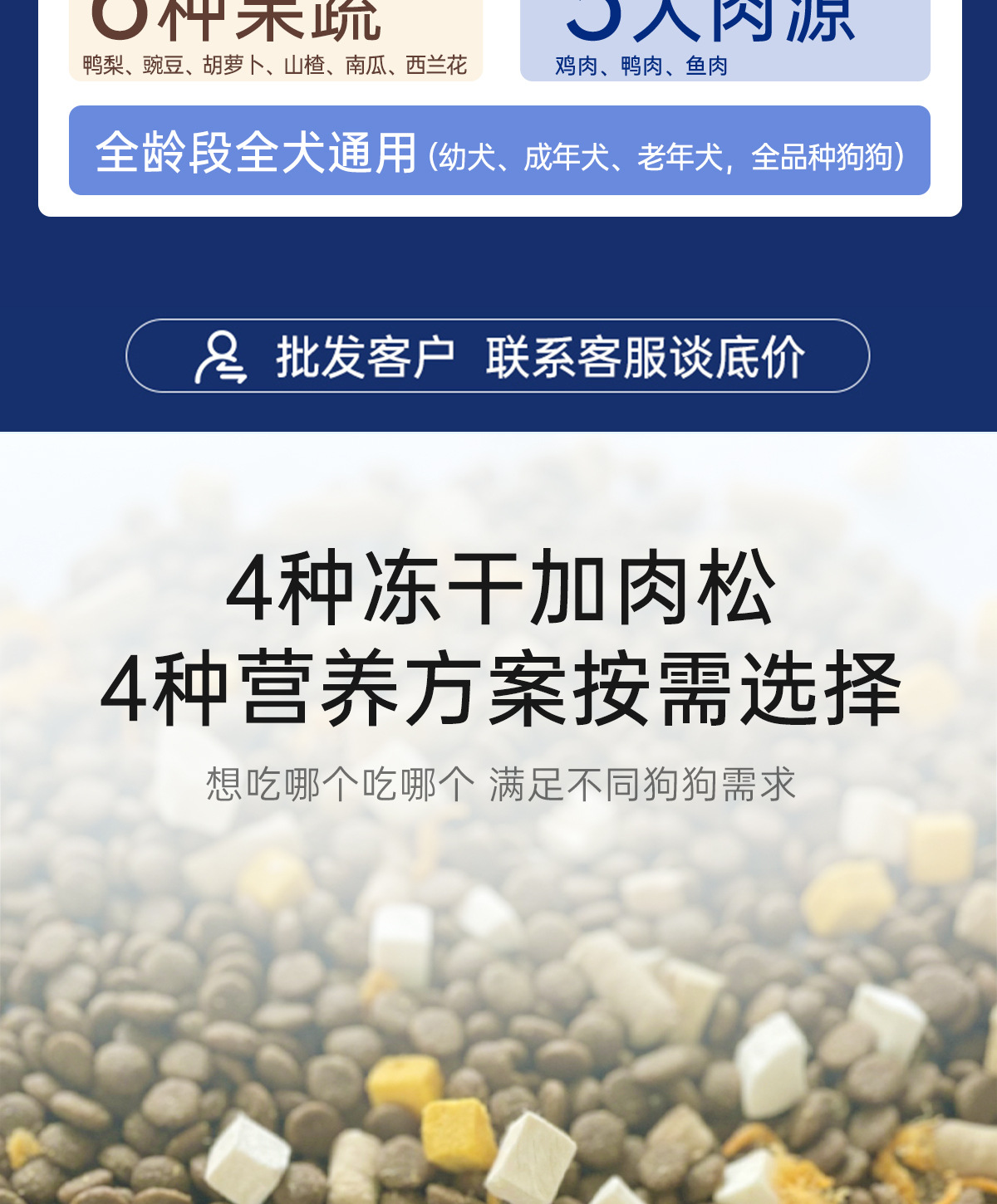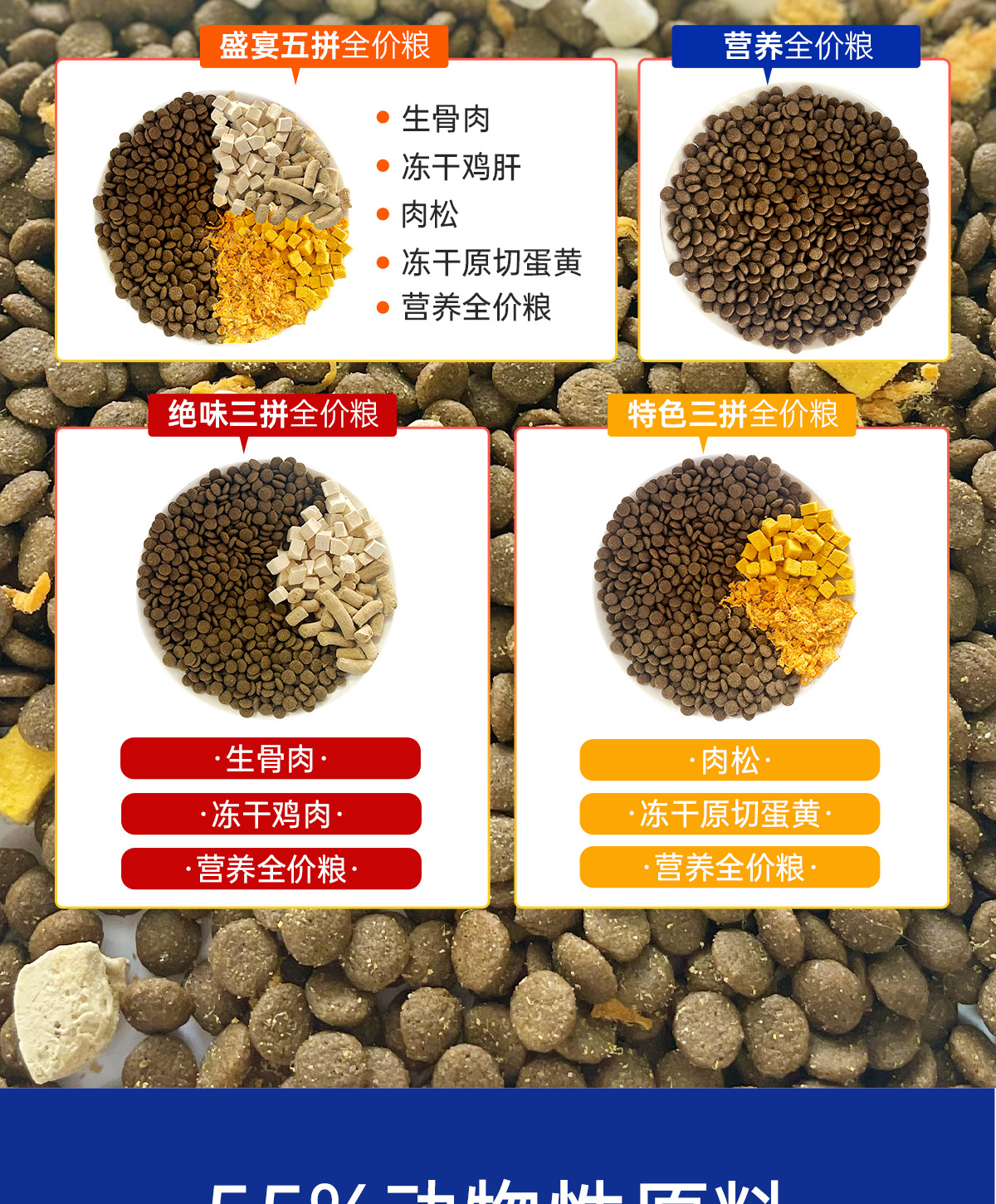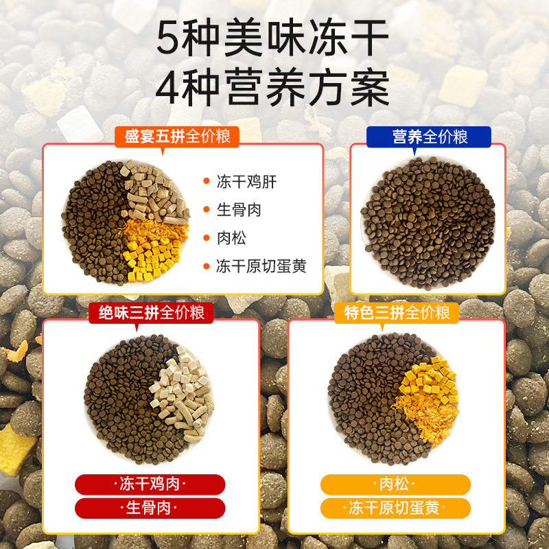 Рекомендуемое трехкомпонентное блюдо (шерстка свинины + яичный желток + ферментативная еда); Цзюэ Вэй Сан Пин (Сырой костяной корм + Мясо + Курица + Энзимно расщепленные зерна); Пир Wupin (мясная нитка, яичный желток, сырые кости, куриная печень, корм); Полный пищевой корм для собак с пробиотиками