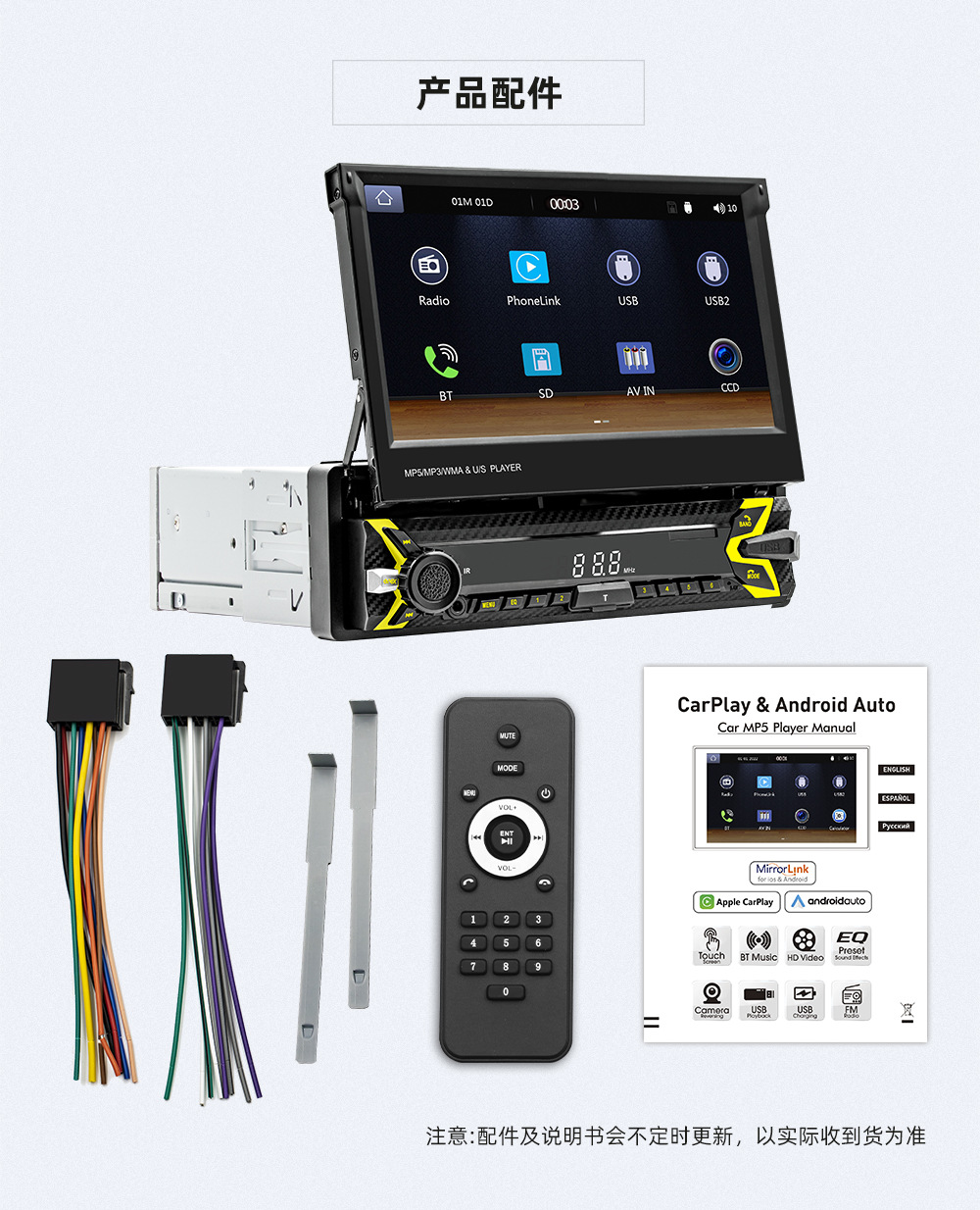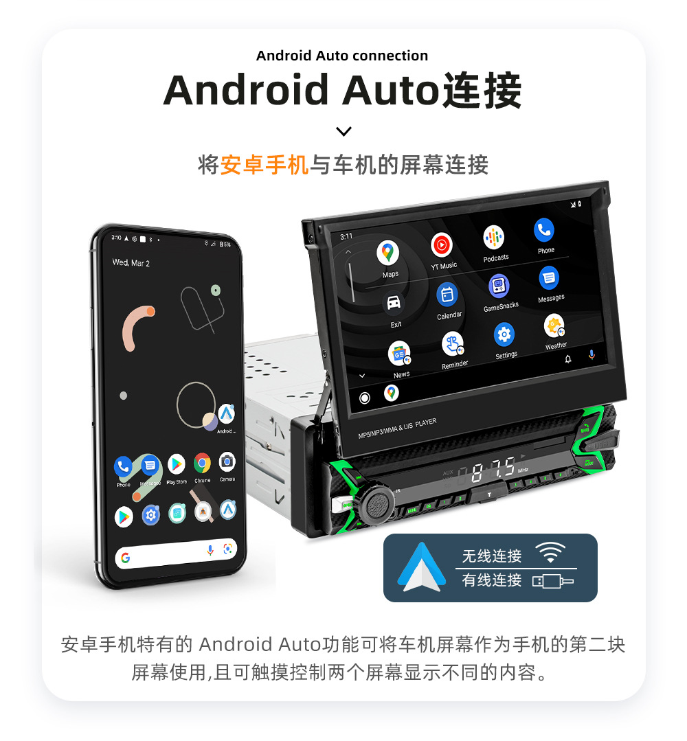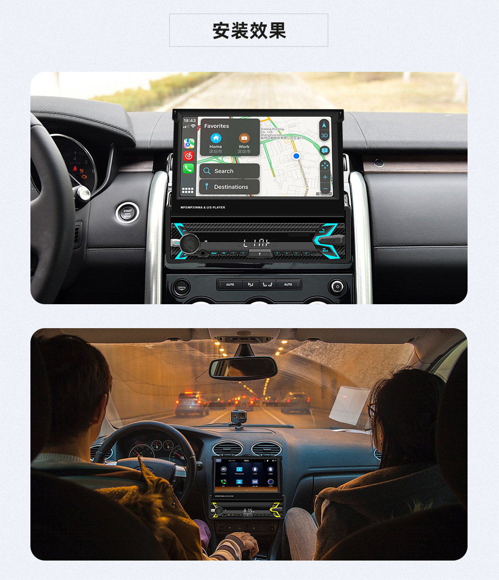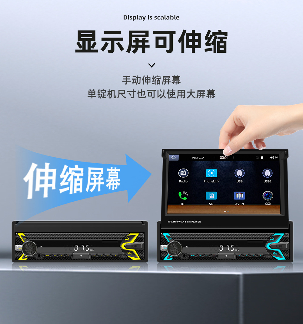 类型:车载MP5-手动伸缩屏 (可选配电动伸缩)