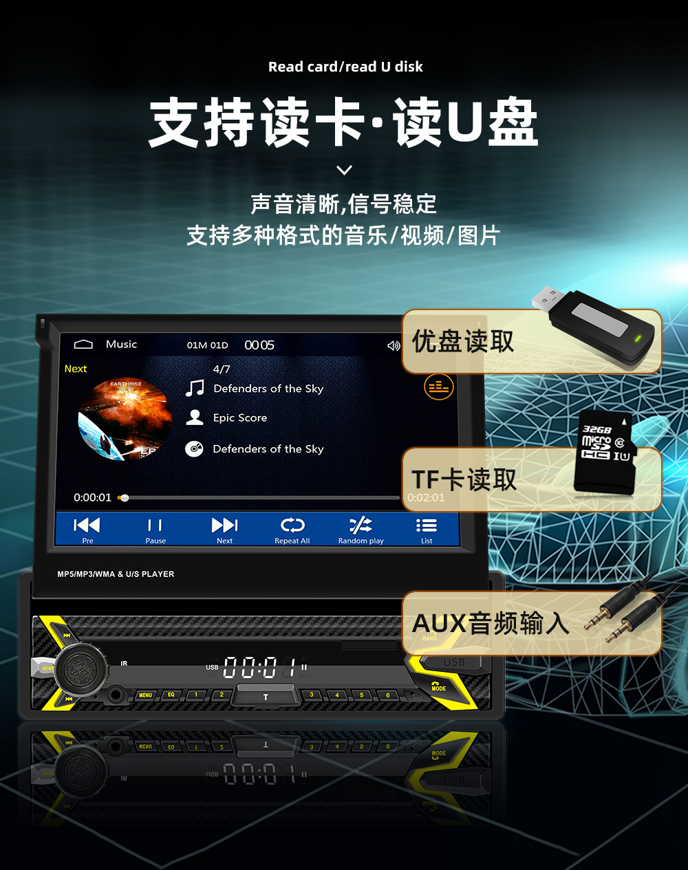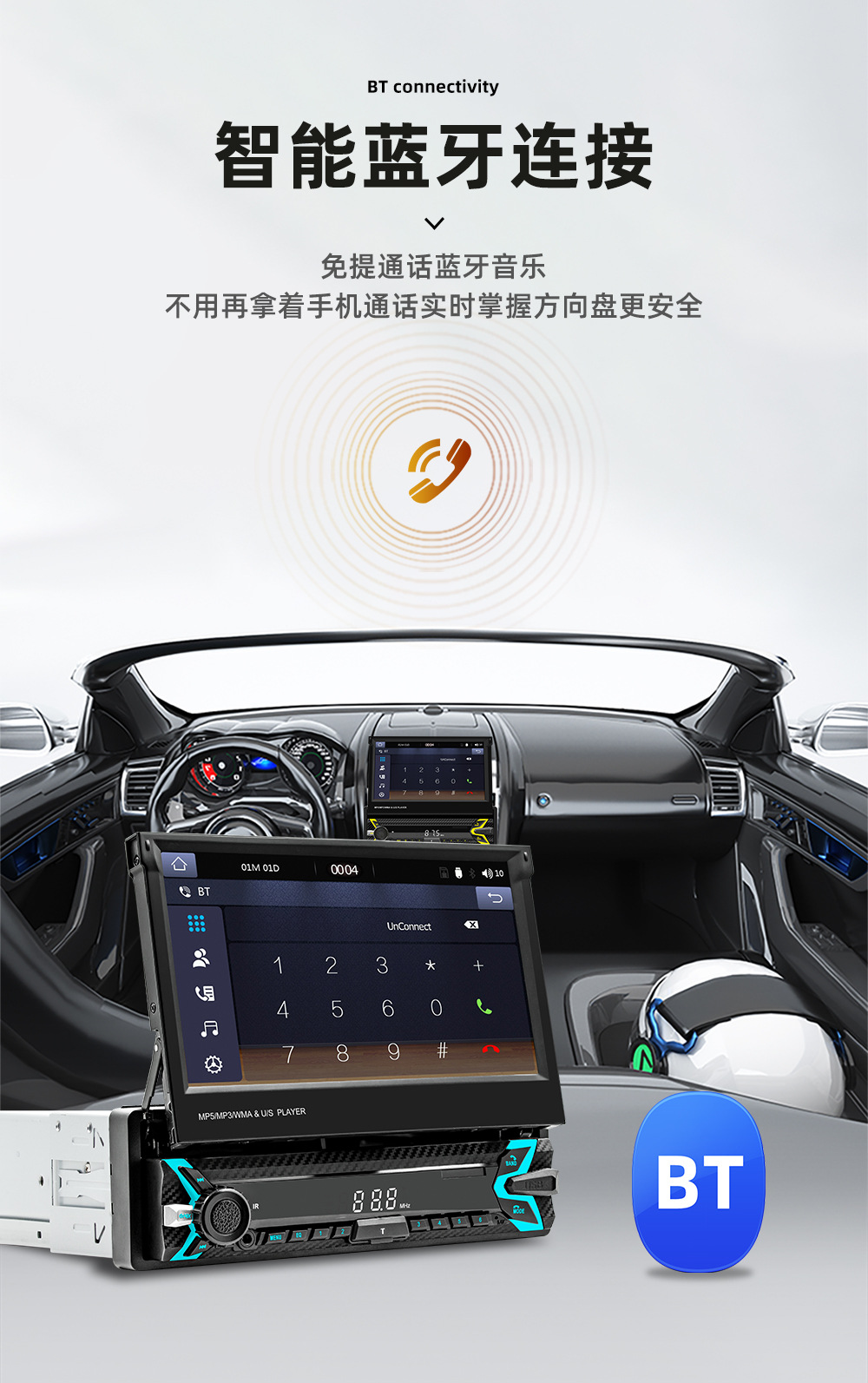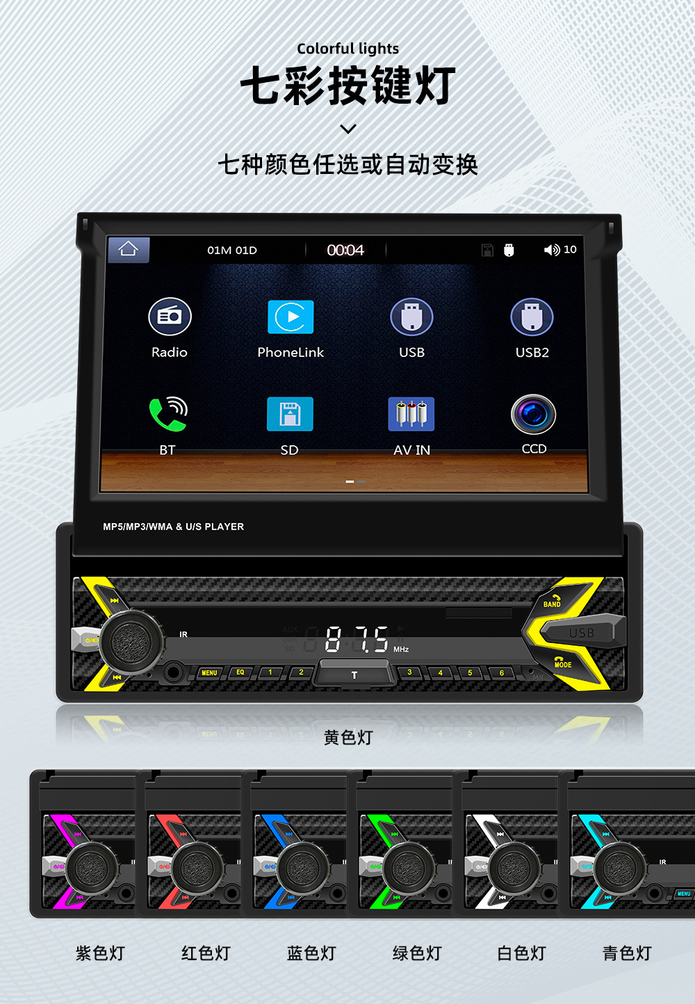 类型:车载MP5-手动伸缩屏 (可选配电动伸缩)