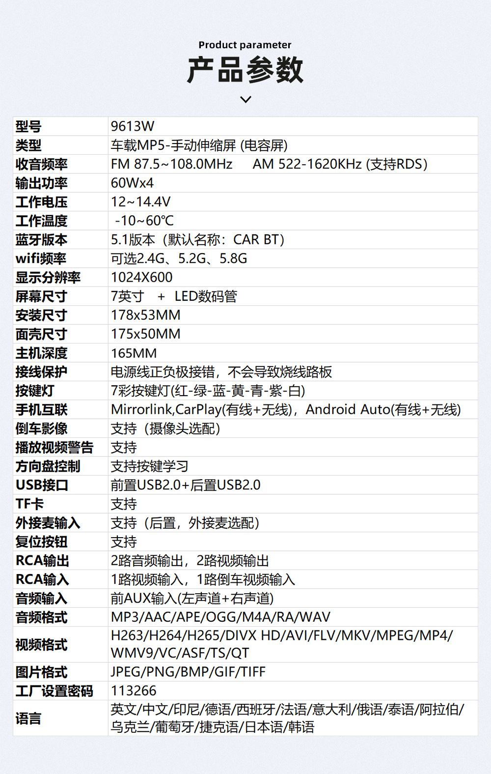 型号:9613W(有线/无线carplay+安卓Auto)