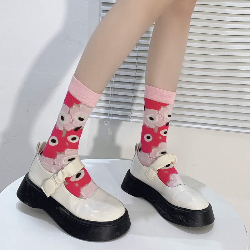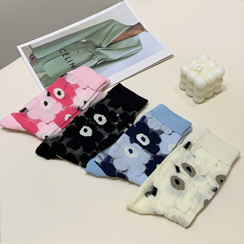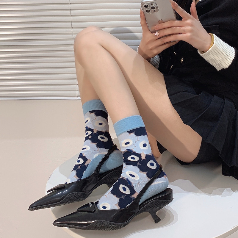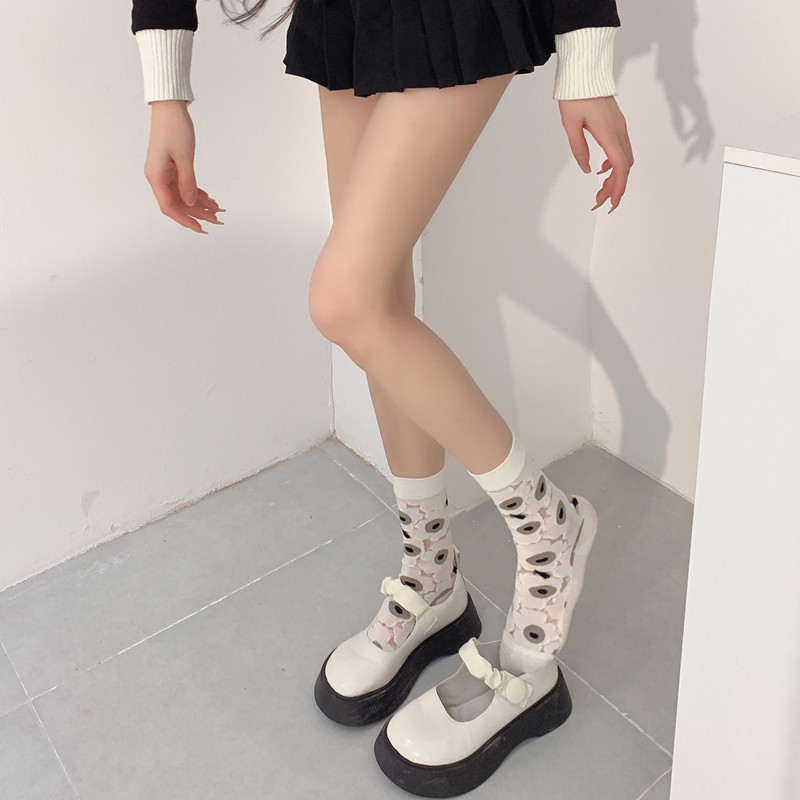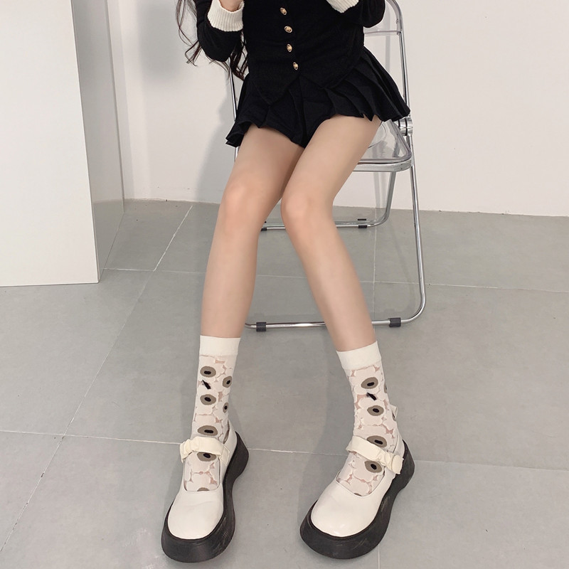 Нишевые Ретро Элегантные прозрачные стеклянные шелковые носки с цветочным рисунком, милые тонкие черно-белые женские хлопковые носки до середины икры