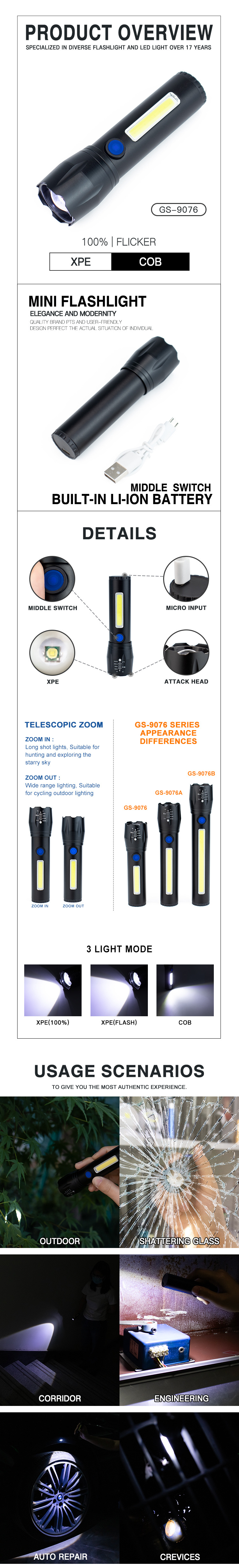 GS-9076 открытый 3 Вт алюминиевый сплав USB перезаряжаемый фонарик COB светодиодный сильный свет фонарик дальнего действия работа кемпинг