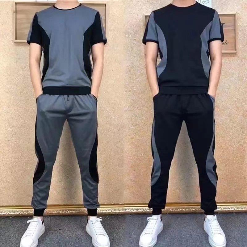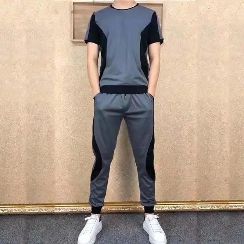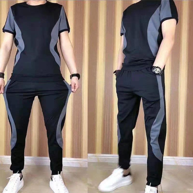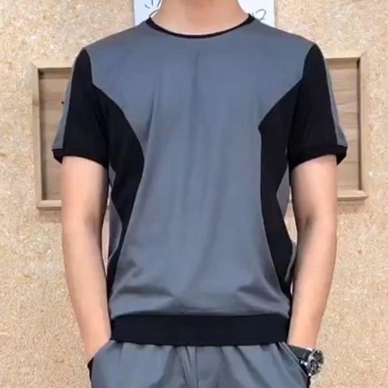 Ледяной Шелковый костюм с короткими рукавами, мужской летний новый спортивный костюм для отдыха, одежда для бега, фитнеса, футболка, брюки, комплект из двух предметов.