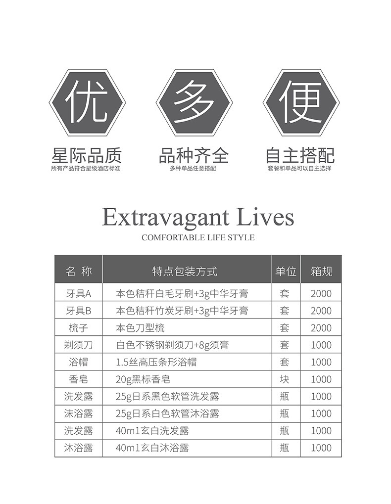 Зубная щетка Lavande тип А; Зубная щетка Lavande тип B; Лавандовый гребешок; Шапочка для душа Лаванда; Лаванда Бритва; 20 г мыла черной этикетки; 40 мл черно-белого шампуня; 40 мл черно-белого геля для душа.; 40 мл кондиционера для черных волос; Японский черный шампунь; Японский белый гель для душа.