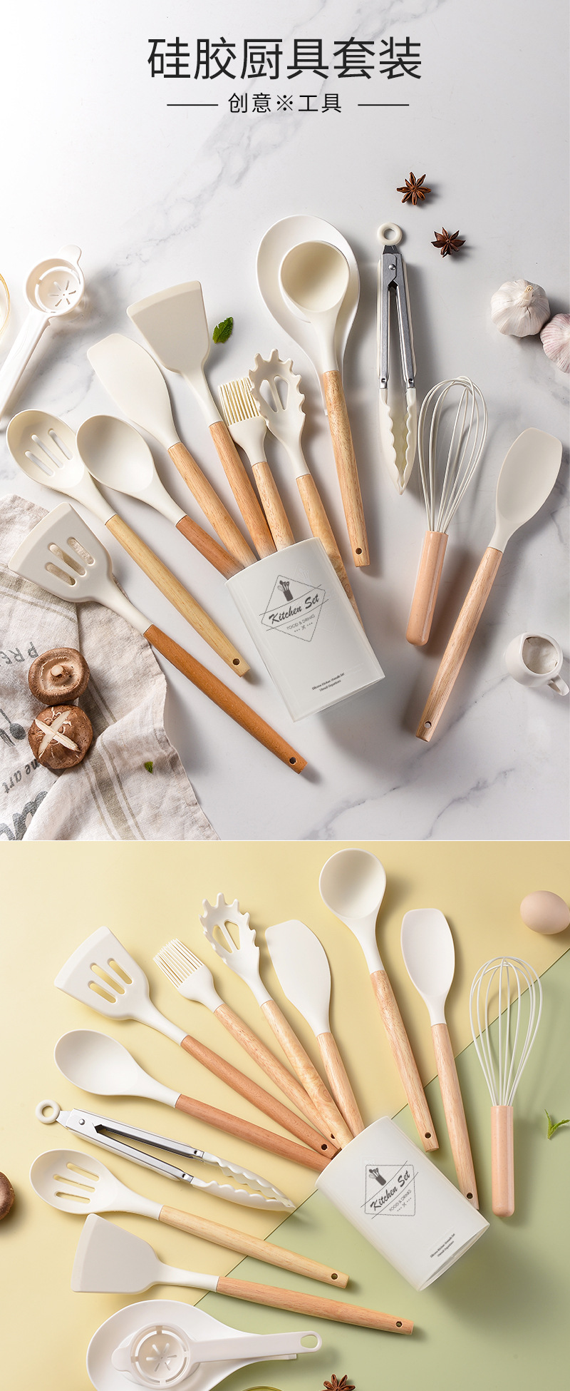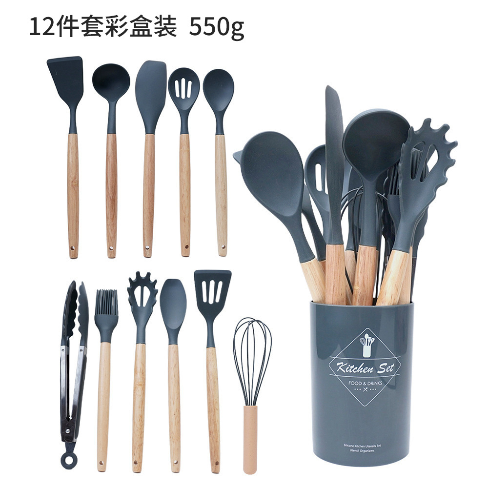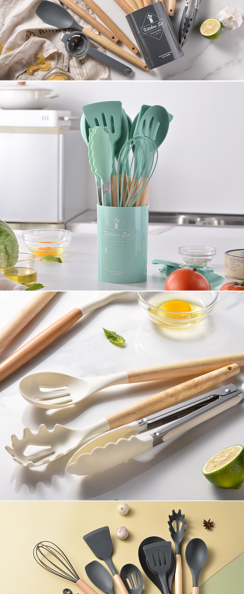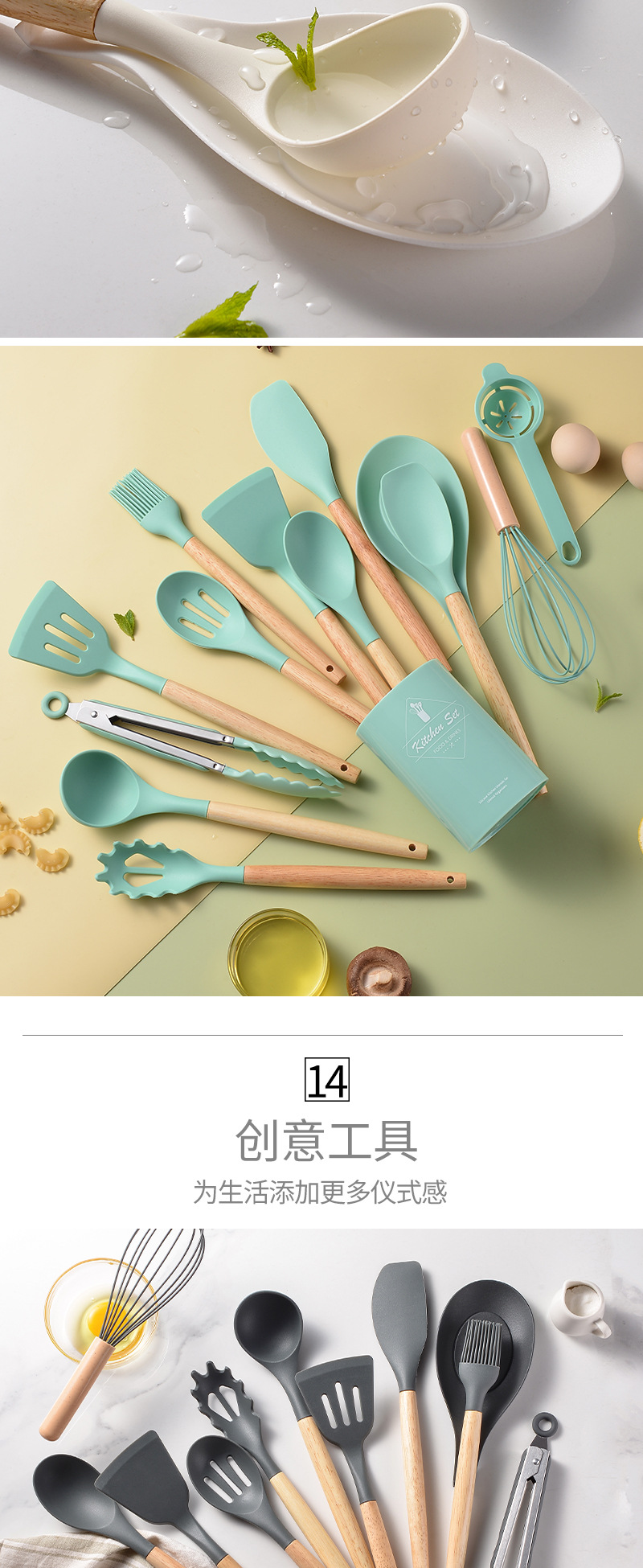 В наличии Легкая версия силиконовая посуда с круглым стволом и деревянной ручкой Набор из 14 предметов силиконовая кухонная утварь лопатка с антипригарным покрытием кухонные принадлежности