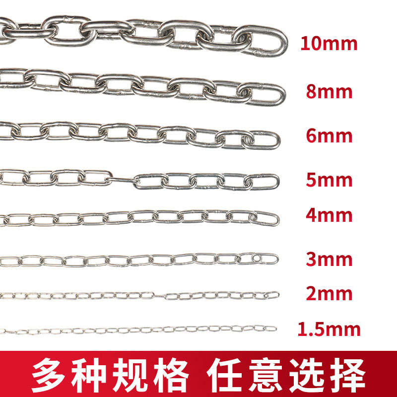 2 мм (Оцинкованная железная цепь); 3 мм (Оцинкованная железная цепь); 4 мм (Оцинкованная железная цепь); 5 мм (Оцинкованная железная цепь); 6 мм (Оцинкованная железная цепь); 1,5 мм (201 цепь); 2 мм (201 цепь); 3 мм (201 цепь); 4 мм (201 цепь); 5 мм (201 цепь); 1,5 мм (цепь 304); 2 мм (цепь 304); 3 мм (цепь 304); 4 мм (цепь 304); 5 мм (цепь 304)