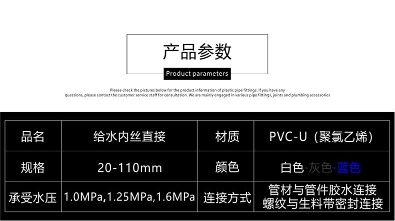 Белый 20*1/2 провода водоснабжения напрямую (1700/коробка); Серый 20*1/2 провод водоснабжения напрямую (1700 шт./Кор.); Синий 20*1/2 провода водоснабжения напрямую (1700/коробка); Белый 25*1/2 переменный диаметр провода водоснабжения напрямую (1200 PCs/box); Серый 25*1/2 переменного диаметра водоснабжения Внутренний провод непосредственно (1200/коробка); Синий 25*1/2 переменный диаметр провода водоснабжения напрямую (1200 PCs/box); Белый 25*3/4 провода водоснабжения напрямую (1000/коробка); Серый 25*3/4 провода водоснабжения напрямую (1000/коробка); Синий 25*3/4 провода водоснабжения напрямую (1000/коробка); Белый прямой провод с переменным диаметром 32*1/2 (850 шт./Коробка); Серый 32*1/2 переменного диаметра водоснабжения Внутренний провод напрямую (850/коробка); Синий 32*1/2 переменный диаметр провода водоснабжения напрямую (850 шт/коробка); Белый 32*3/4 переменный диаметр провода водоснабжения напрямую (700 шт./Кор.); Серый 32*3/4 переменного диаметра питательной воды напрямую (700/коробка); Синий 32*3/4 переменный диаметр подачи проволоки прямой (700/коробка); Белый 32*1-дюймовый провод водоснабжения напрямую (650/коробка); Серый 32*1-дюймовый провод водоснабжения напрямую (650/коробка); Синий 32*1-дюймовый провод водоснабжения напрямую (650/коробка); Белый 40*1-1/4 провод водоснабжения напрямую (432/коробка); Серый 40*1-1/4 провод водоснабжения напрямую (432/коробка); Синий 40*1-1/4 провод водоснабжения напрямую (432 шт./Кор.); Белый 50*1-1/2 провод водоснабжения напрямую (240/коробка); Серый 50*1-1/2 провод водоснабжения напрямую (240 шт./Кор.); Синий 50*1-1/2 провод прямой подачи (240 шт./Кор.); Белый 63*2-дюймовый провод водоснабжения напрямую (125/коробка); Серый 63 * 2-дюймовый провод водоснабжения напрямую (125 шт./Кор.); Синий 63*2-дюймовый провод водоснабжения напрямую (125/коробка); Белый 75*2,5-дюймовый провод водоснабжения напрямую (120 шт./Кор.); Серый 75*2,5-дюймовый провод водоснабжения напрямую (120 шт./Кор.); Синий 75*2,5 дюйма прямой (120/коробка); Белый 90 * 3-дюймовый провод водоснабжения напрямую (54/коробка); Серый 90 * 3-дюймовый провод водоснабжения напрямую (54/коробка); Синий 90 * 3-дюймовый внутренний провод водоснабжения (54 шт./Кор.); Белый 110*4-дюймовый провод водоснабжения напрямую (36/коробка); Серый 110*4-дюймовый провод водоснабжения напрямую (36/коробка); Синий 110*4-дюймовый провод водоснабжения напрямую (36/коробка)