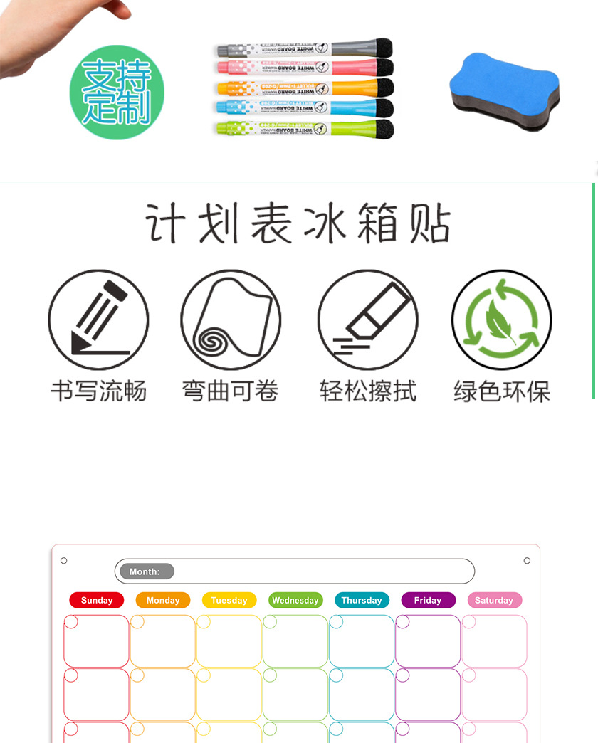 PET вертикальный месячный график; PET горизонтальный месячный график; PET вертикальное Недельное Расписание; PET Черный месячный график; Случайный ластик для магнитной доски может отметить цвет; Магнитная всасывающая обычная ручка для белой доски можно отметить цвет; Одна магнитная ручка для белой доски может отметить цвет