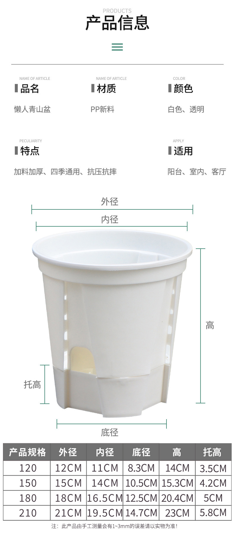 120 наружный диаметр 12 * диаметр основания 8.3 * высота 14 см; 150 наружный диаметр 15 * диаметр основания 10.5 * высота 15.3 см; 180 наружный диаметр 18 * диаметр основания 12.5 * высота 20,4 см; 210 наружный диаметр 21 * диаметр основания 14.7 * высота 23 см