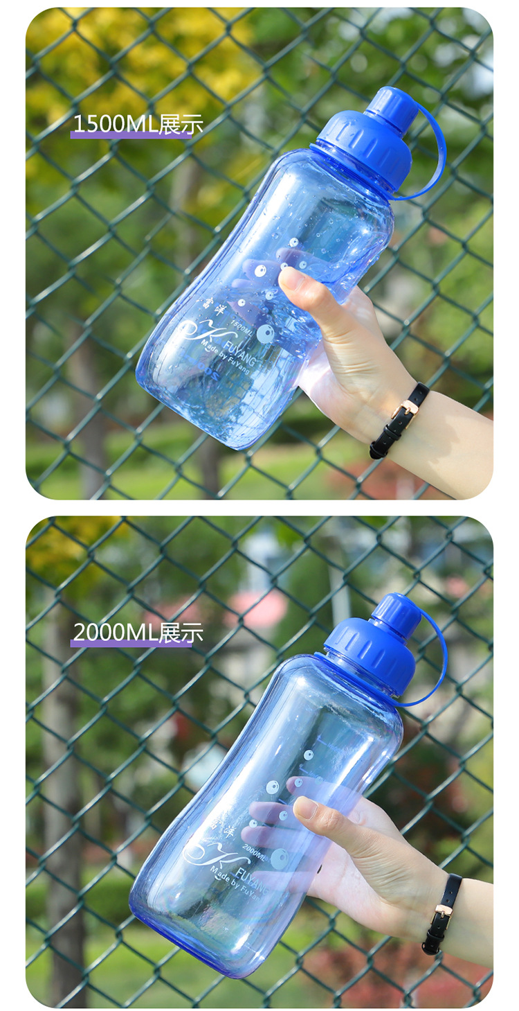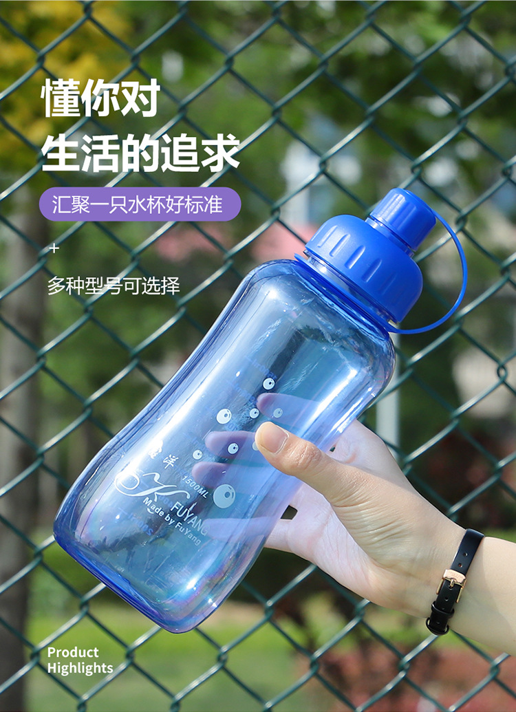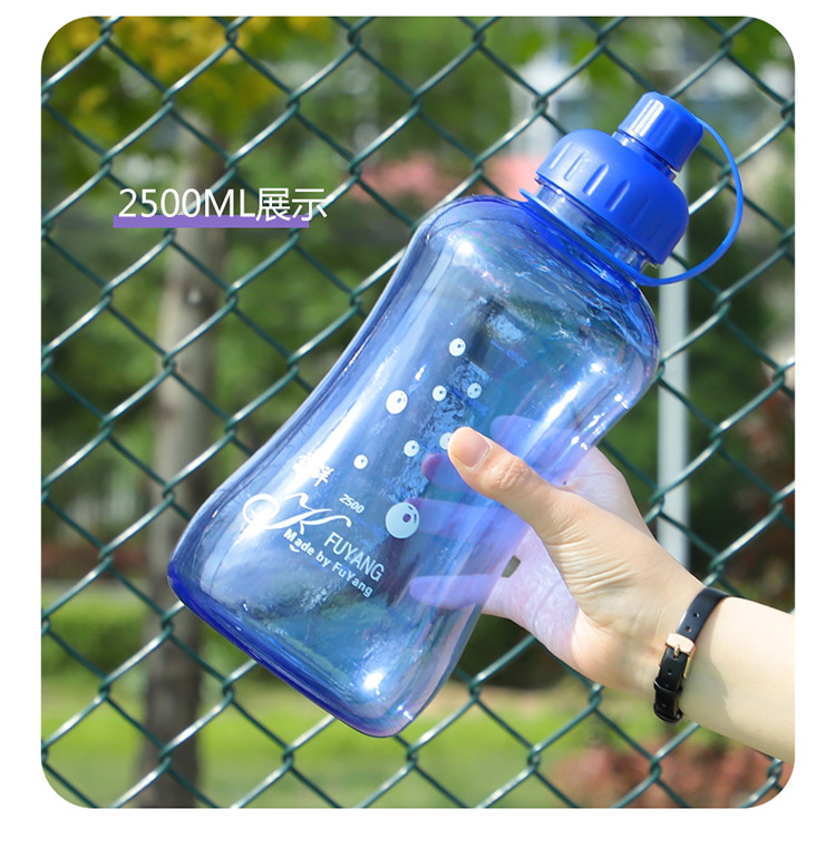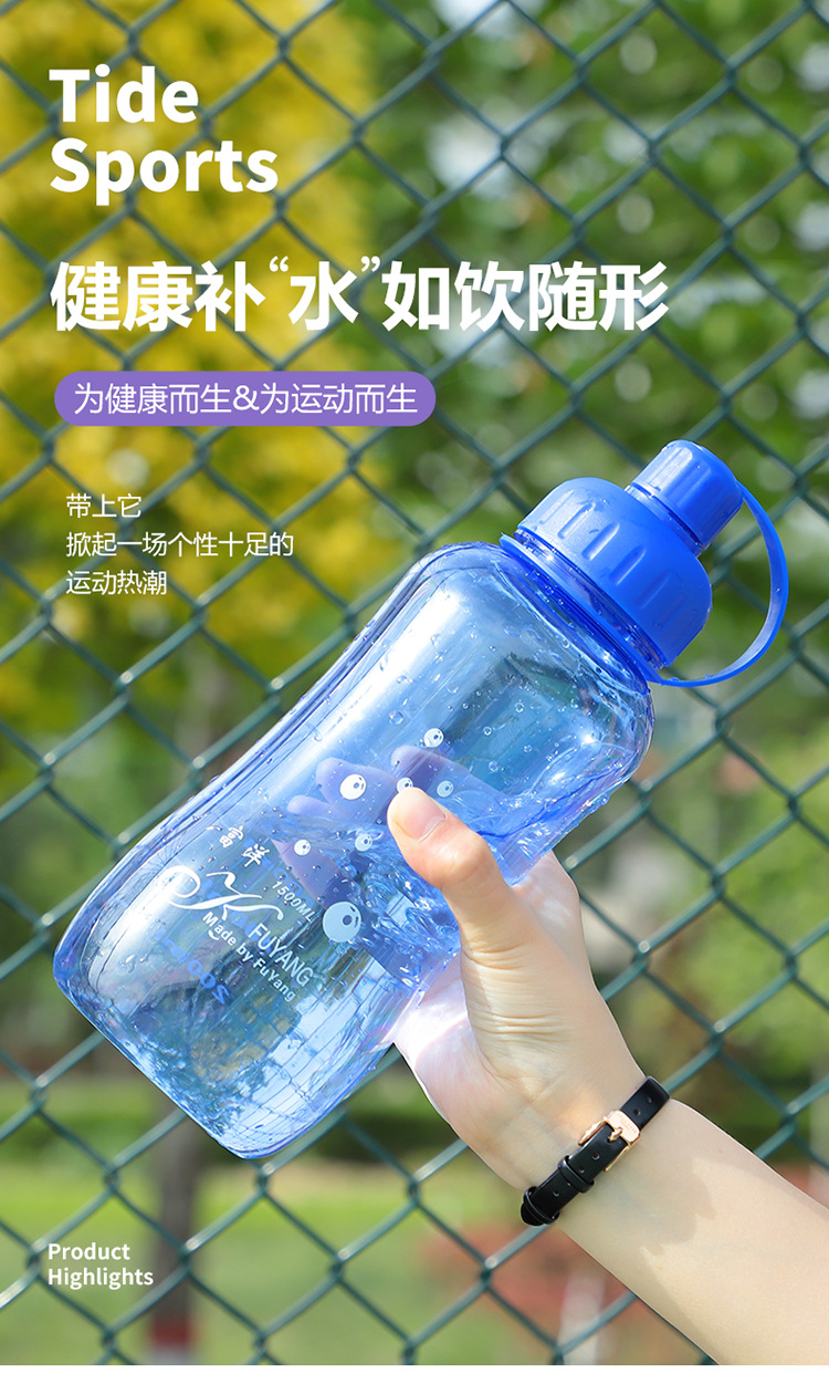 Большая пластиковая спортивная бутылка Fuyang для активного отдыха с мерной шкалой, динамическим фильтром, логотипом и увеличенным объемом.