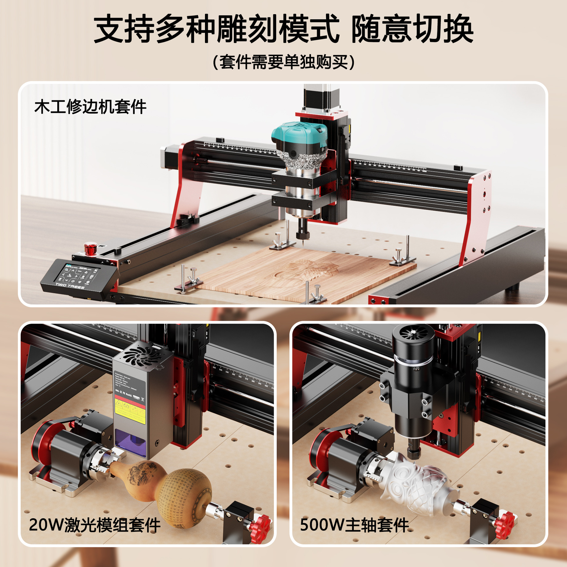 TTC450 pro (стандартная конфигурация); Комплект для обновления высокоскоростного двигателя шпинделя мощностью 500 Вт; Комплект лазерного модуля высокой мощности 20 Вт; Набор четвертой оси гравировального станка с ЧПУ; Пылесос с ЧПУ