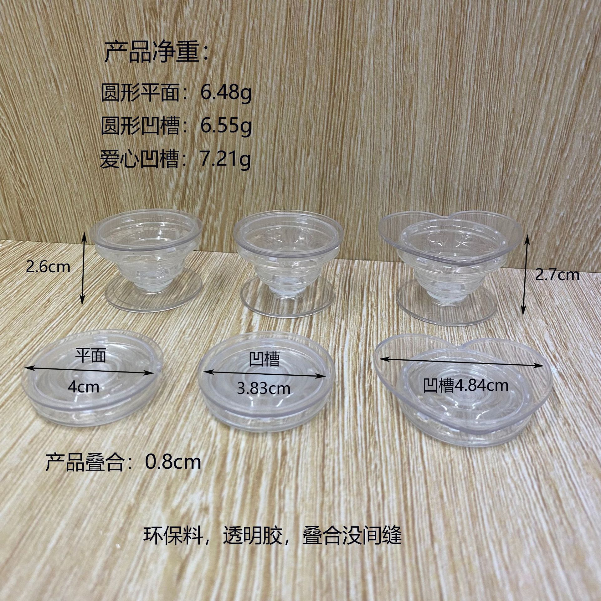 Прозрачный круглый плоский белый (голый); Прозрачная круглая плоская поверхность смешанного цвета (голая); Прозрачная круглая канавка белая (голая); Прозрачная бороздка в форме сердца белая (голая); Прозрачные верхние и нижние наклейки (голые)