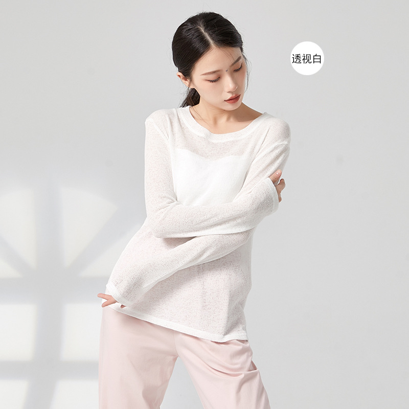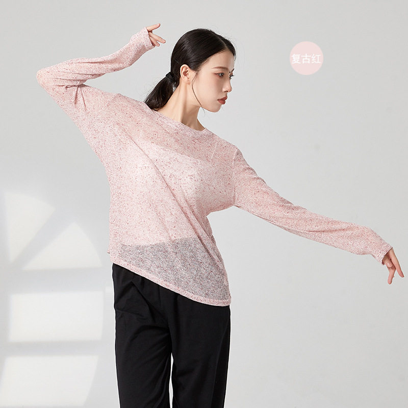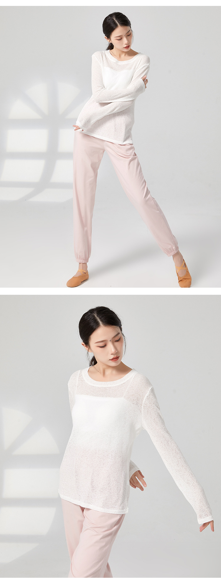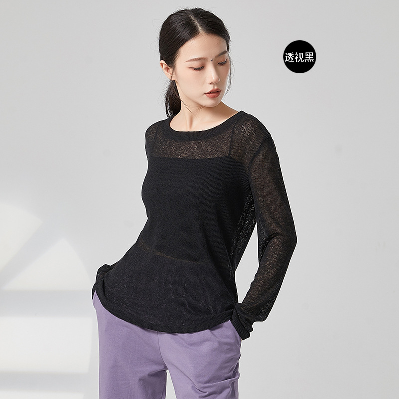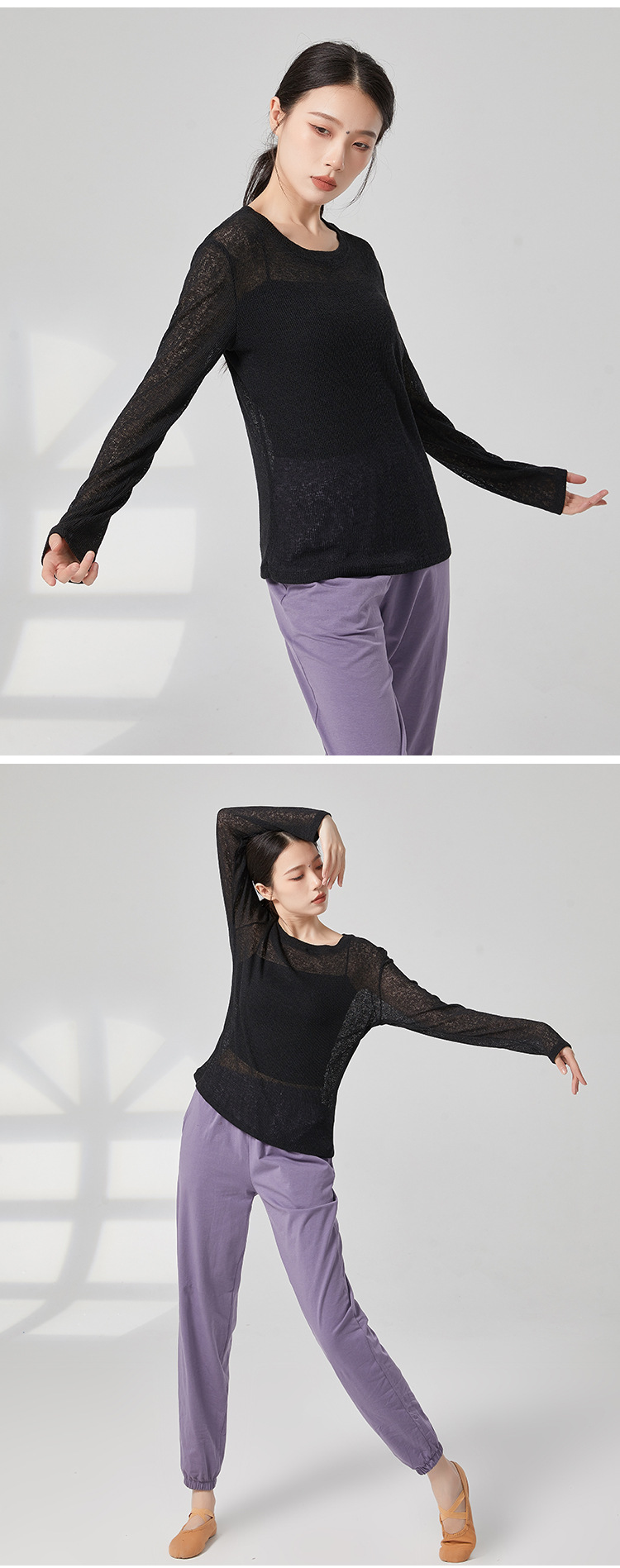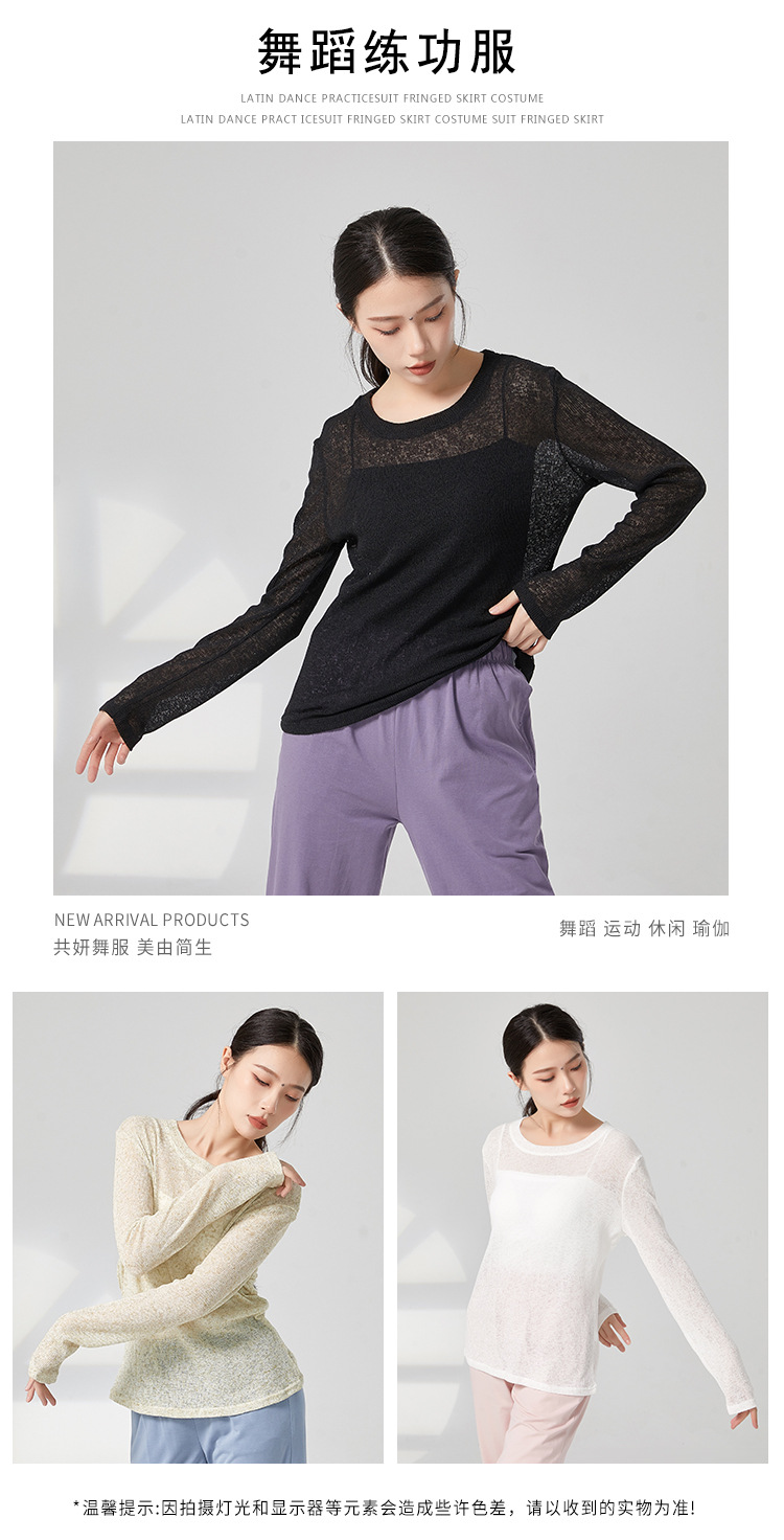 Современная танцевальная одежда Микро-прозрачный солнцезащитный крем Футболка с длинными рукавами Женская Свободная блузка с круглым вырезом Простая Классическая танцевальная тренировочная одежда