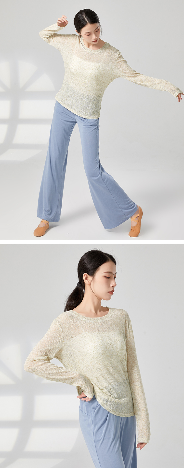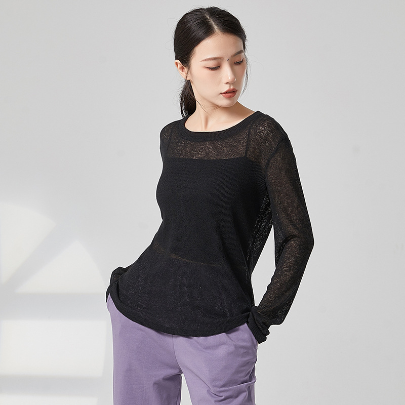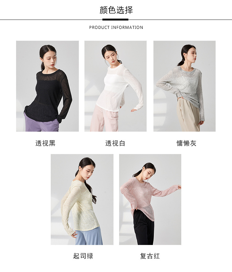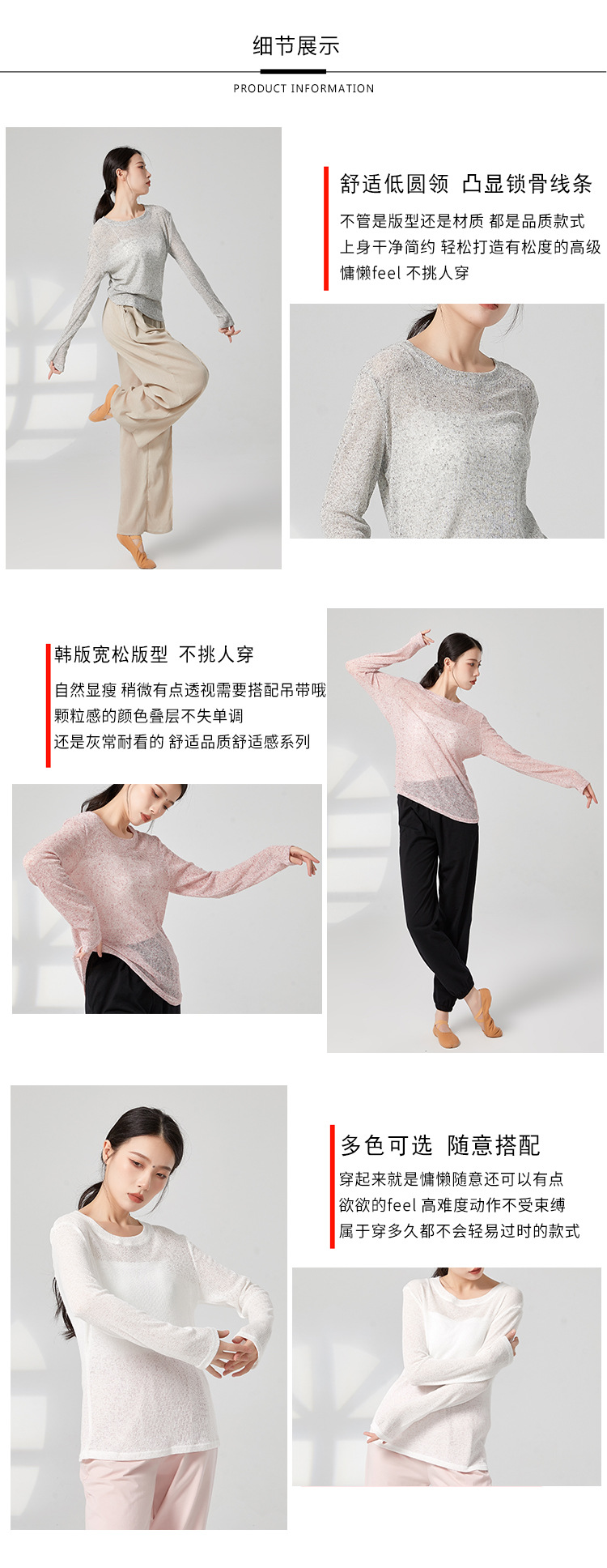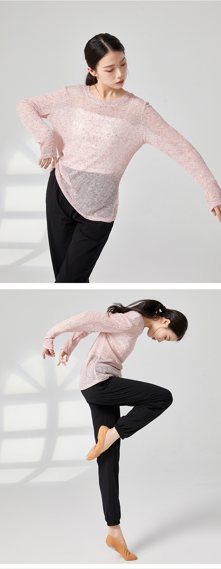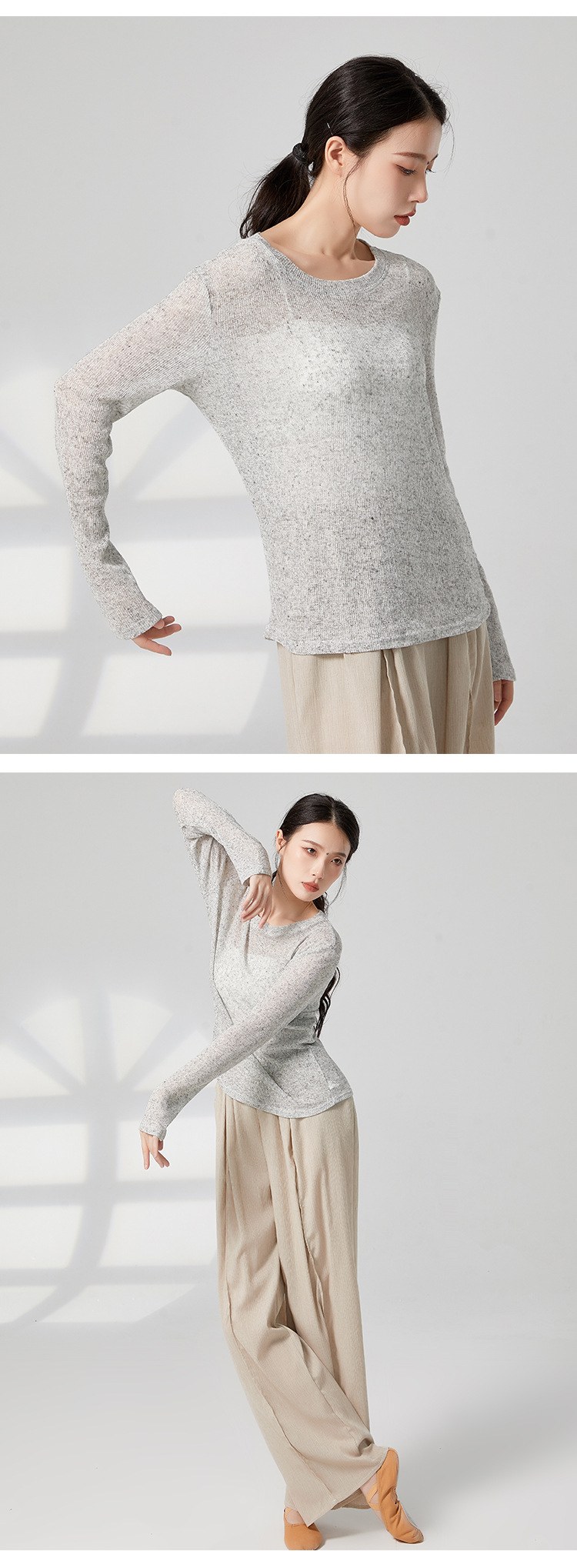 Современная танцевальная одежда Микро-прозрачный солнцезащитный крем Футболка с длинными рукавами Женская Свободная блузка с круглым вырезом Простая Классическая танцевальная тренировочная одежда