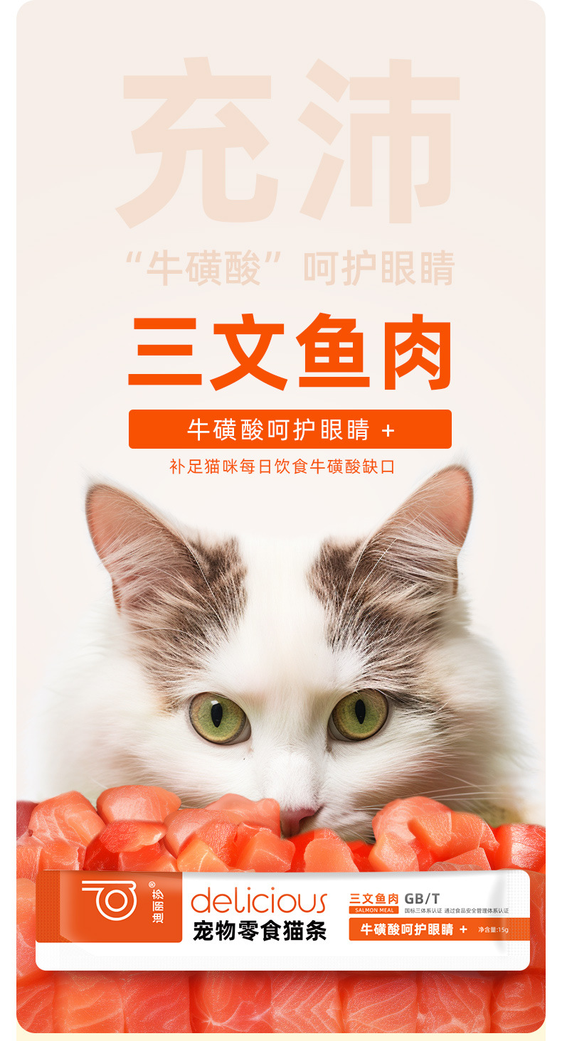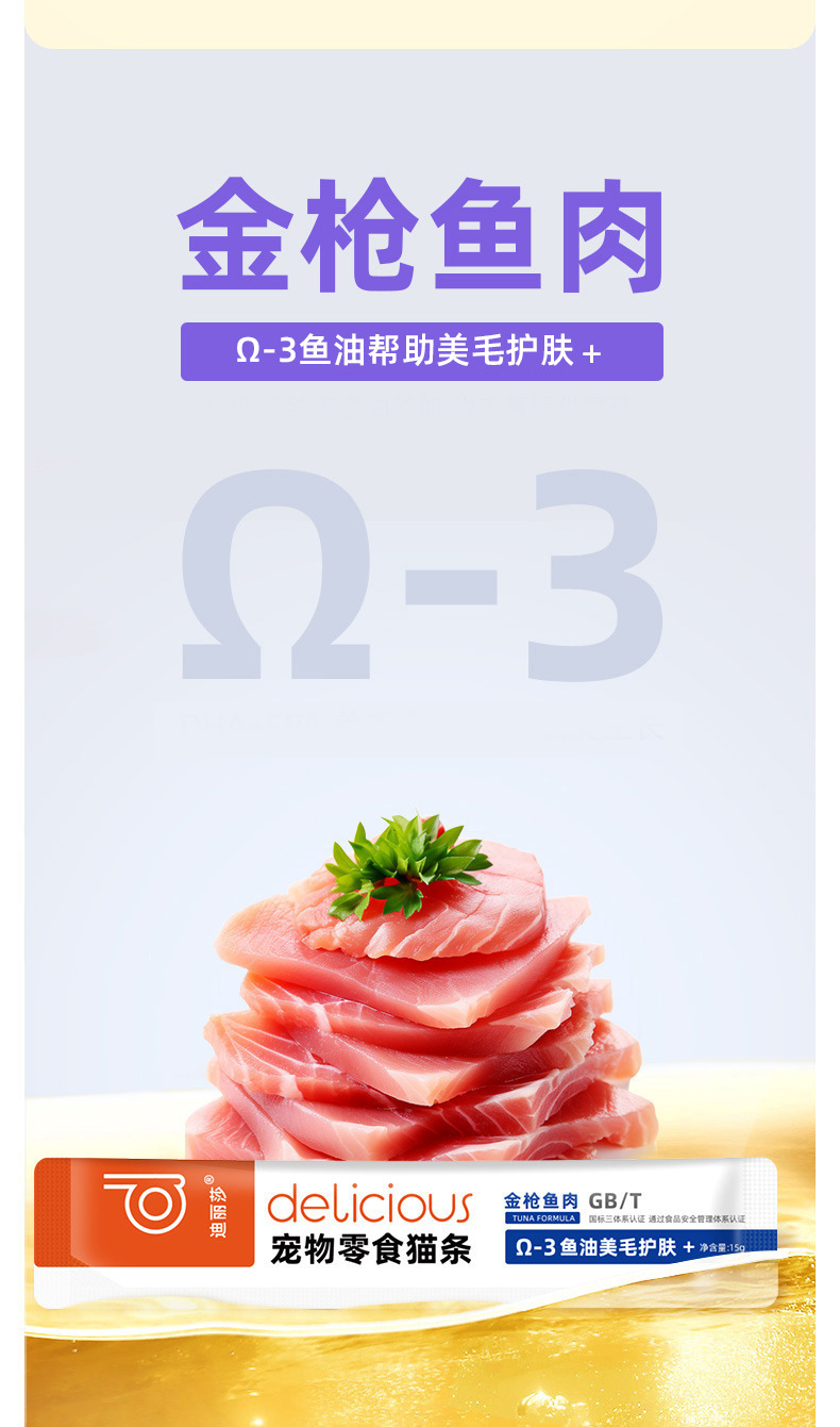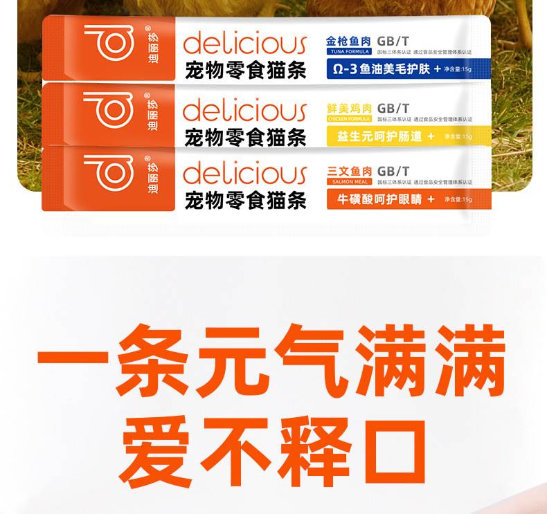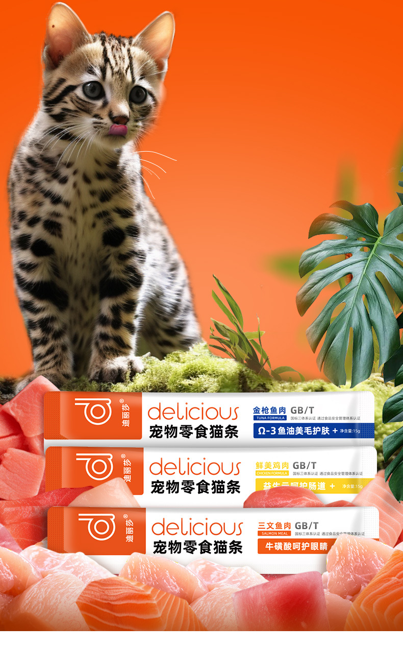 Тунец (15 г/палочка) Рыбий жир Q-3 для ухода за волосами и кожей; Пребиотики со вкусом курицы (15 г/палочка) ухаживают за кишечником; Лосось (15 г/палочка) таурин защищает глаза