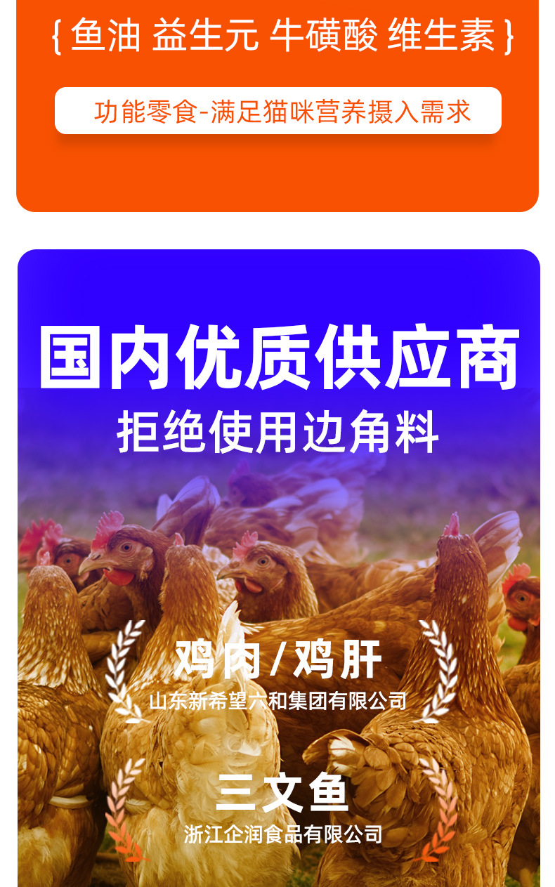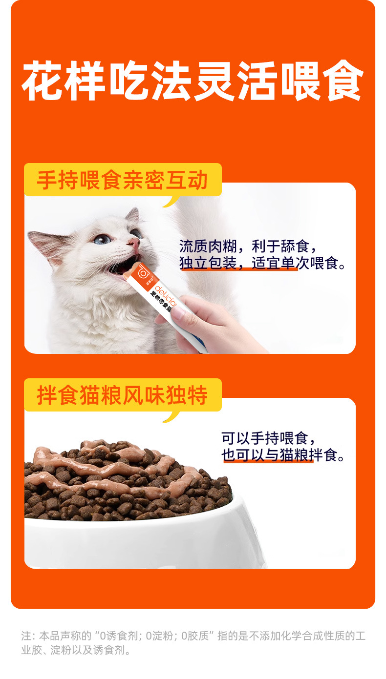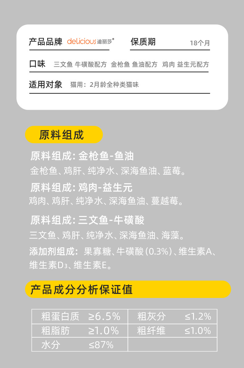 Тунец (15 г/палочка) Рыбий жир Q-3 для ухода за волосами и кожей; Пребиотики со вкусом курицы (15 г/палочка) ухаживают за кишечником; Лосось (15 г/палочка) таурин защищает глаза