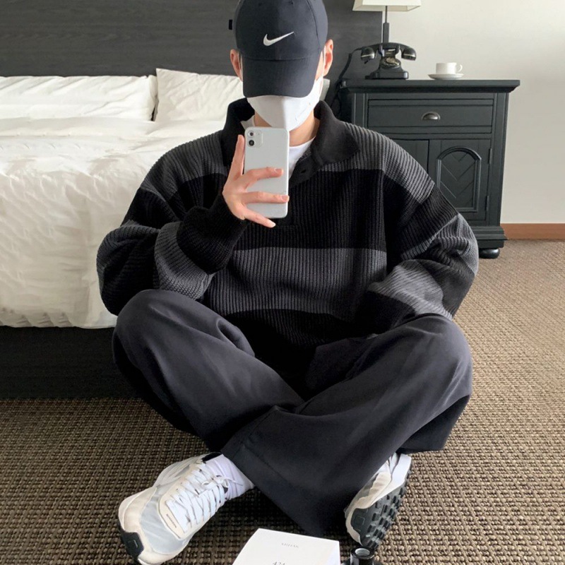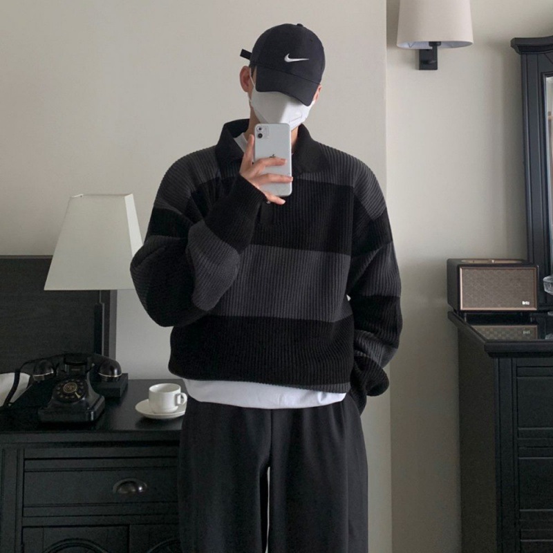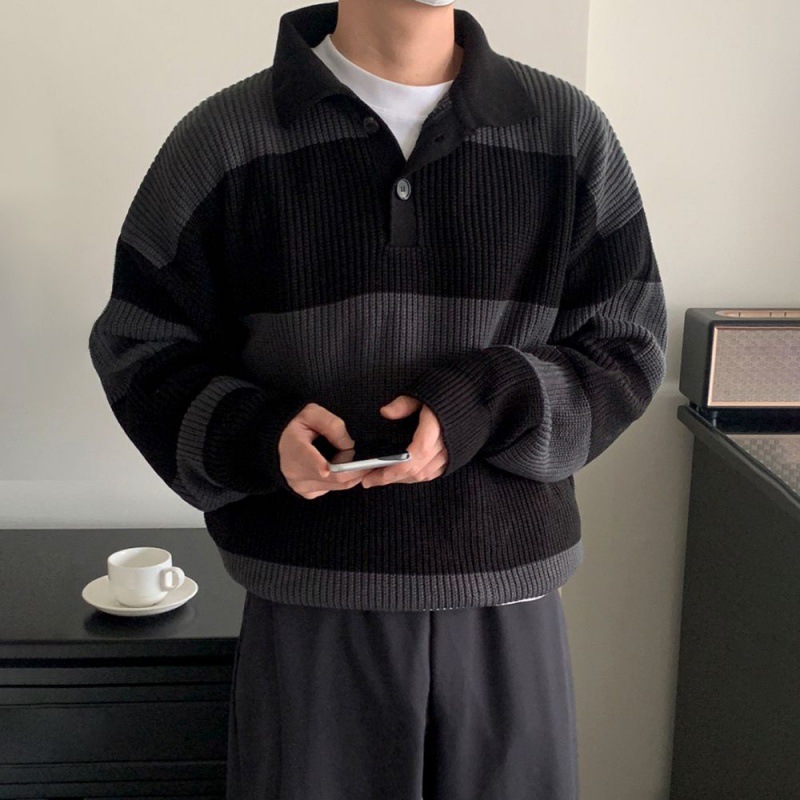 Цветной контрастный полосатый свитер MYQ, мужской весенне-осенний корейский модный свитер с лацканами, Свободный Повседневный Топ