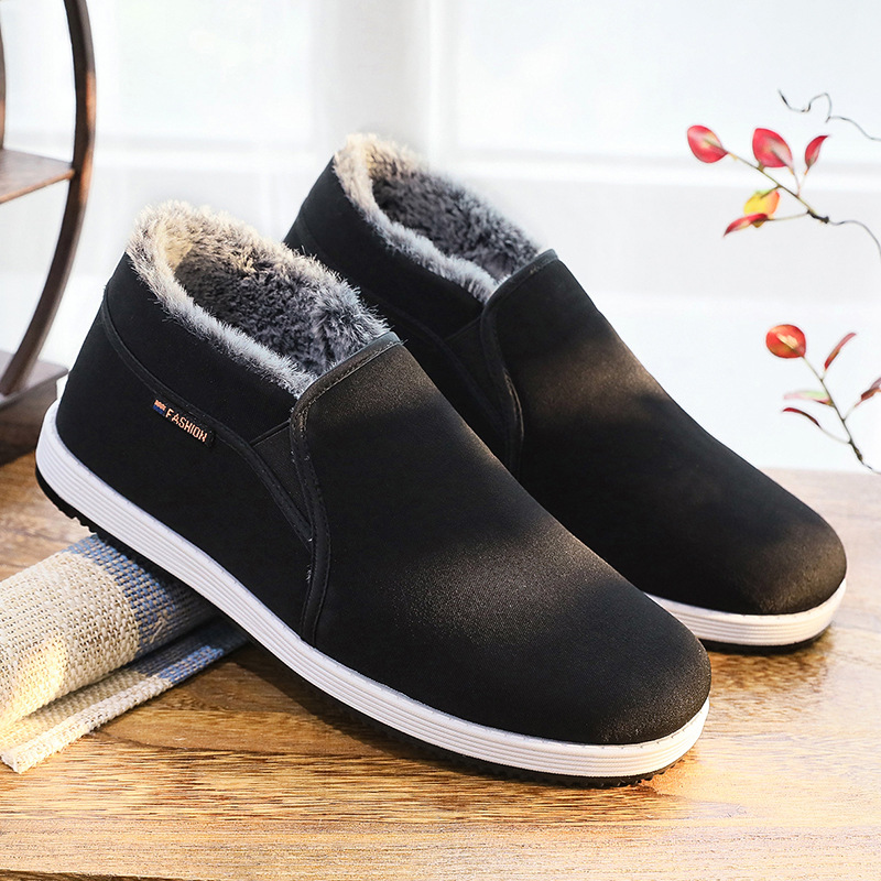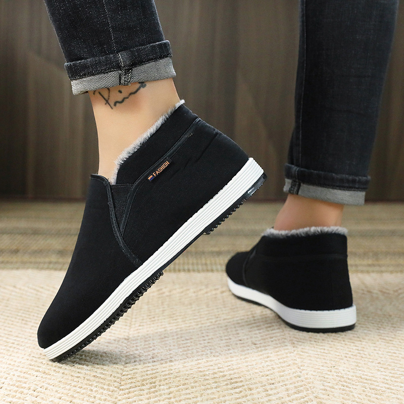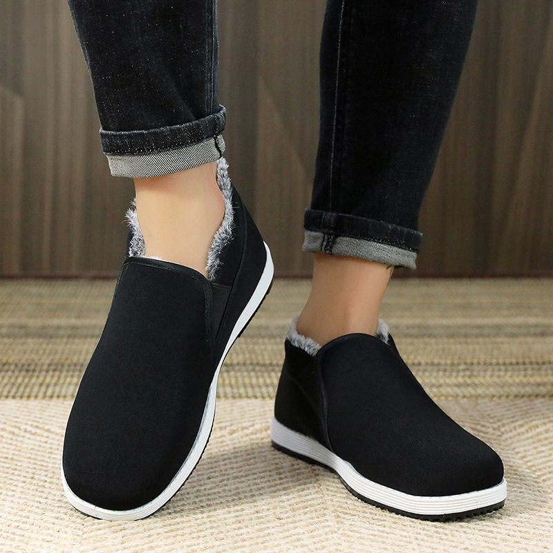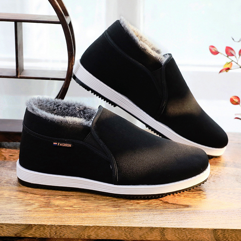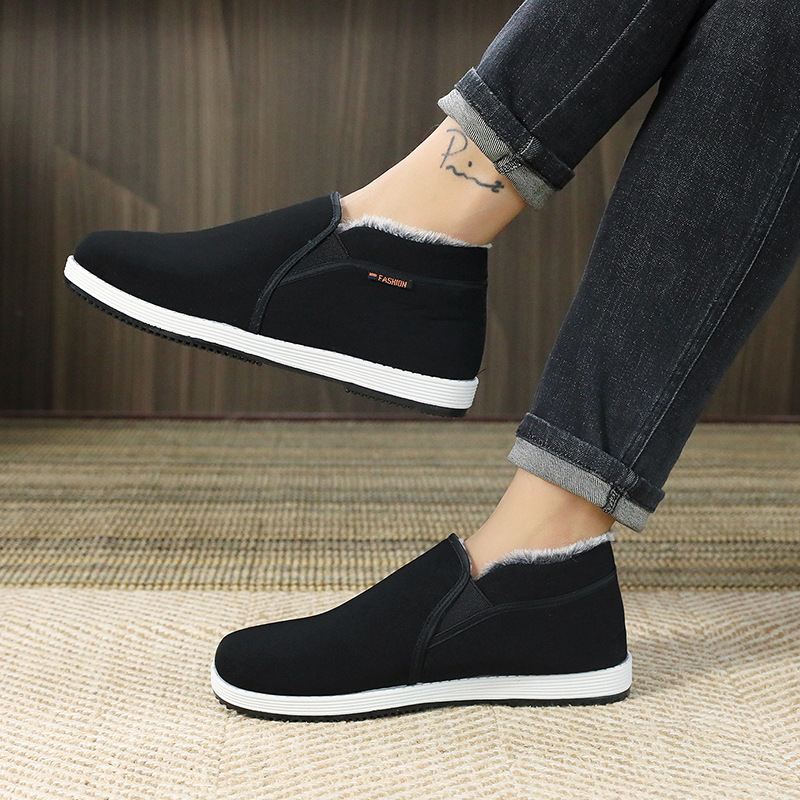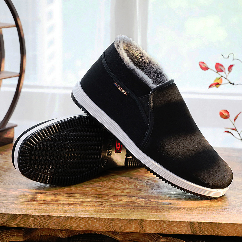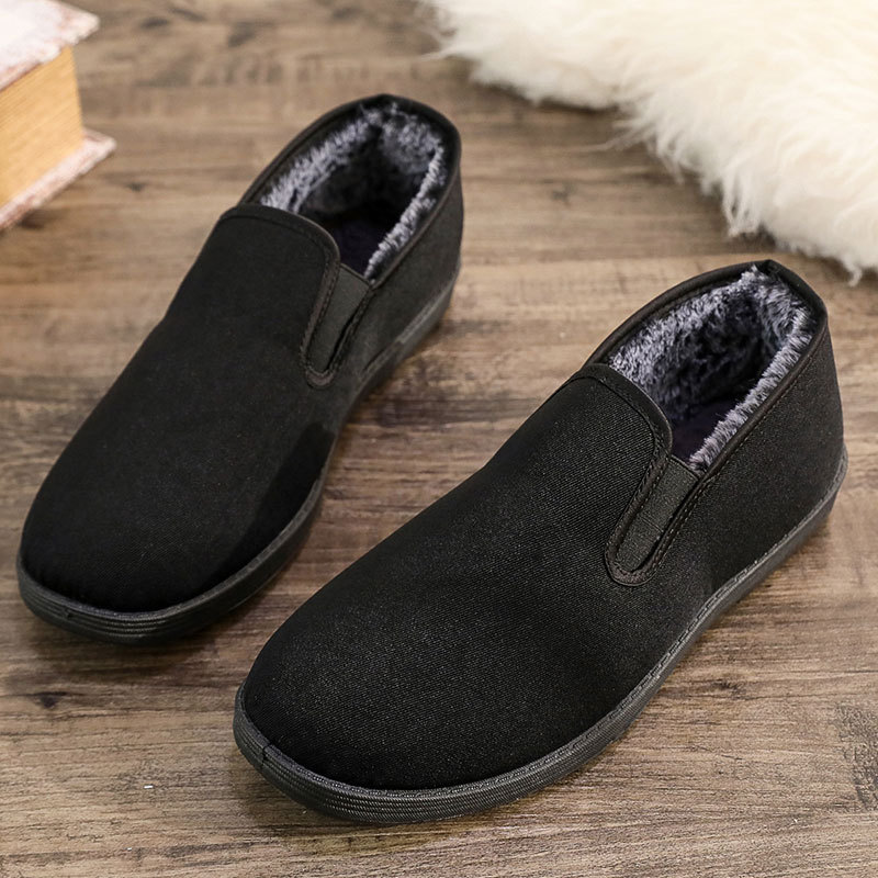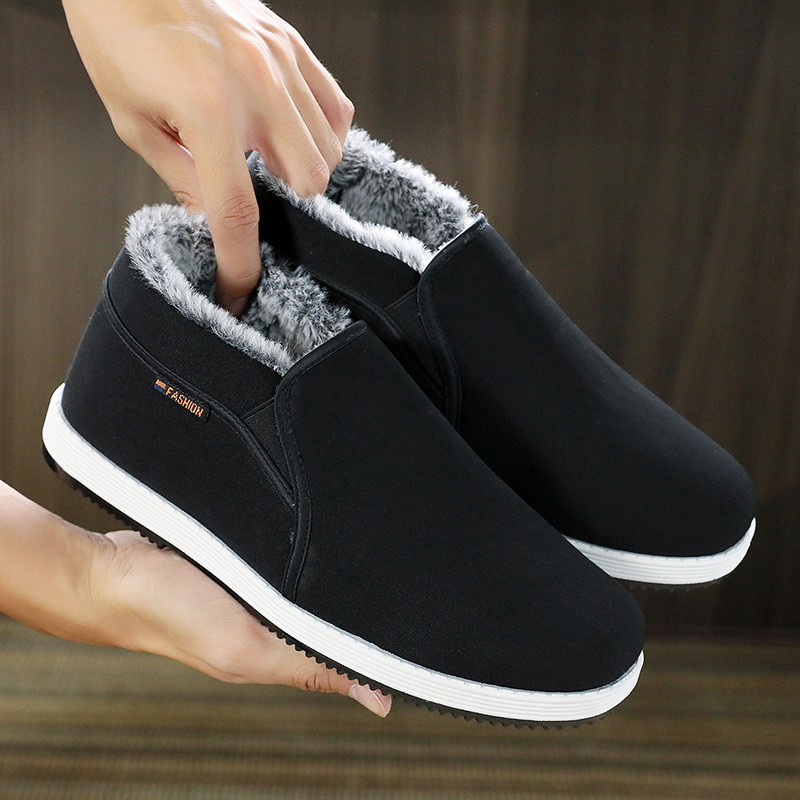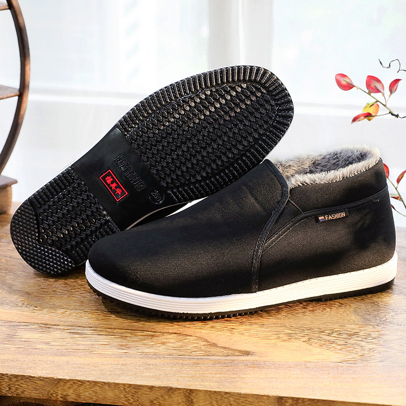 Зимние мужские тканевые туфли в стиле старого Пекина, теплые хлопковые туфли с высоким берцем на флисовой подкладке, нескользящие толстые плюшевые черные рабочие туфли.