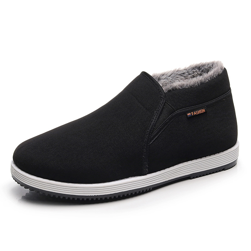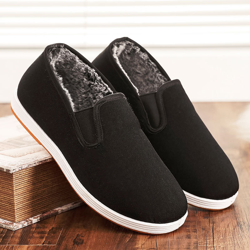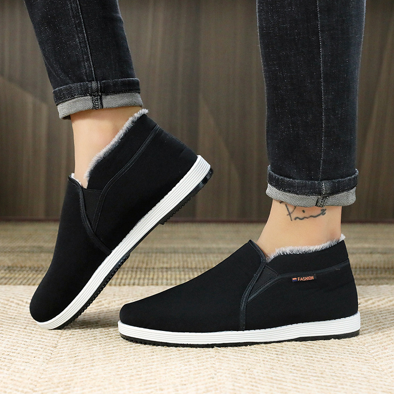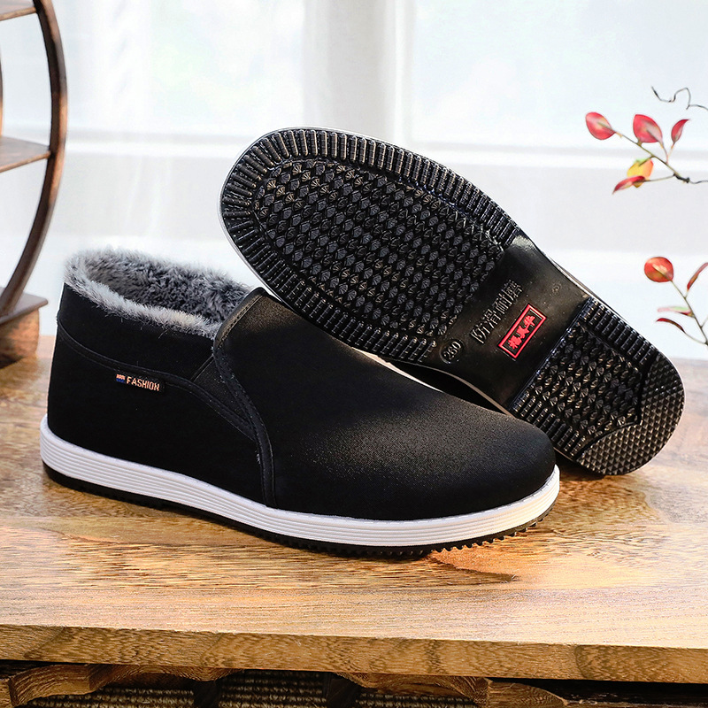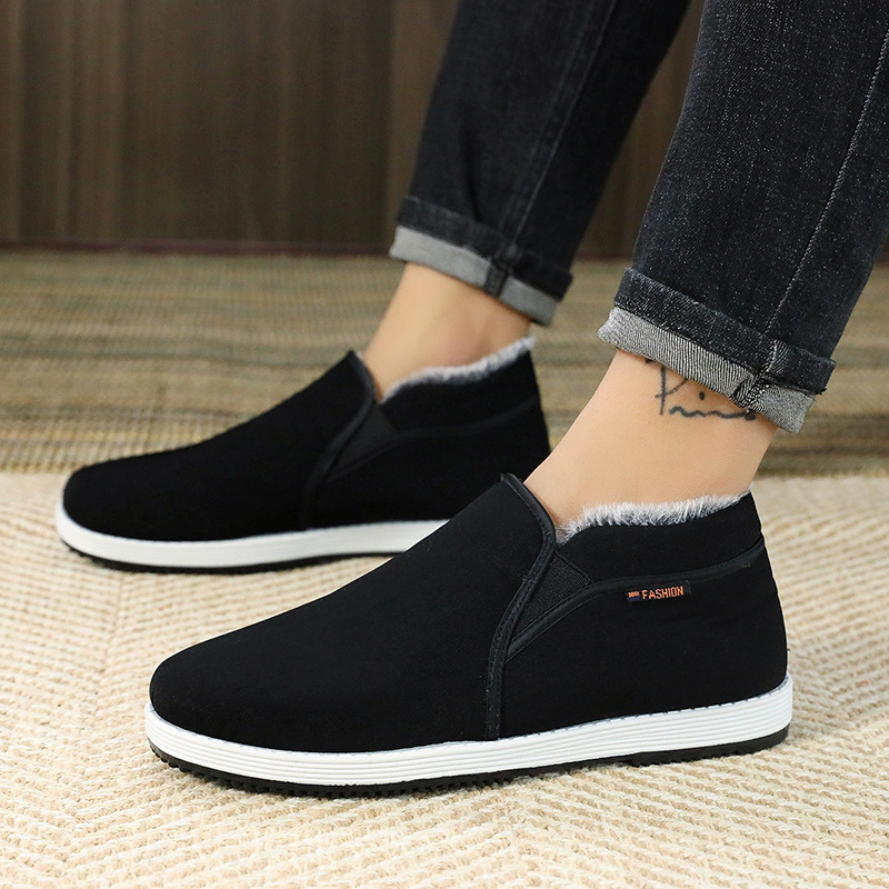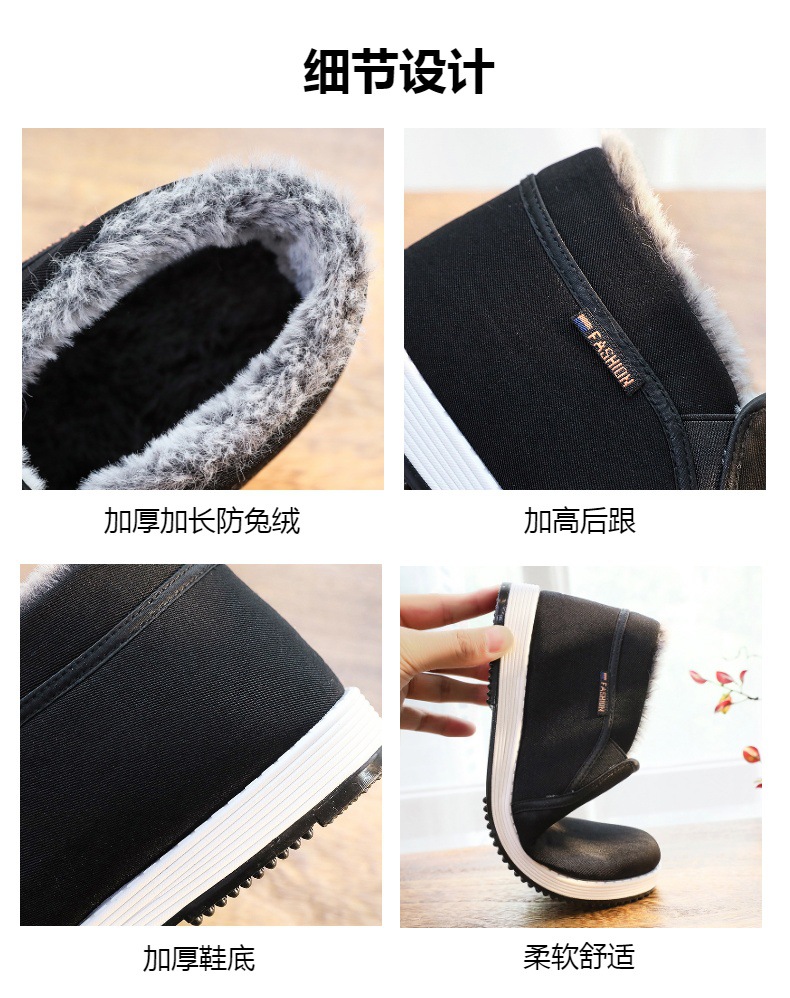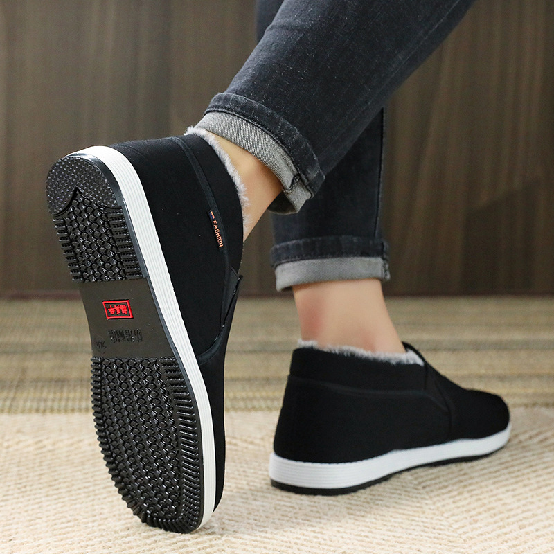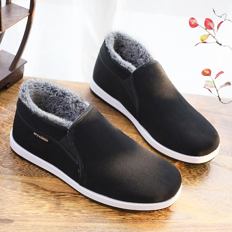 Зимние мужские тканевые туфли в стиле старого Пекина, теплые хлопковые туфли с высоким берцем на флисовой подкладке, нескользящие толстые плюшевые черные рабочие туфли.