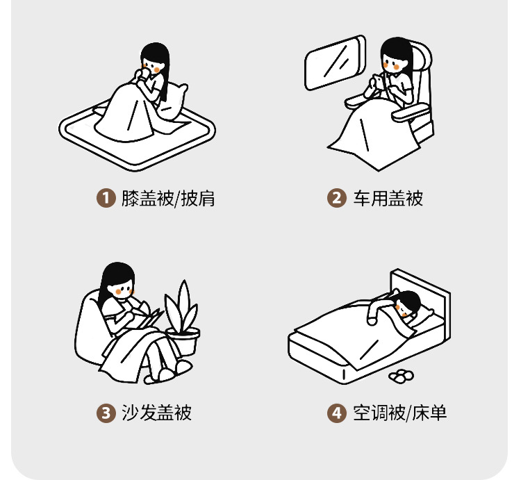 70*70 см [можно использовать как одеяло для спинки/колена]; 90*90 см [можно использовать как чехол для ног]; 90*180 см [можно использовать как одеяло для сна]; 90*210 см [для подушки сиденья/одеяла на хвосте кровати]; 180*130 см [подходит для небольшого одноместного сиденья]; 180*150 см [подходит для одного человека]; 180*180 см [подходит для большого одноместного сиденья]; 180*230 см [подходит для двух человек]; 180*260 см [подходит для больших двойных сидений/направляемых сидений наложницы]; 180*300 см [подходит для трех человек/большое сиденье наложнице]; 180*340 см [подходит для увеличения трех человек]; 180*380 см [подходит для четырех человек]; 180*420 см [подходит для пяти человек]