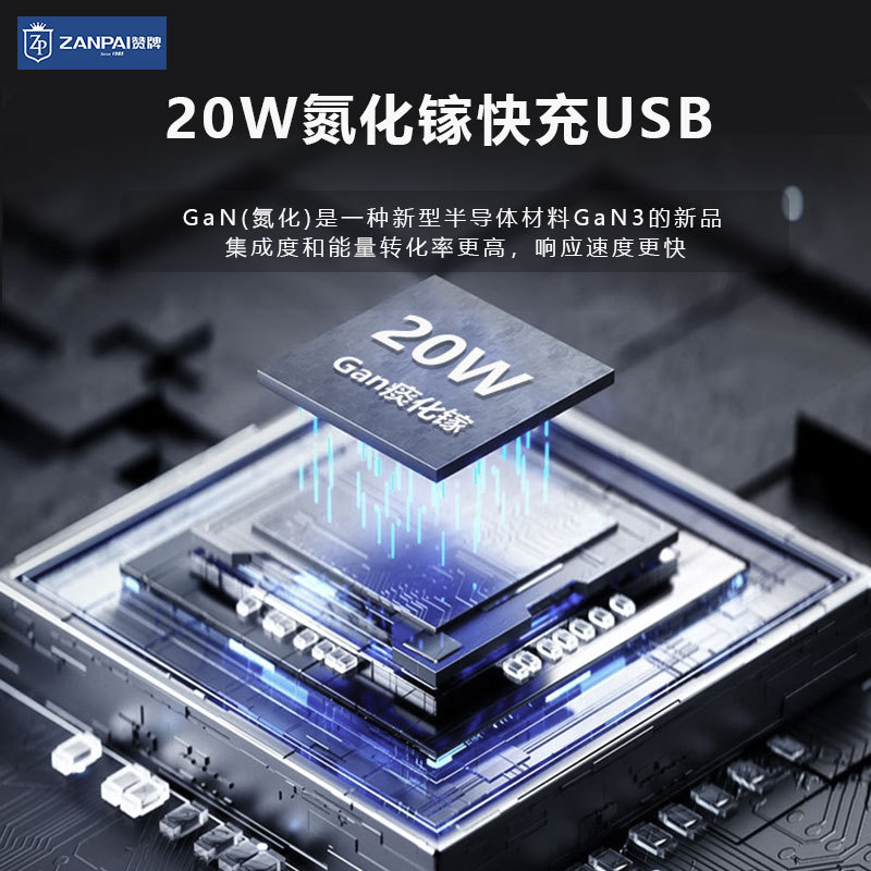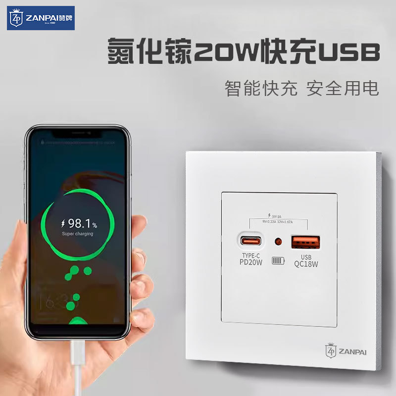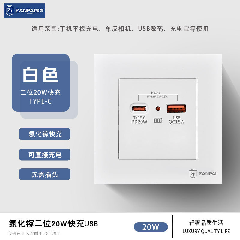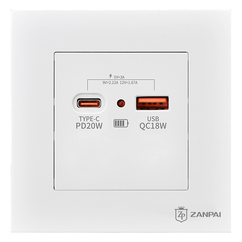 Розетка Zanpai из нитрида галлия 20 Вт с двумя портами для быстрой зарядки, скрытая, белая, тип 86, с разъемом TYPE-C