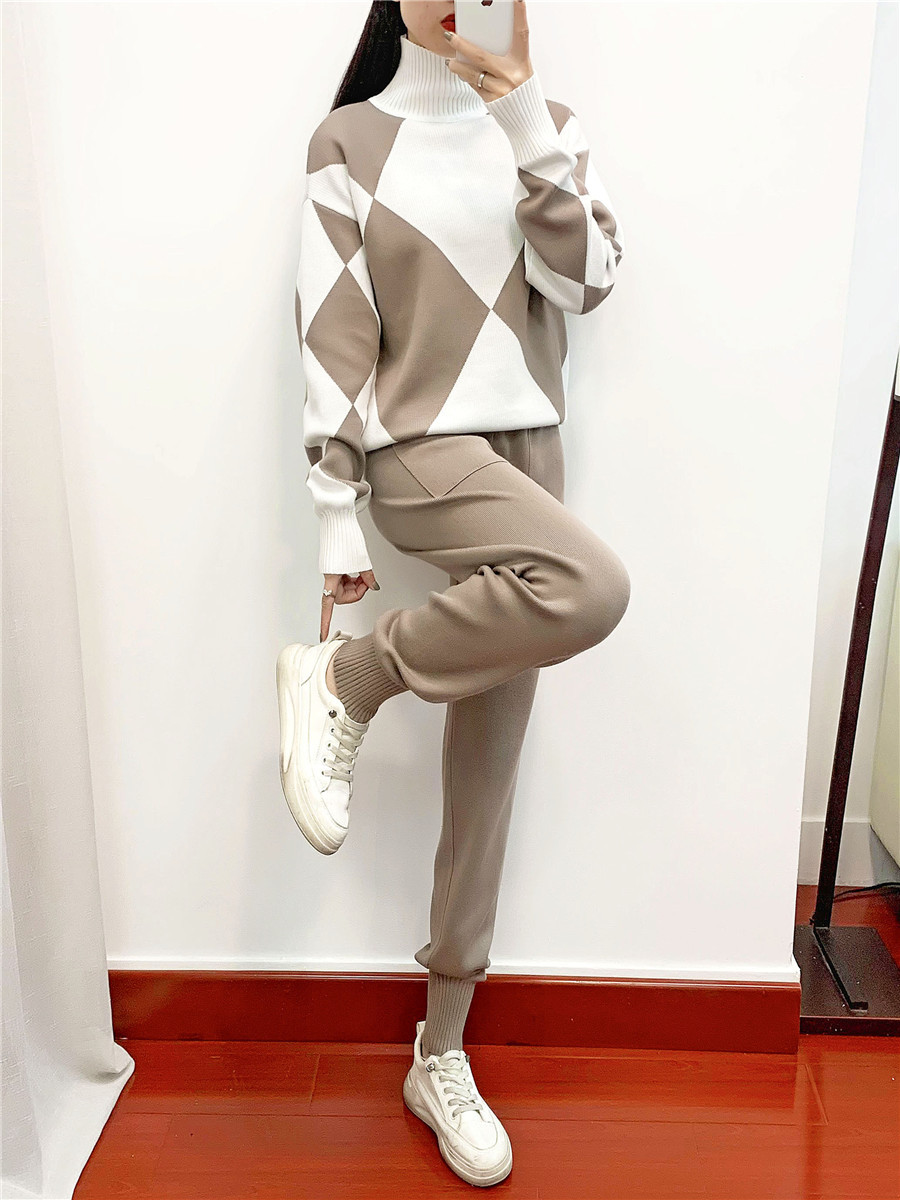 Кросс-бордерный европейский стиль: французский ленивый комплект с высоким воротником, облегающие брюки, молодежный шик, женский двухсоставной набор для осени и зимы.
