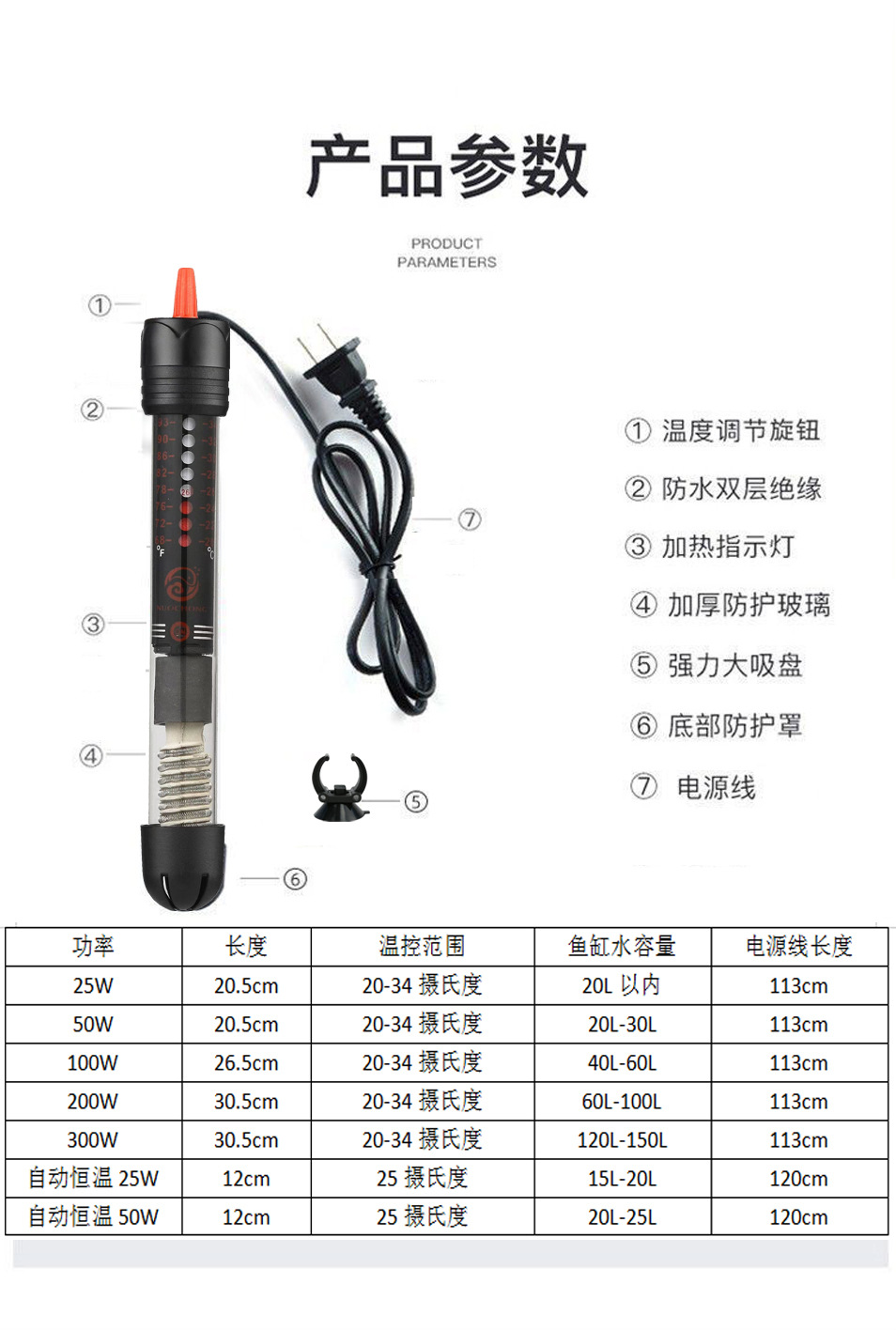 25W; 50W; 100W; 200W; 300W; 25W (с двумя защитными чехлами); 50W (с двумя защитными чехлов); 100W (с трехсекенчатым защитным чехлом); 200W (с четырьмя защитными чехлами); 300W (с четырьмя секциями защитный чехол); 25W автоматическая постоянная температура ультракороткий нагревательный стержень; 50W автоматическая термостатическая сверхкороткая нагревательный стержень