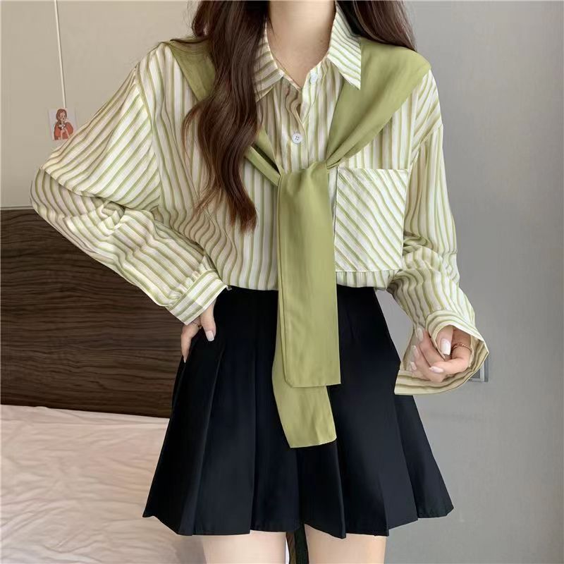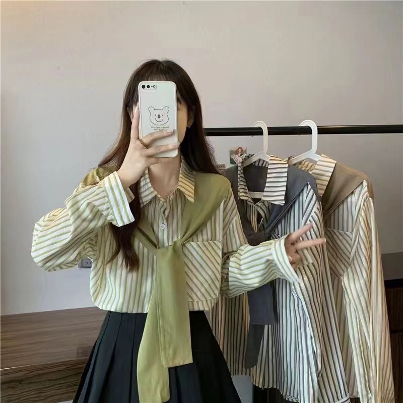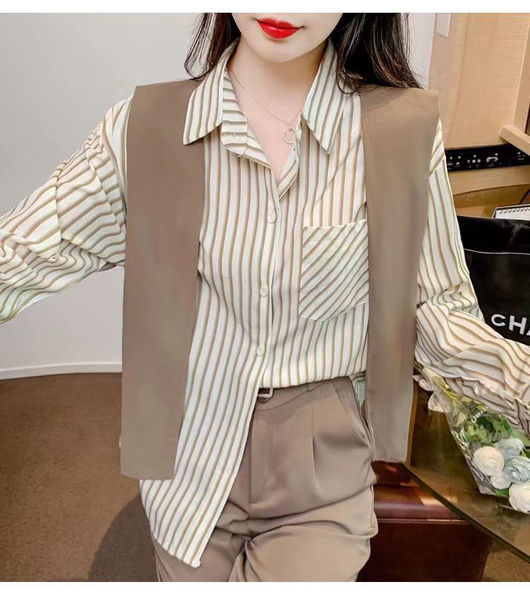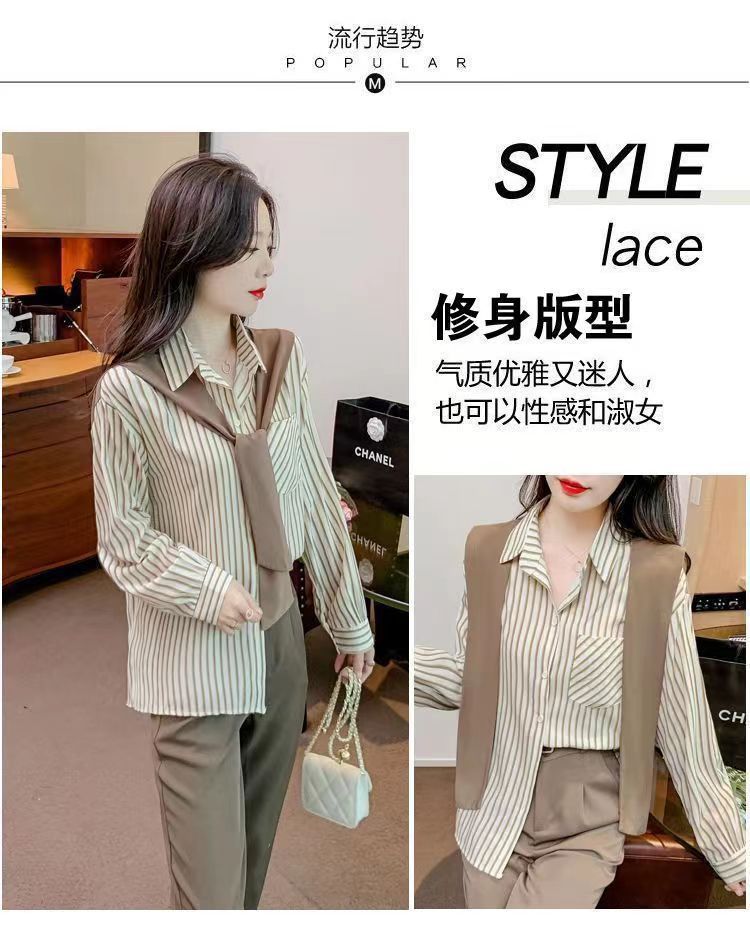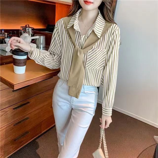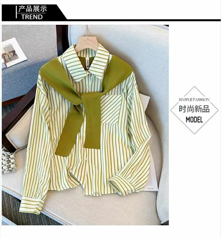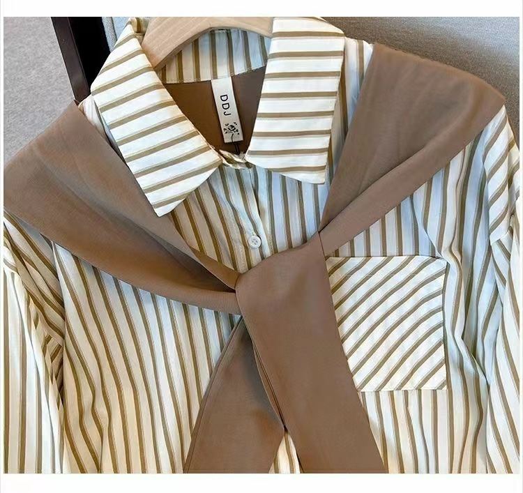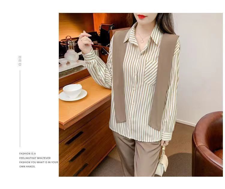 Поддельная двухсекционная рубашка в Вертикальную Полоску для женщин 2023 осень новая шаль с длинным рукавом свободный дизайн для похудения Топ Мода