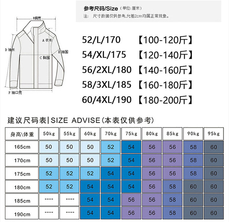 50( 40-50kg ); 52( 50-60kg ); 54( 60-70kg ); 56( 70-80kg ); 58( 80-90kg ); 60( 90-100kg )