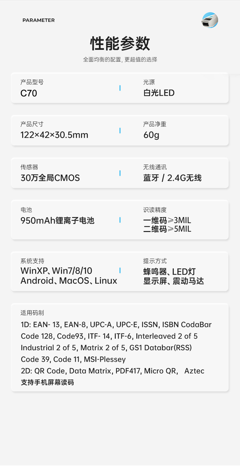 C 70m белый (модель Bluetooth/поддерживает одномерный двухмерный); C70 синий (модель Bluetooth/поддерживает одномерный и двухмерный); C70 желтый (модель Bluetooth/поддерживает одномерный и двухмерный); C70 полностью белый (требуется настройка, отсутствует в наличии/модель с Bluetooth/поддерживает одно- и двумерные сканирования); C70 полностью черный (требуется настройка, отсутствует в наличии/модель с Bluetooth/поддерживает одно- и двумерные сканирования); C 70m модель ремешка с белым поясом (модель Bluetooth/поддержка одномерного двухмерного); Синяя модель ремешка C70 (модель Bluetooth/поддержка одномерного двухмерного); Модель ремешка желтого цвета C70 (модель Bluetooth/поддержка одномерного двухмерного цвета); C70 полностью белый с шнурком (модель Bluetooth/поддерживает одно- и двумерные форматы); C70 полностью черный с ремешком (модель Bluetooth/поддерживает одно- и двумерные форматы); M2D (проект Bluetooth-модель/поддерживает одно- и двумерные сканирования/поставляется с защитным чехлом)