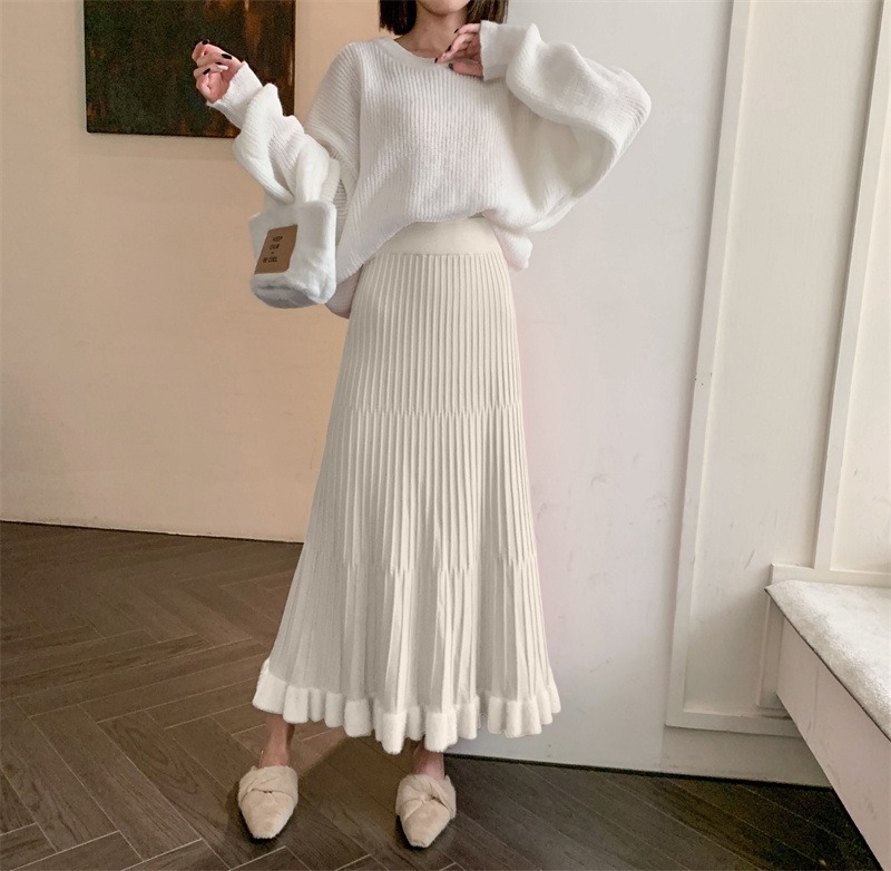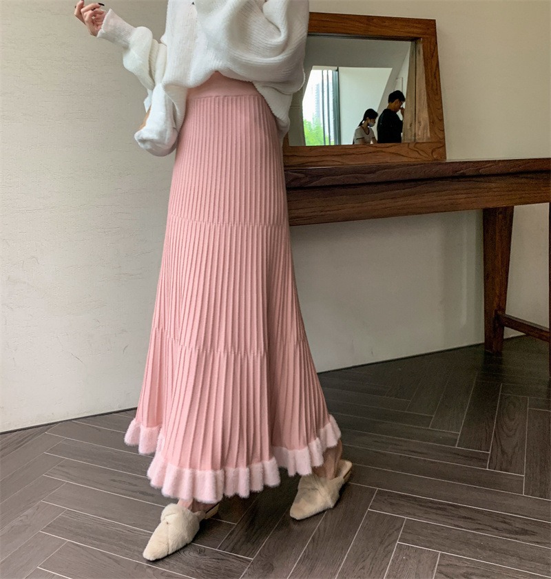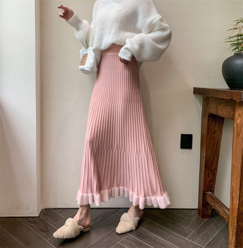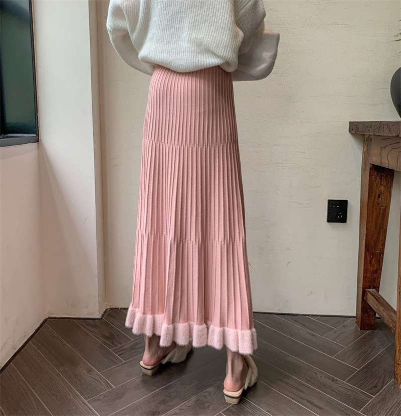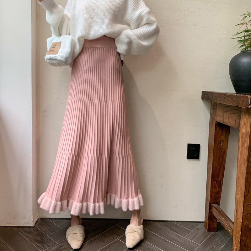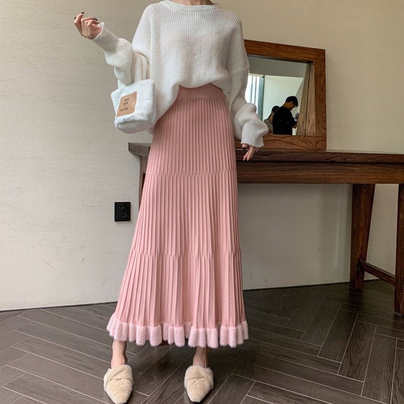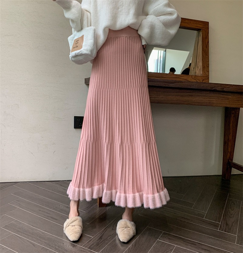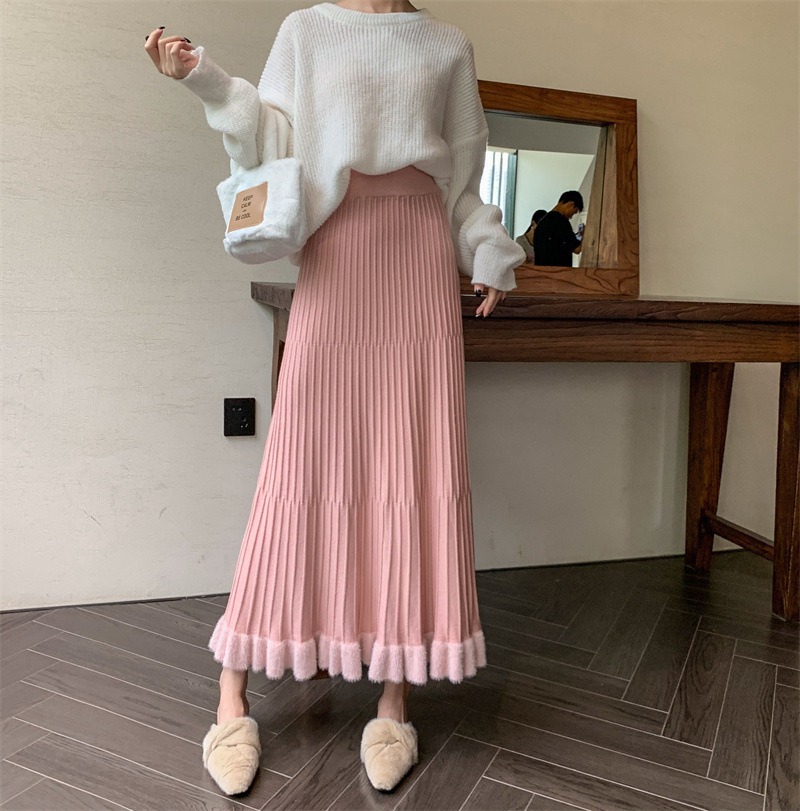 Новая осенне-зимняя юбка в корейском стиле с отделкой из искусственного меха, трикотажная, средней длины, свободного кроя, стройнящая, с высокой талией и плиссировкой.