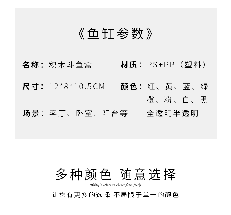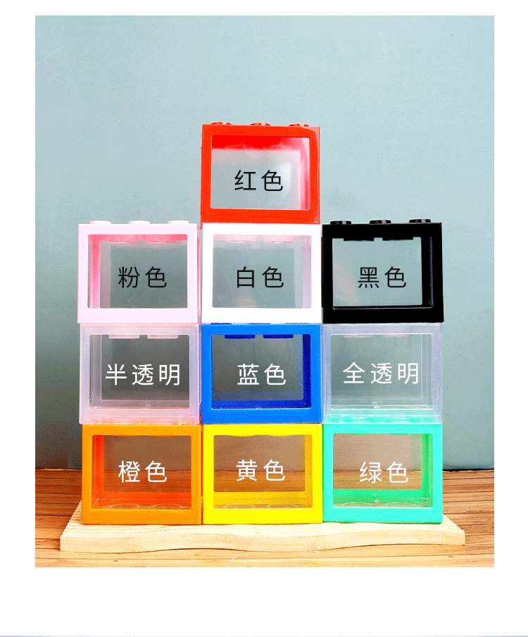 Красная коробка блоков (длина 12cm * ширина 8cm * высота 10.5cm); Черный блок-ящик (длина 12cm * ширина 8cm * высота 10.5cm); Белая коробка блоков (длина 12cm * ширина 8cm * высота 10.5cm); Полупрозрачный блок-ящик (длина 12cm * ширина 8cm * высота 10.5cm); Розовый блок-ящик (длина 12cm * ширина 8cm * высота 10.5cm); Зеленая коробка блоков (длина 12cm * ширина 8cm * высота 10.5cm); Желтая коробка блоков (длина 12cm * ширина 8cm * высота 10.5cm); Оранжевый блок-ящик (длина 12cm * ширина 8cm * высота 10.5cm); Синий блок-ящик (длина 12cm * ширина 8cm * высота 10.5cm); Полная прозрачная коробка блоков (длина 12cm * ширина 8cm * высота 10.5cm)