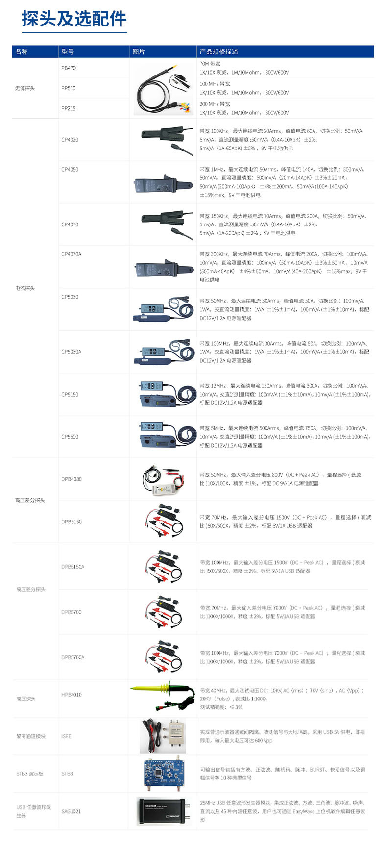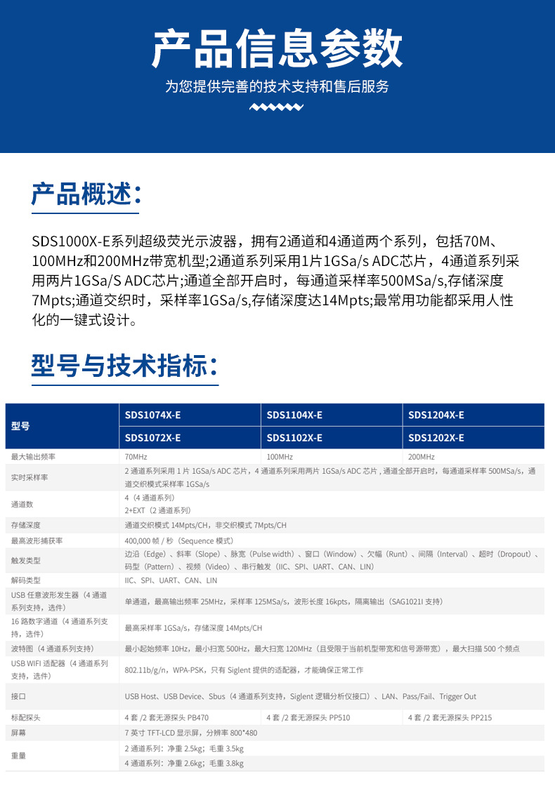 SDS1072X-E (двойной канал 70 м); SDS1102X-E (двойной канал 100 м); SDS1202X-E (двойной канал 200 м); SDS1074X-E(70 м, четыре канала); SDS1104X-E(100 м четыре канала); SDS1204X-E(200 м, четыре канала); CPL5100-current зонд