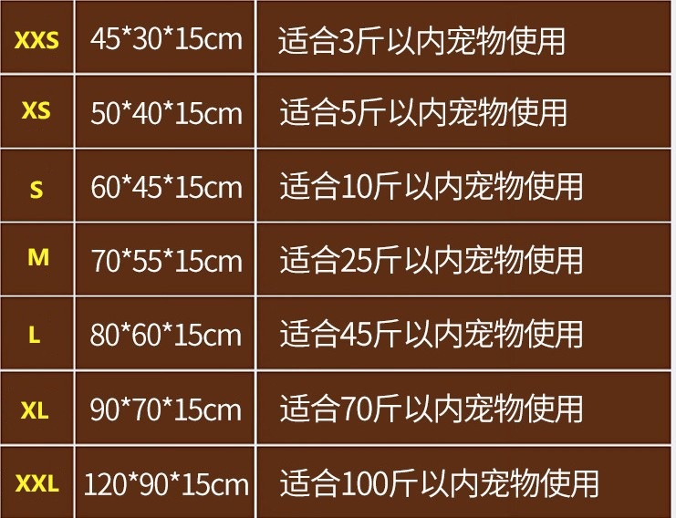 XXS (45*31*15CM); XS(50*38*15CM); S(60*45*15)CM; M(70*50*15)CM; L(80*60*15CM); XL(90*70*15CM)