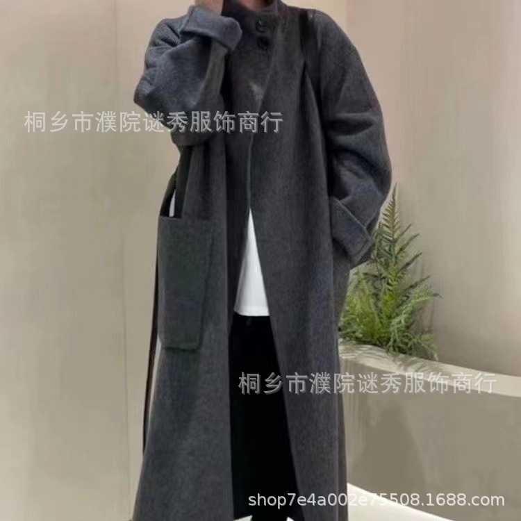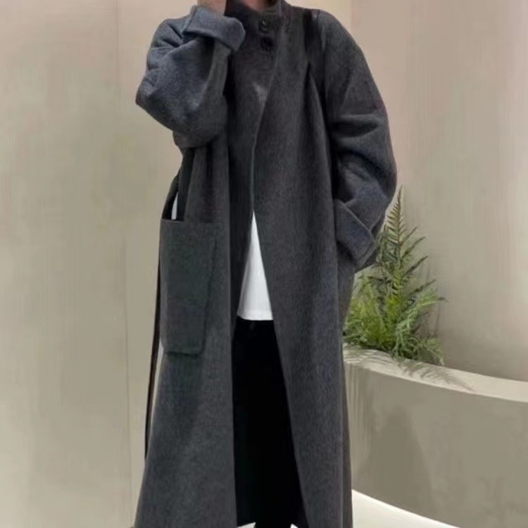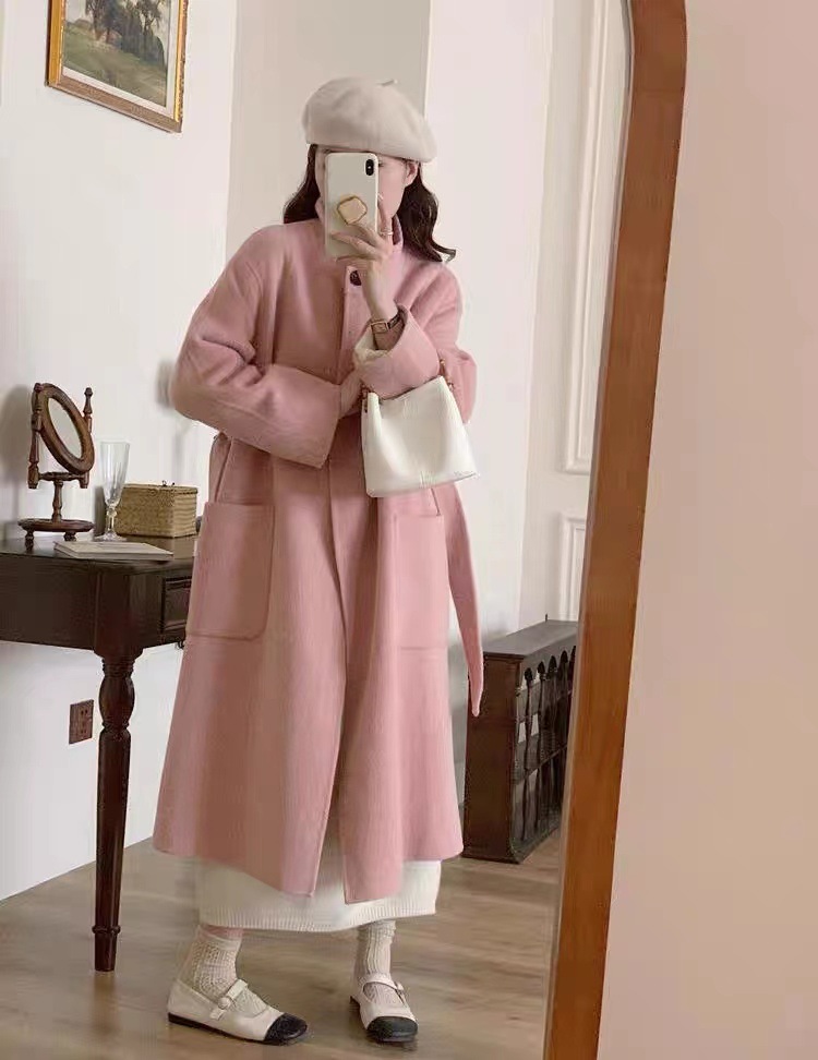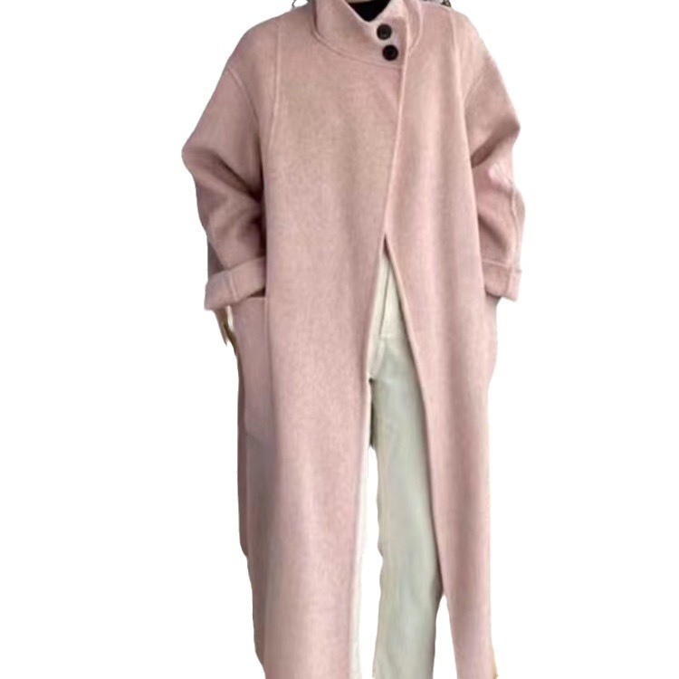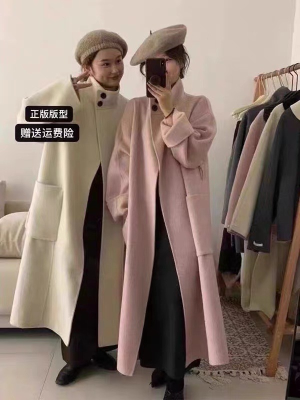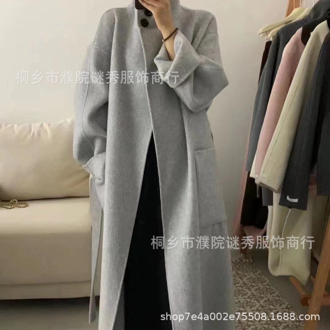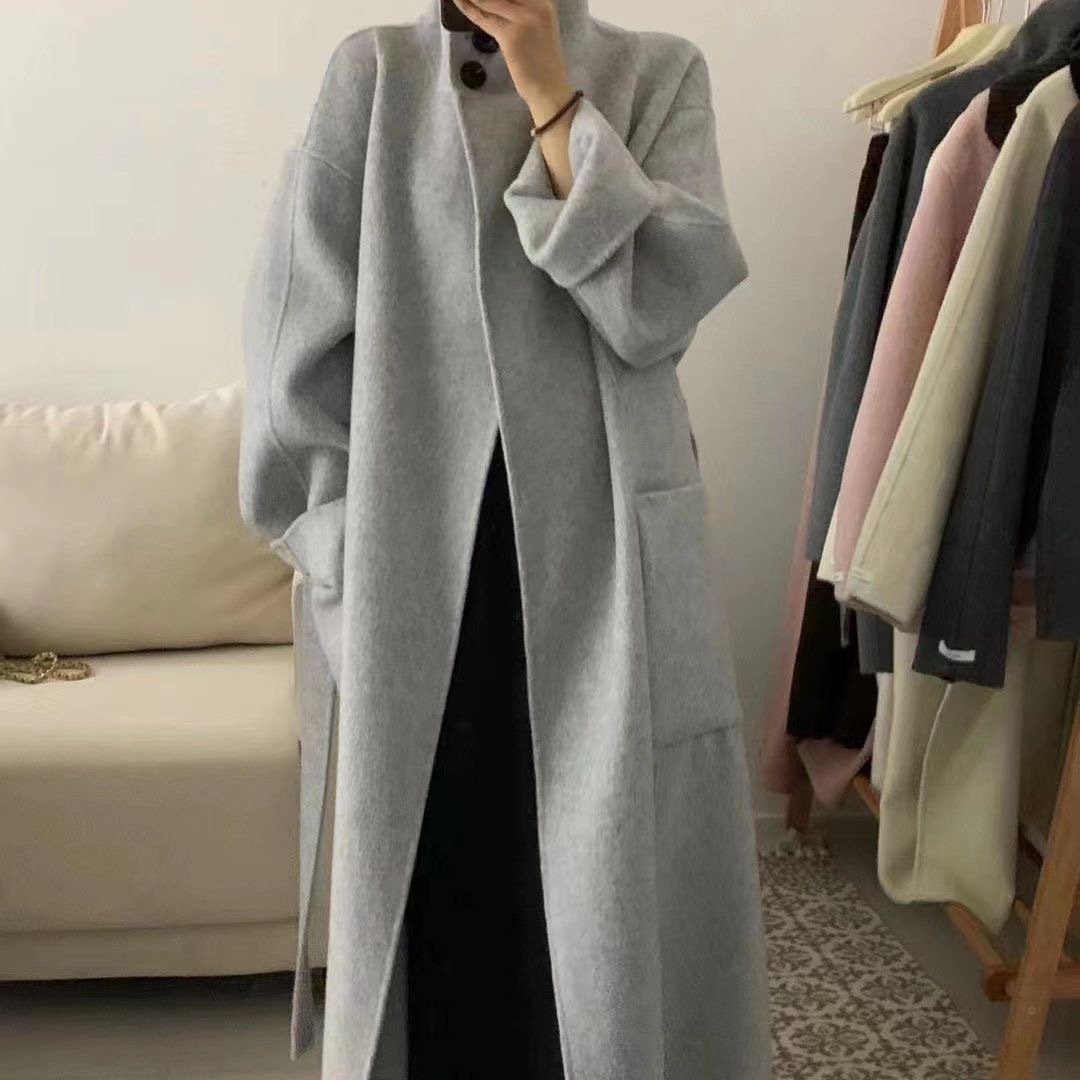 Двустороннее кашемировое пальто для женщин, средней длины, с воротником-стойкой, в стиле Хепберн, свободного кроя, миниатюрное шерстяное пальто, элегантный стиль.