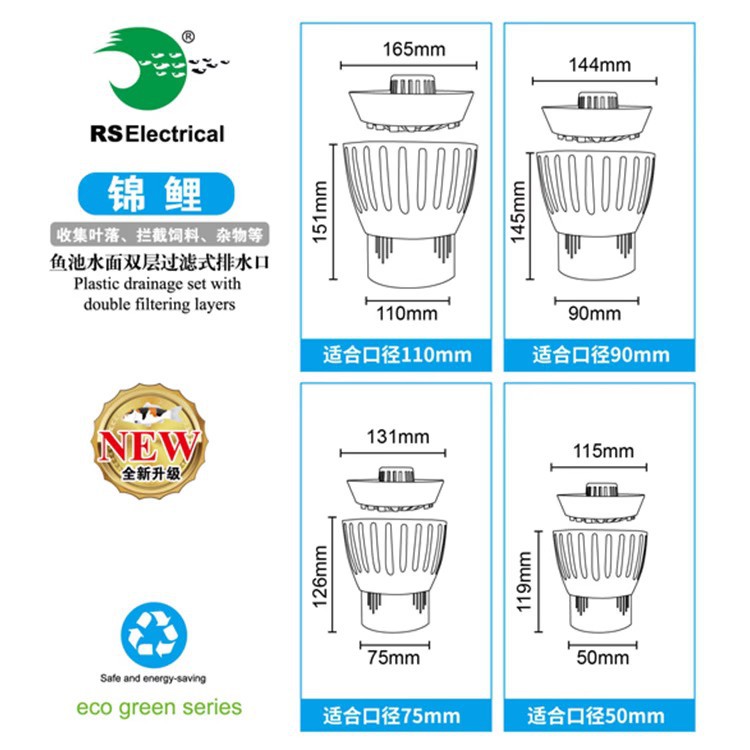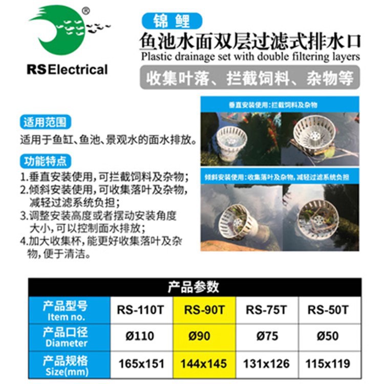 RS-50T дренажный фильтр T(161 г); RS-75T сливной фильтр (220 г); RS-90T сливной фильтр (276 г); RS-110T слив фильтра (354G); FISH-50(50 Калибр) двойной фильтр слива/3 регулировки; FISH-75(75 калибр) двойной фильтр слива/3 регулировки; FISH-90(90 калибр) двойной фильтр слива/3 регулировки; FISH-110(110 калибр) двухслойный фильтр слива/3-ступенчатая регулировка
