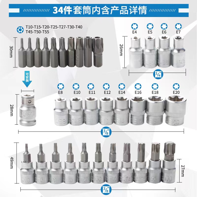 34件套压批套筒组合英制E型套筒批头组套汽修工具套筒扳手套装