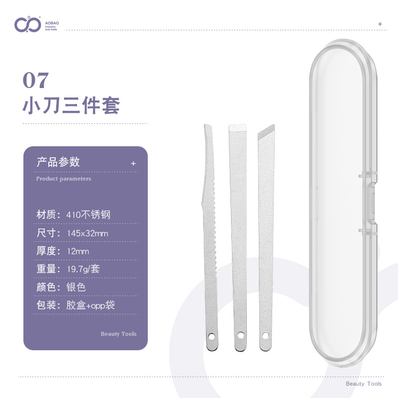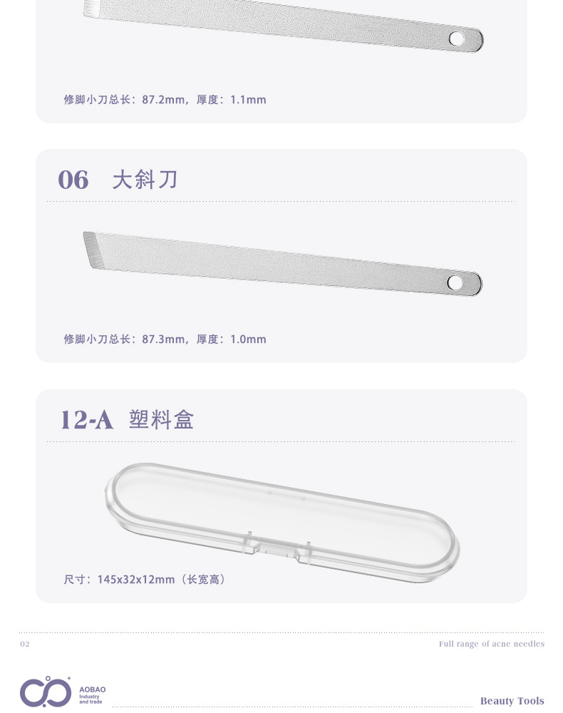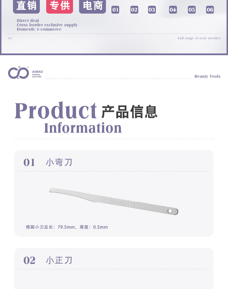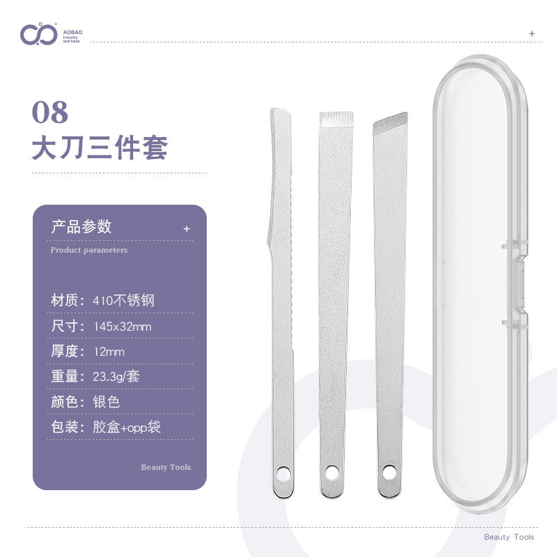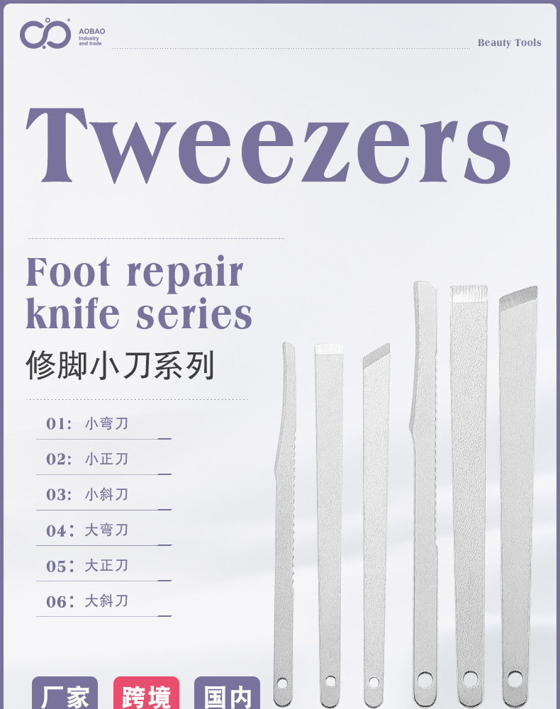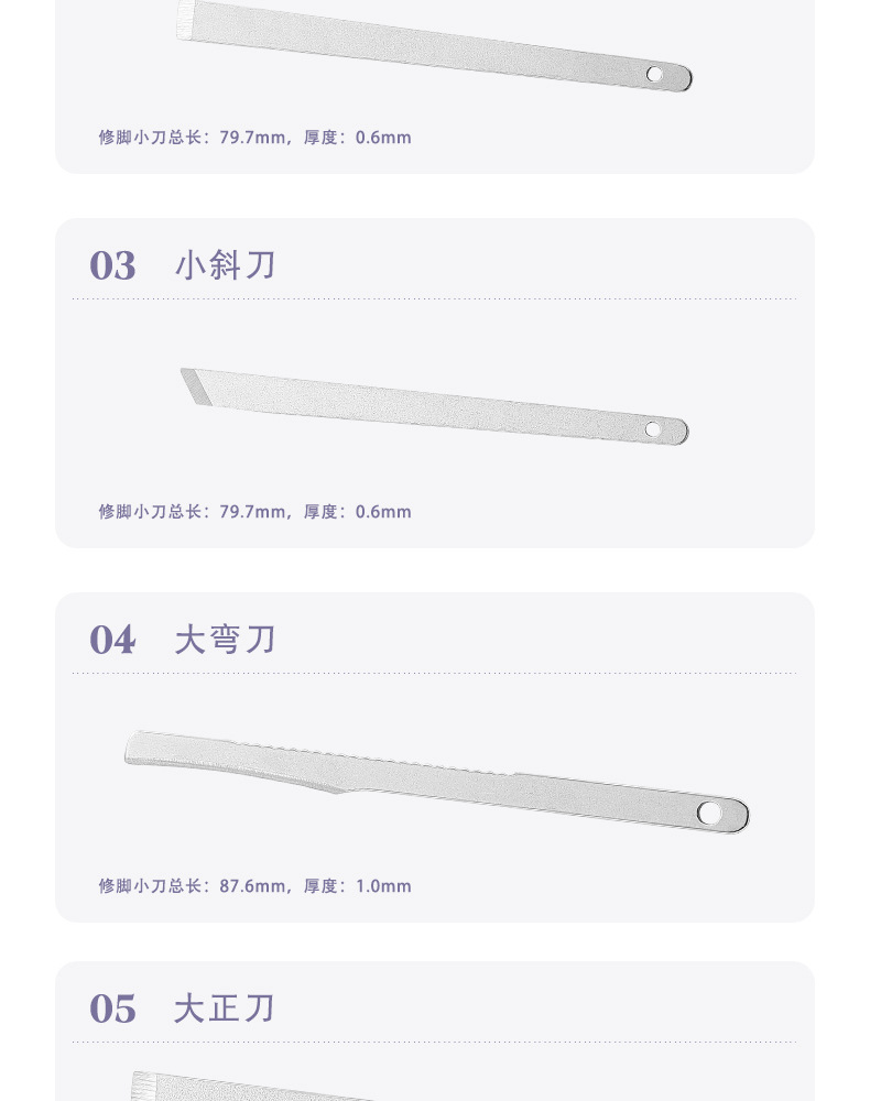 Маленький мачете; Маленький Чжэндао; Маленький наклонный нож; Большой ятаган; Даженг нож; Большой наклонный нож; Комплект педикюра из трех частей (маленький); Комплекты педикюра из трех частей (большой)