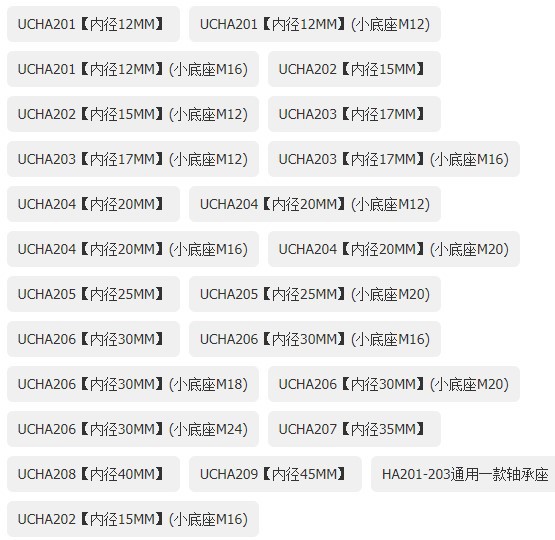 Может сочетаться с необслуживаемых подшипников, шестигранных подшипников и подшипников из нержавеющей стали, пожалуйста, свяжитесь со службой поддержки клиентов; UCHA201 [Внутренний диаметр 12] M12/M16; UCHA202 [Внутренний диаметр 15] M12/M16; UCHA203 [внутренний диаметр 17] M12/M16; UCHA204 [Внутренний диаметр 20] M12/M16/20M; UCHA205 [Внутренний диаметр 25] M16/M20; UCHA206 [Внутренний диаметр 30] M16/M18/M20/M24; UCHA207 [внутренний диаметр 35 мм]; UCHA208 [внутренний диаметр 40 мм]; UCHA209 [Внутренний диаметр 45 мм]; UCHA210 [Внутренний диаметр 50 мм]; Отверстие для винта различные дополнительные, консультации со службой поддержки клиентов