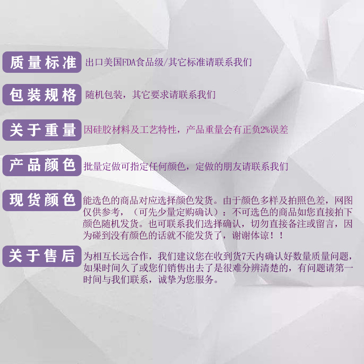 产品特点:产品采用食品级硅胶,具有高温稳定性、容易清洗、使用时间长、柔软、颜色多样、、电绝缘性好、耐侯性、导热性、抗辐射性。