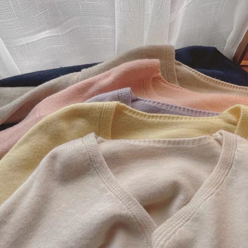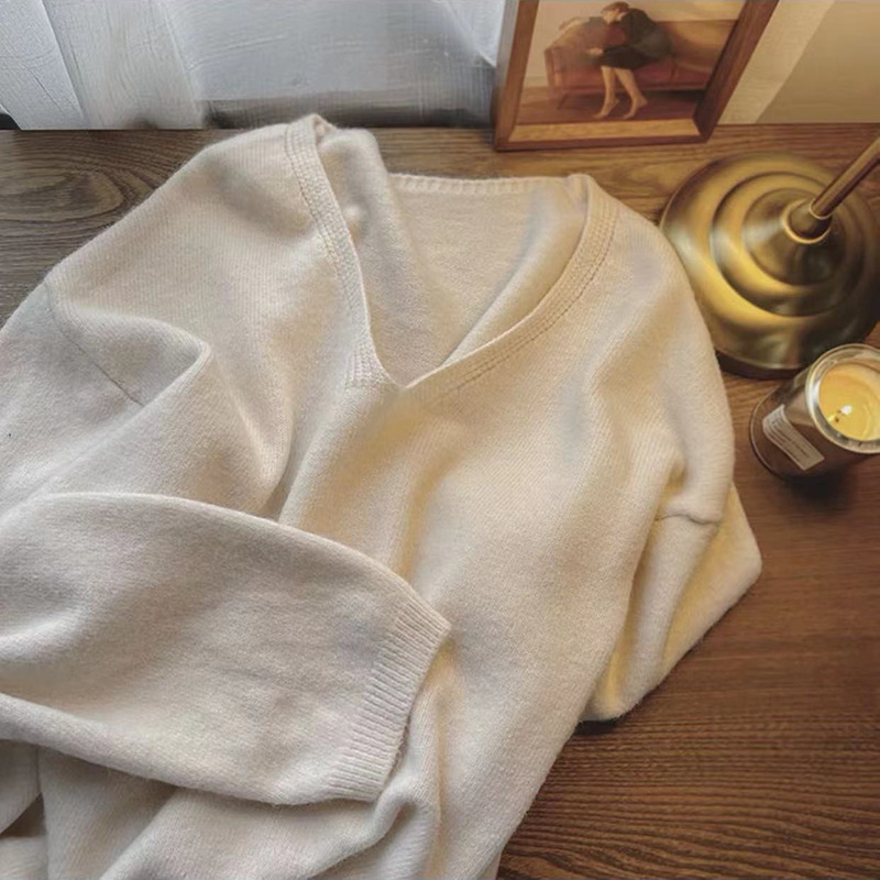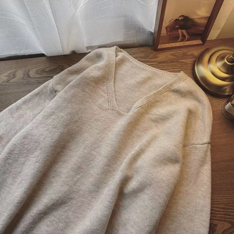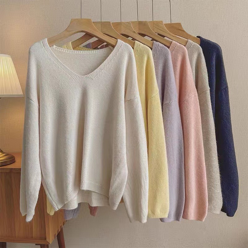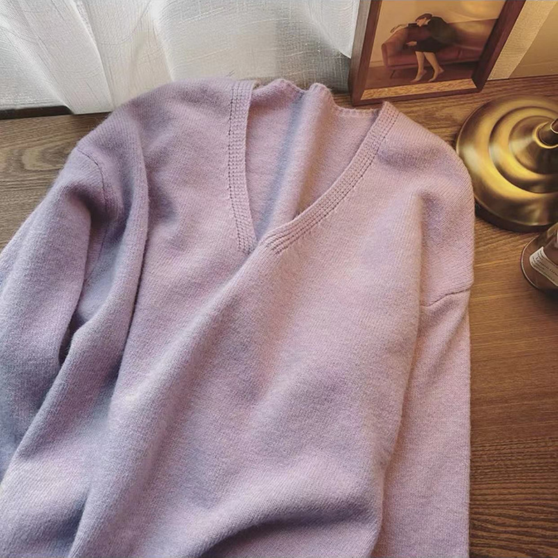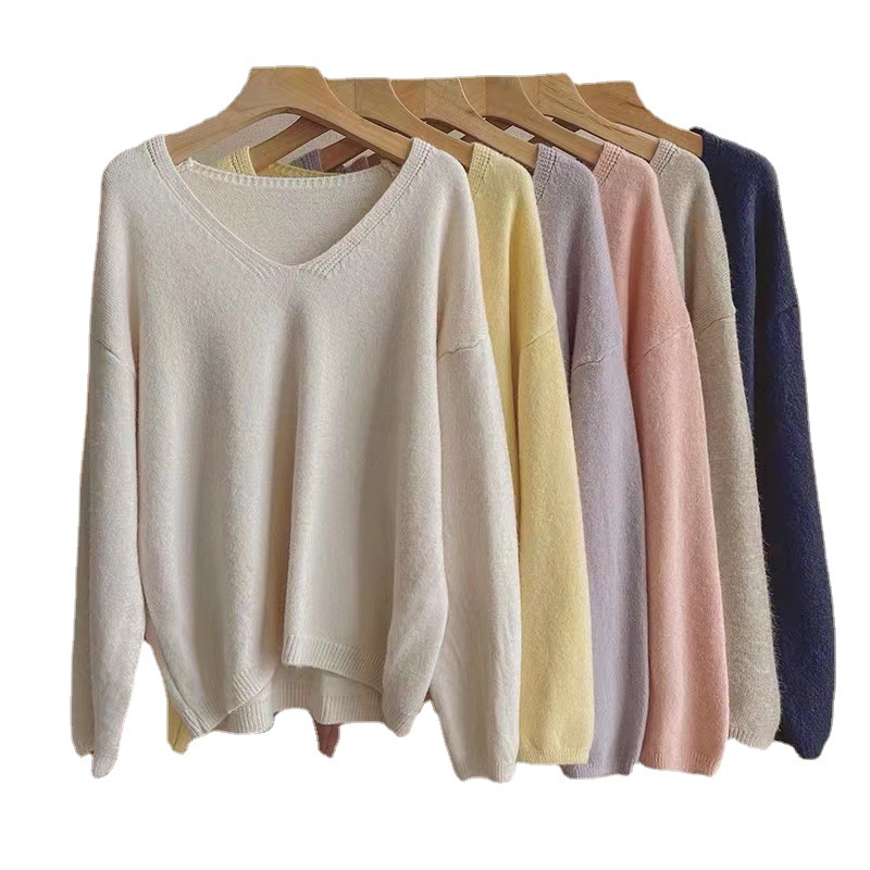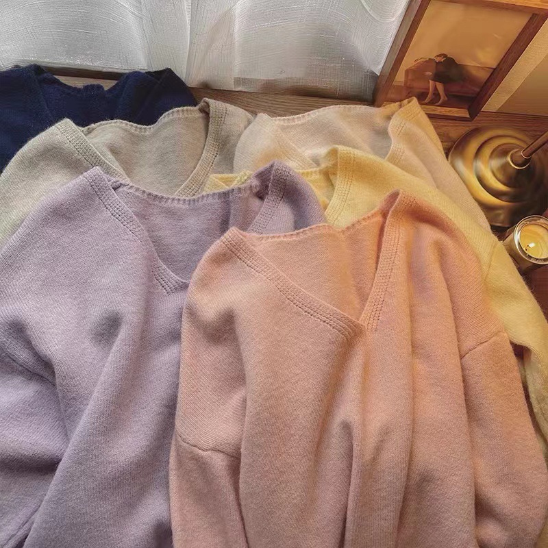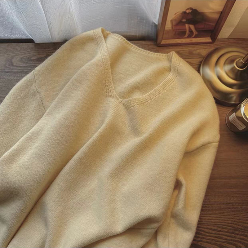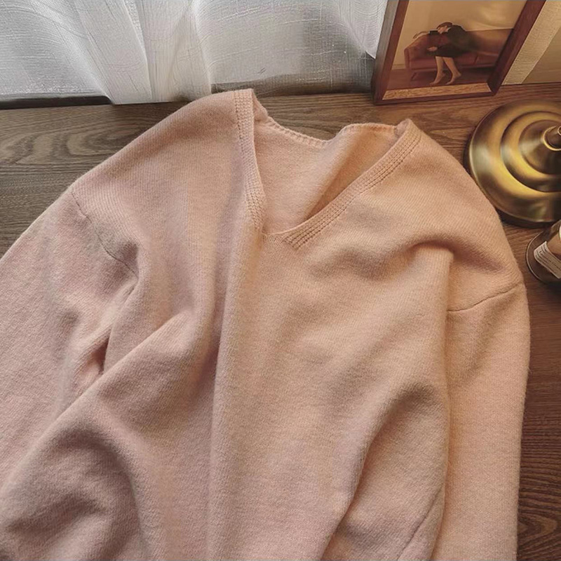 Женский трикотажный пуловер в корейском стиле с V-образным вырезом, однотонный, осень-зима 2024, новая коллекция, повседневный, простой, свободный, вязаный топ-база