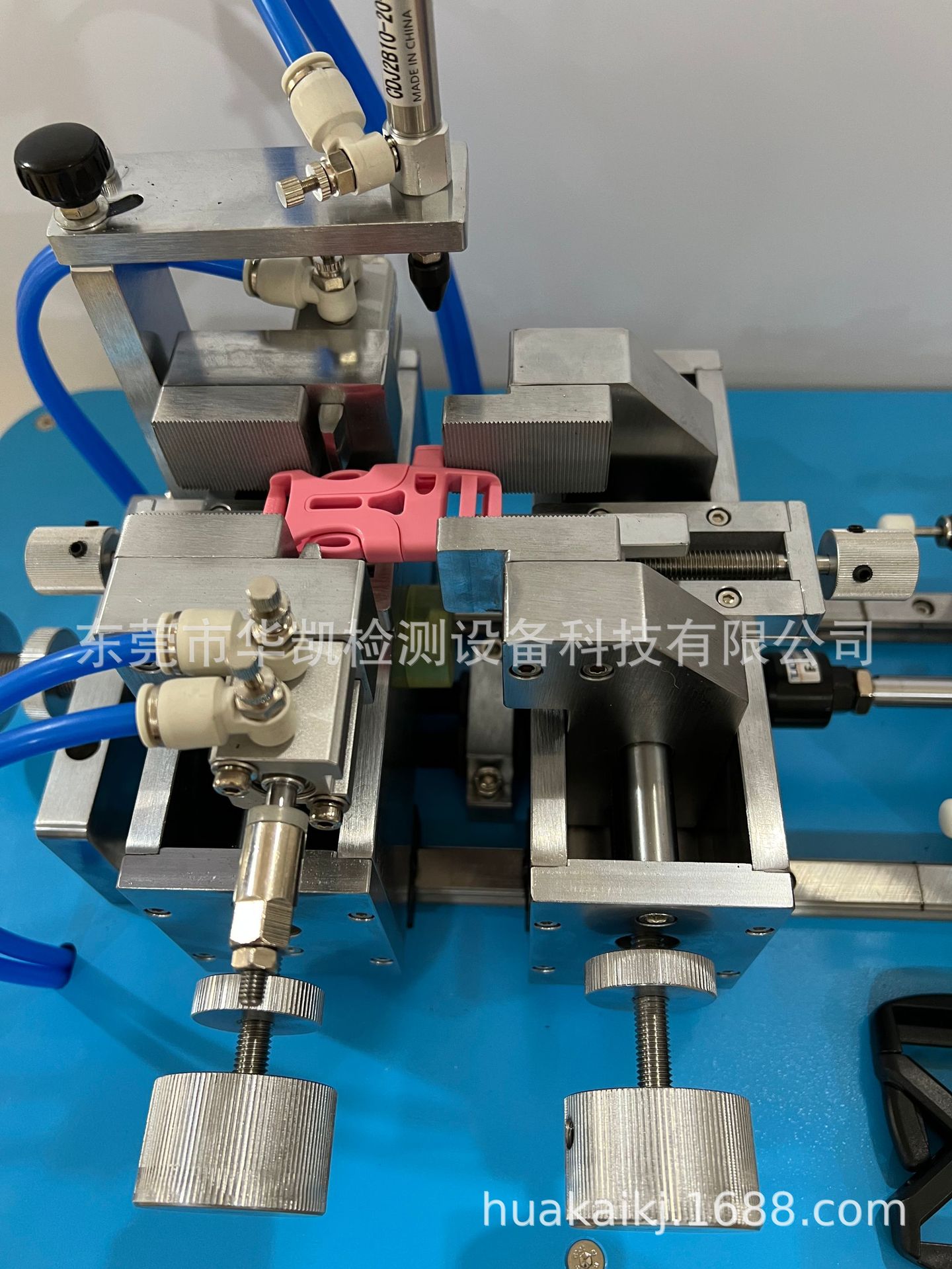 由左右两套试样夹构成,其中左试样夹固定插口的上部件,并可周期性按压插扣的卡位件(左右卡位或者上下卡位):右试样夹相互配合,使插扣的上下部件做水平往复开合运动,运动频率可调节。