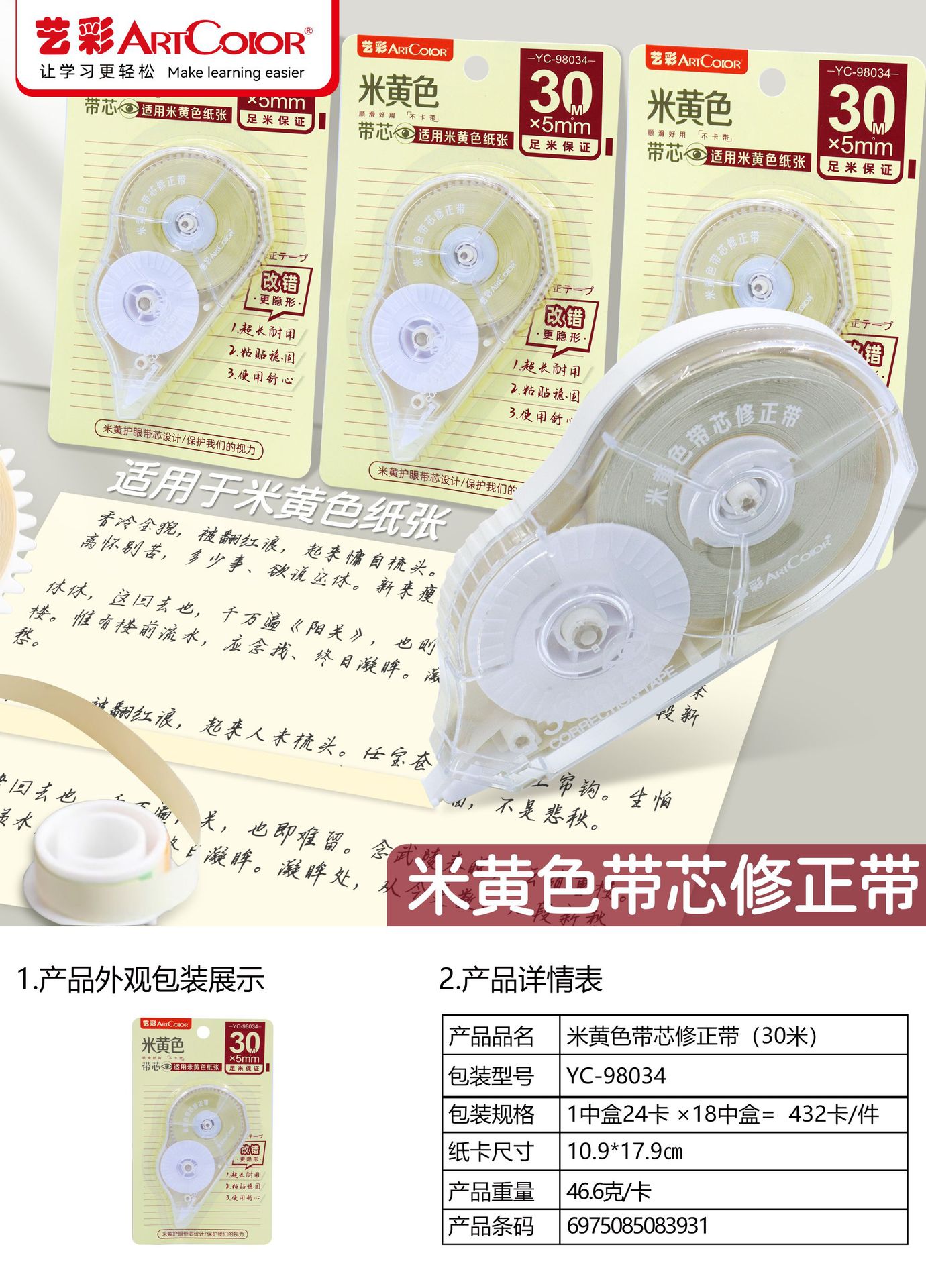 Бежевая Корректирующая лента с сердечником 30 м для учеников начальной школы с лентой непрерывной коррекции большой емкости доступная простая карта
