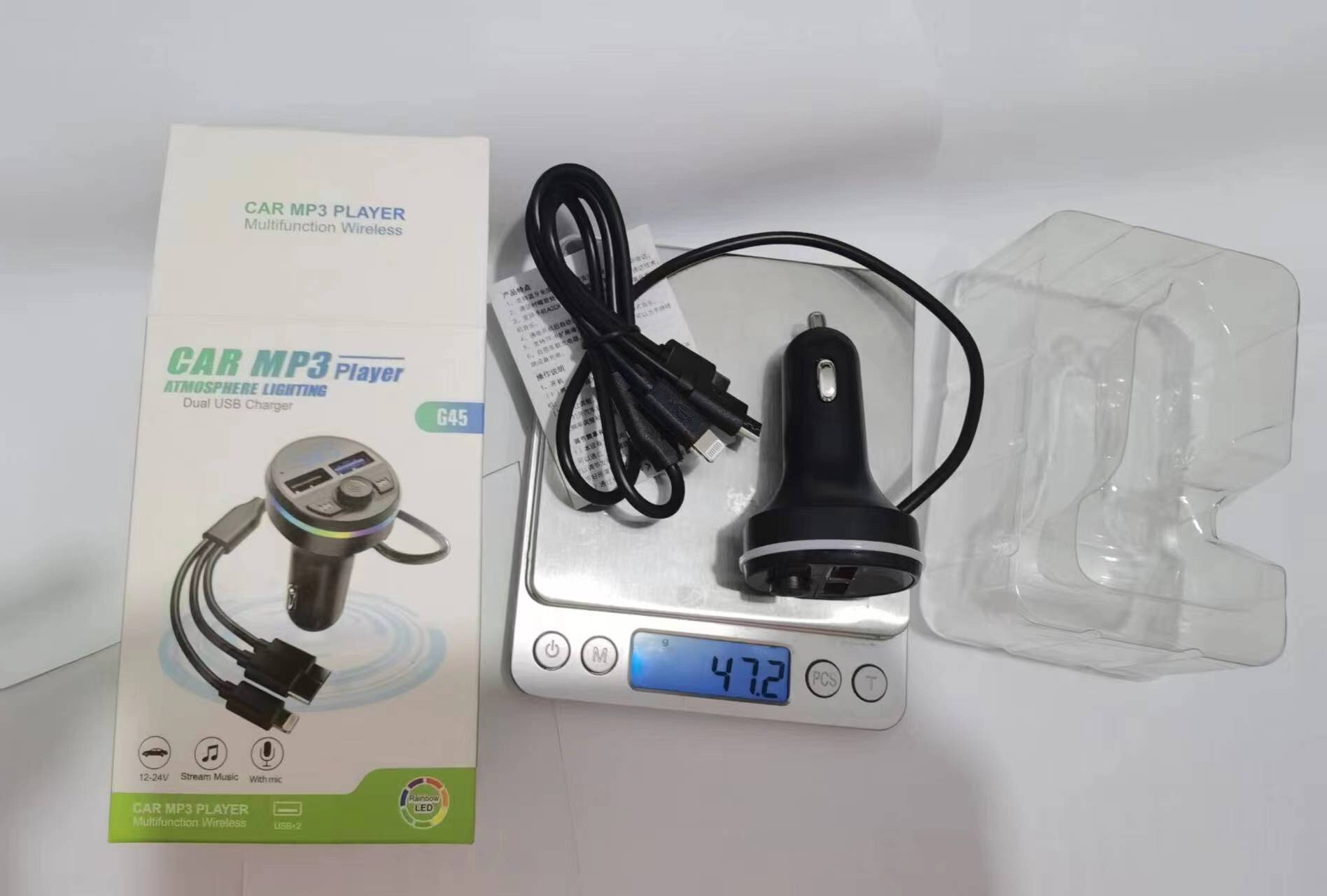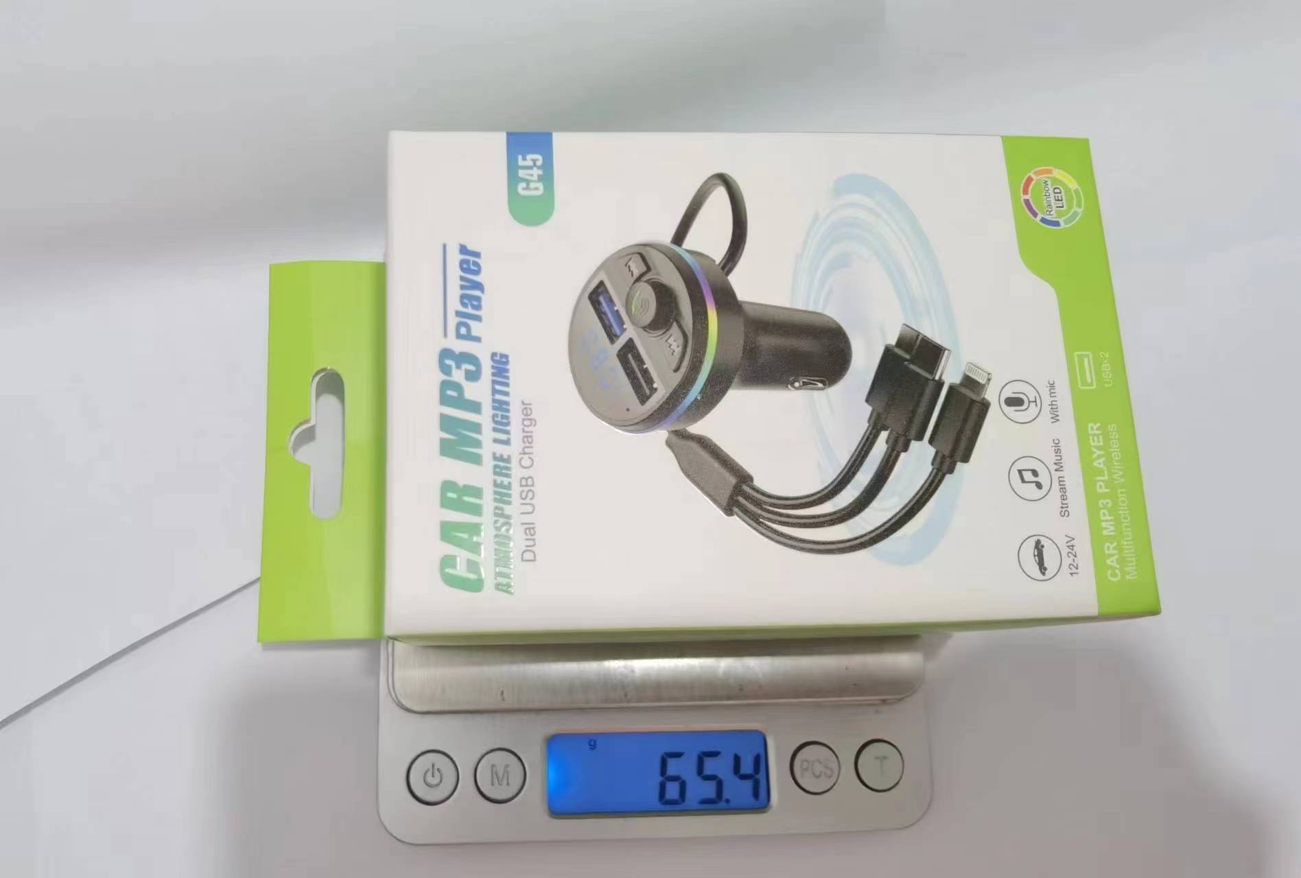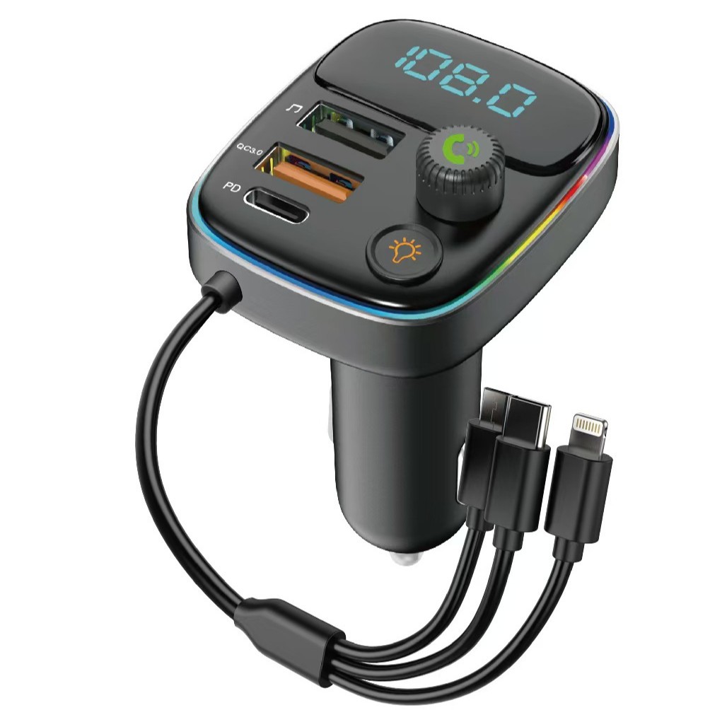 Автомобильный MP3/FM-ресивер G45G46 с Bluetooth, передатчиком, зарядным устройством и кабелем 3-в-1, светодиодной подсветкой (7 цветов)