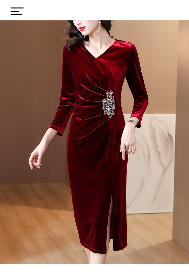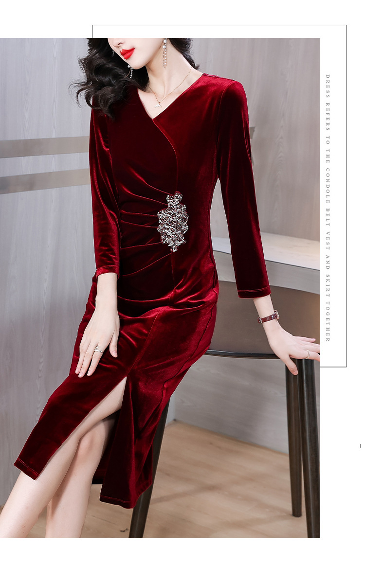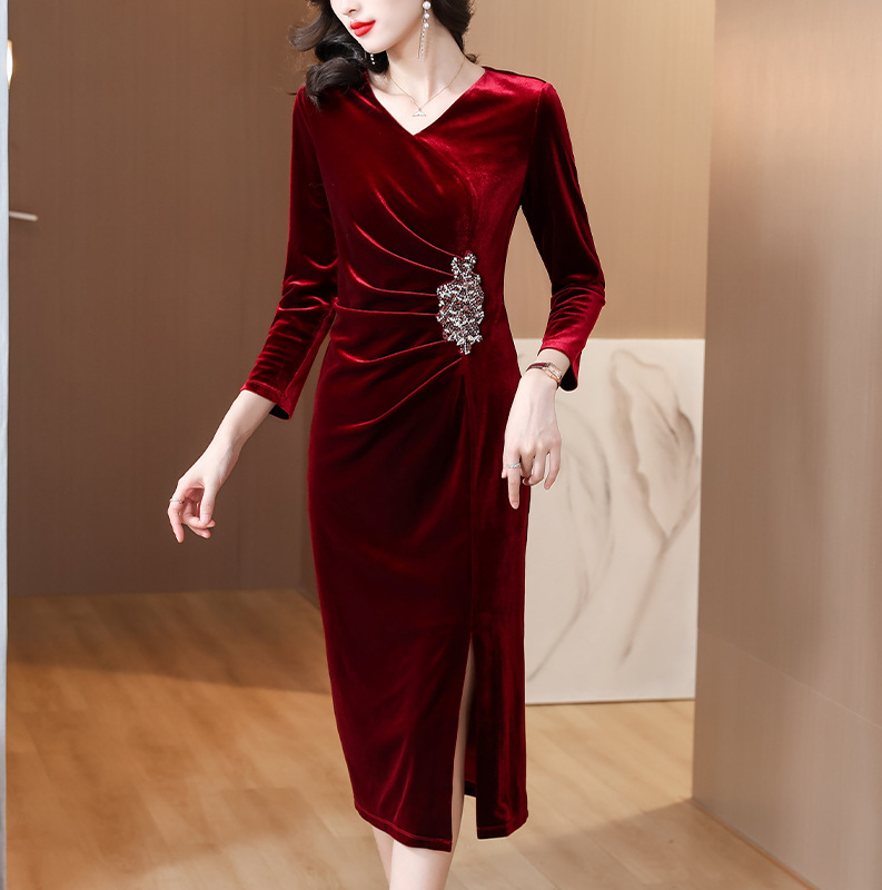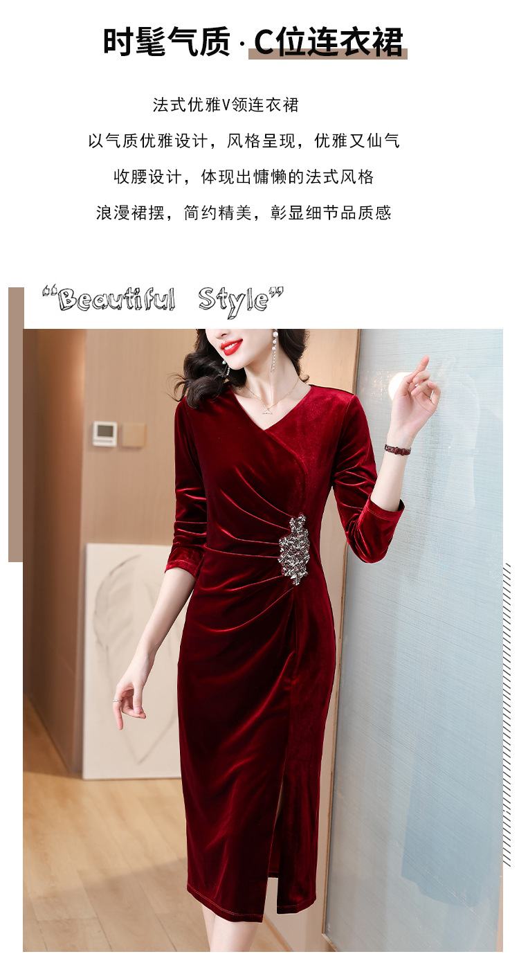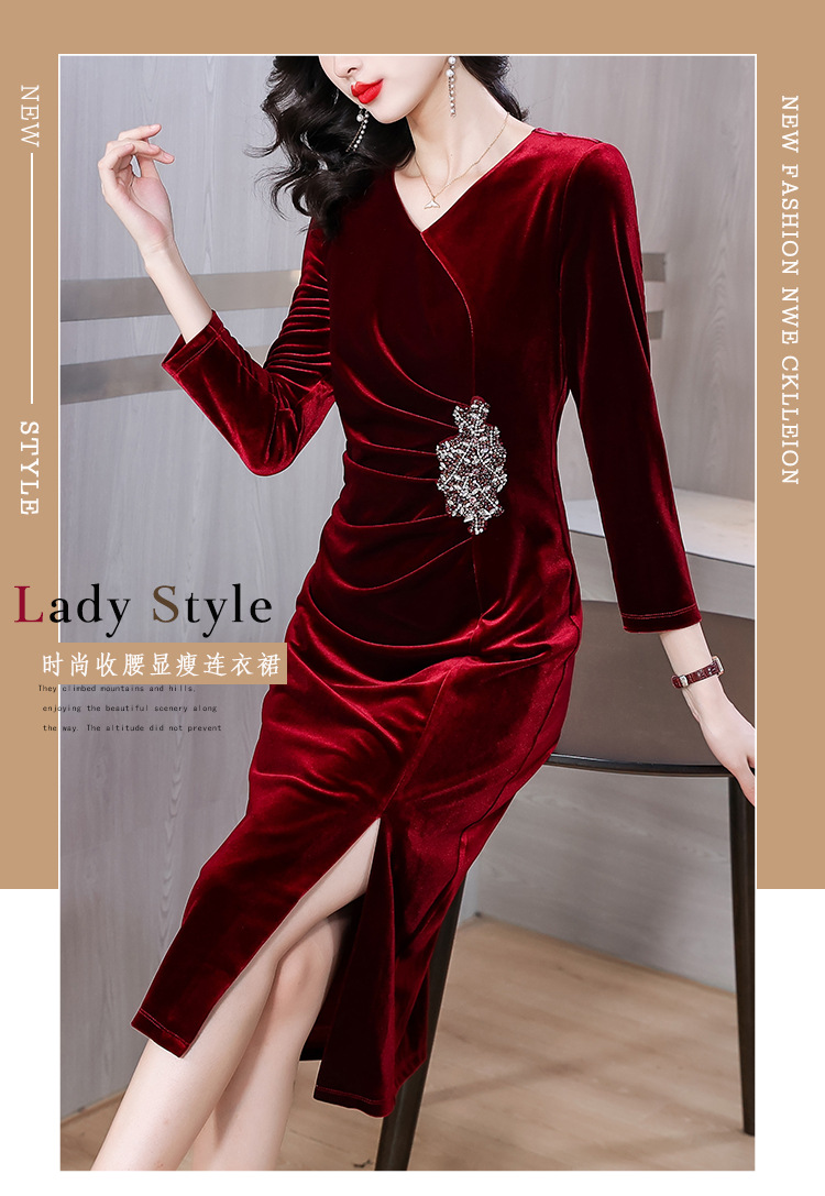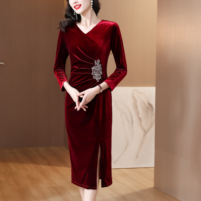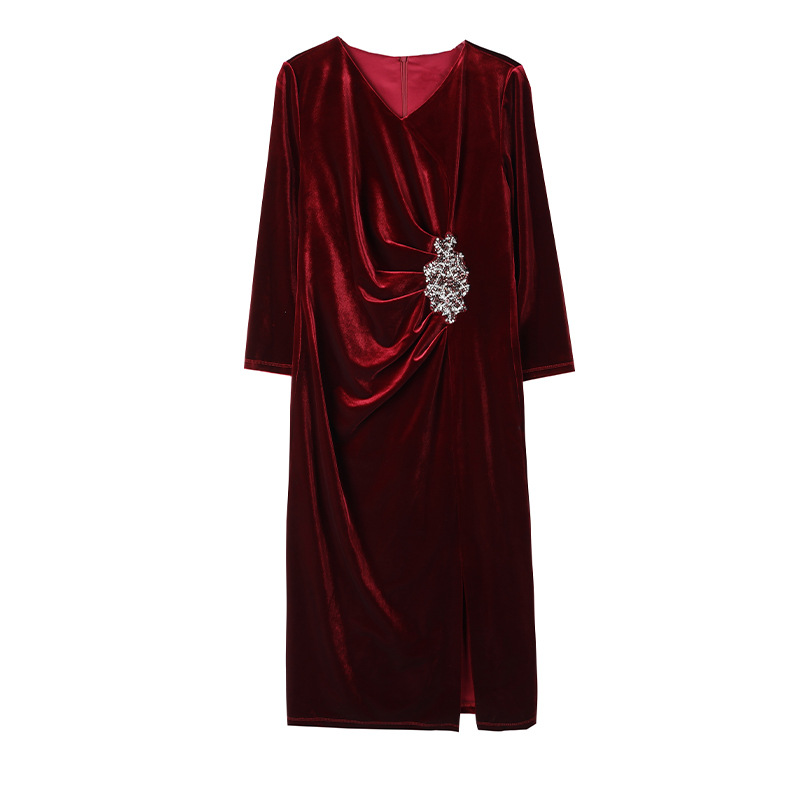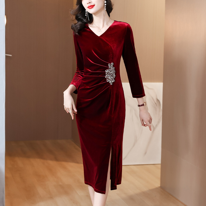 Ретро золотое бархатное платье женское 2023 осень-зима новый высокий темперамент складки